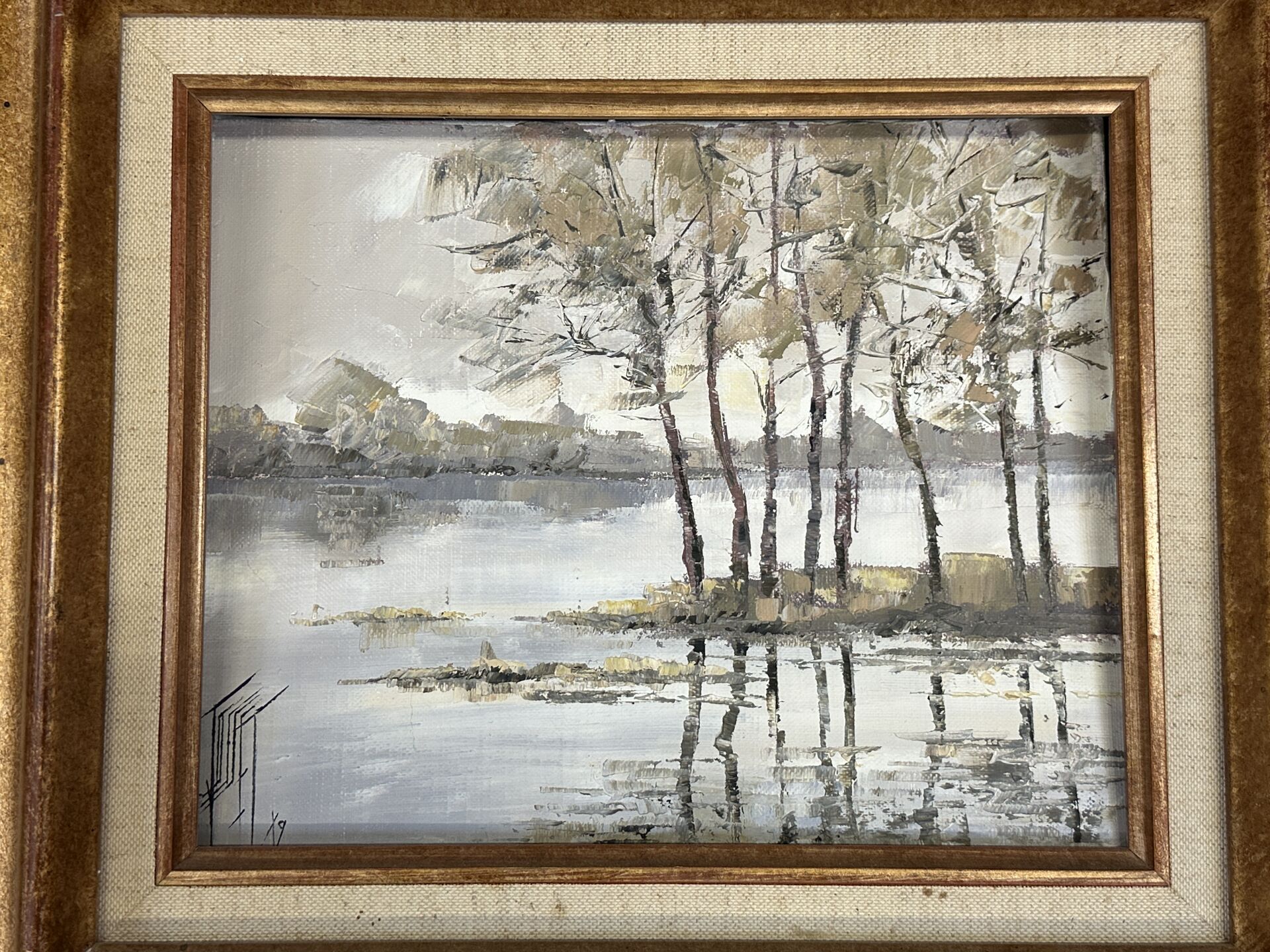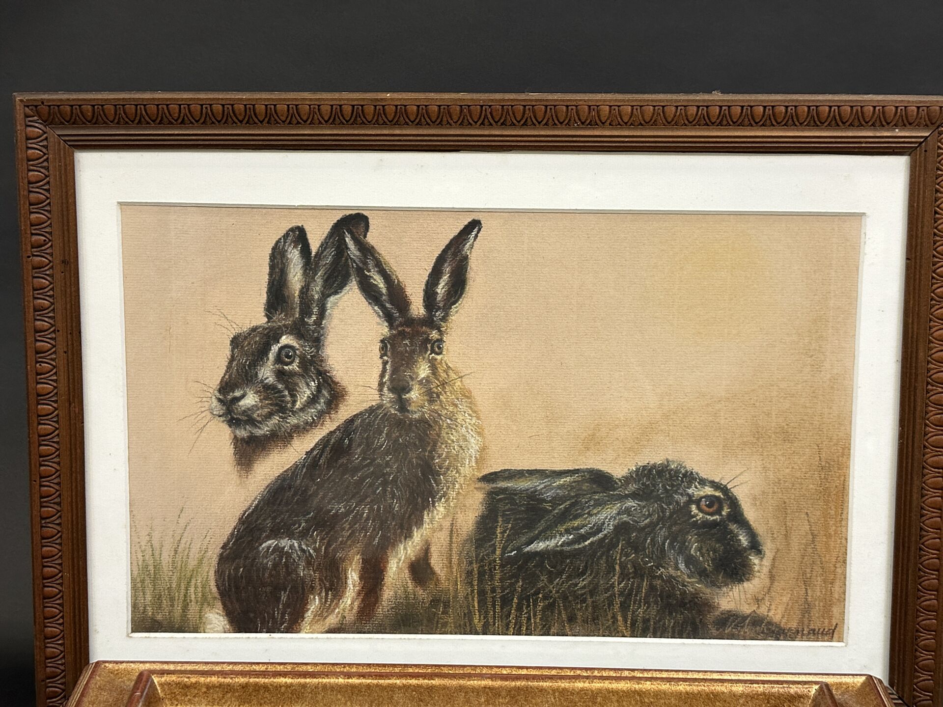Réunion de : - Robert JOSSET (né en 1949). "L'étang". Huile sur toile signée en bas à gauche, contre-signée, titrée et datée 89 au dos. Haut. : 22 cm - Larg. : 27 cm - Noëlle CHAMPARNAUD (XXe-XXIe siècle). Etude de lièvre. Dessin signé en bas à droite. Dim. à vue : Haut. : 23 cm - Larg. : 38,5 cm