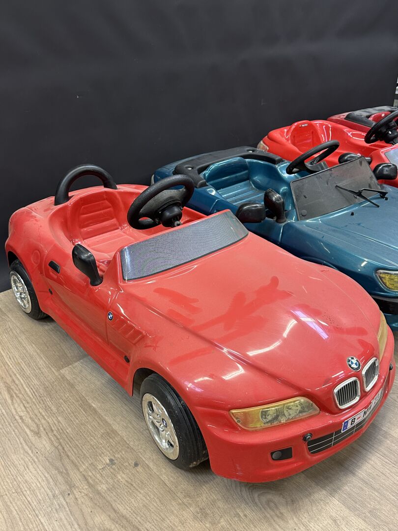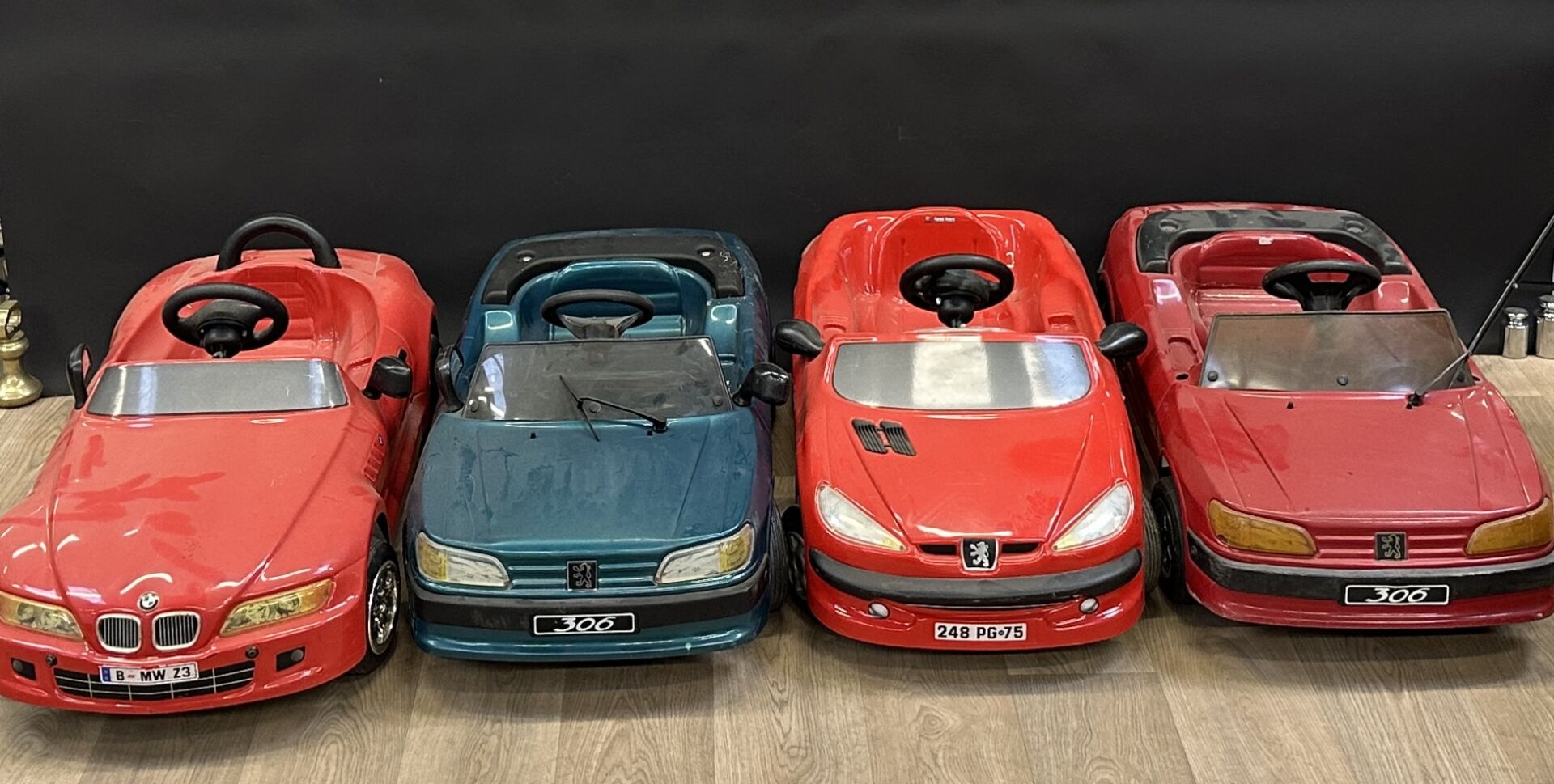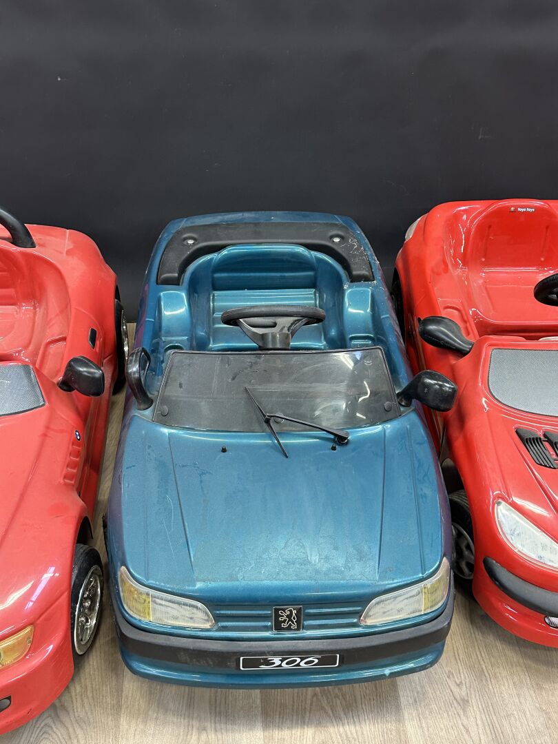 TOYS TOYS Réunion de quatre voitures à pédales en plastique (accidents et manques) : - BMW Z3; - deux Peugeot 306, - Peugeot 206. Long. : environ 1m