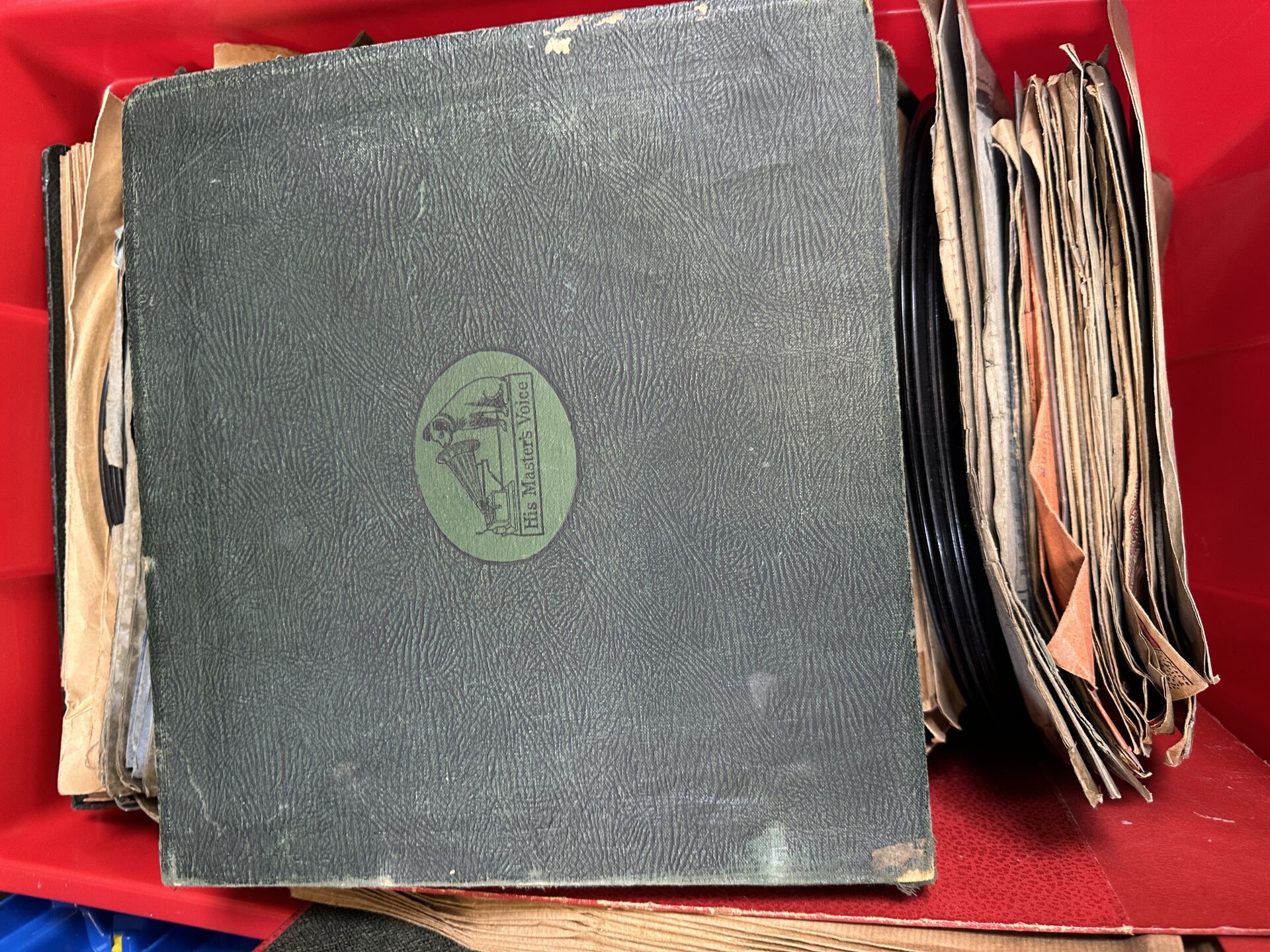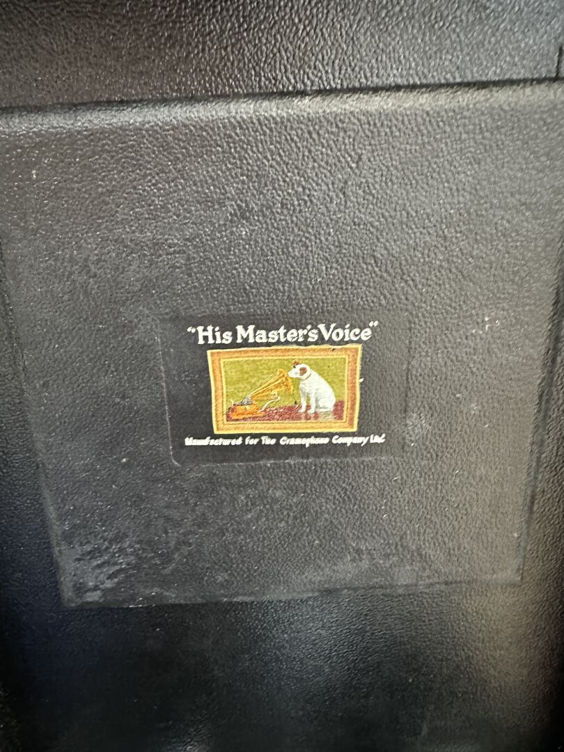 Gramophone "His master's voice" et disques pour gramophone dont PATHE (environ 200, vendus en l'état, accidents). Contenus dans deux caisses - à charge de conditionnement par l'acheteur.