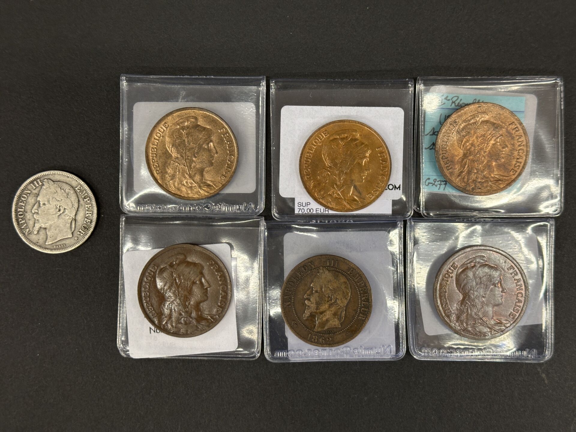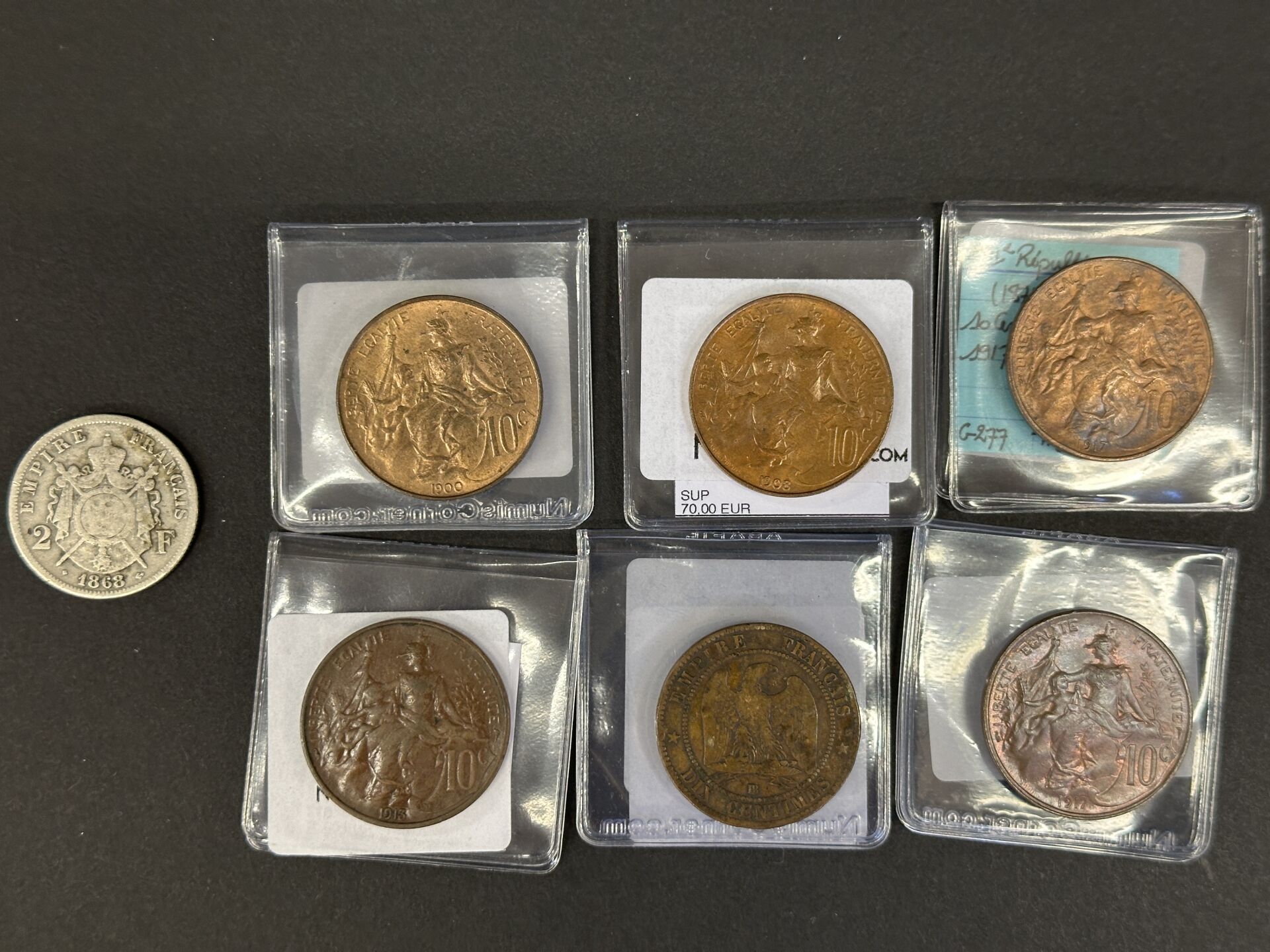 Ensemble de 7 monnaies modernes françaises : - 5 pièces de 10 Centimes Daniel-Dupuis : 1900 (bel exemplaire), 1908, 1913, 1917 x 2 - 1 pièce de 10 Centimes Napoléon III 1862 BB Strasbourg - 1 pièce de 2 Francs en argent Napoléon III 1868 BB Strasbourg