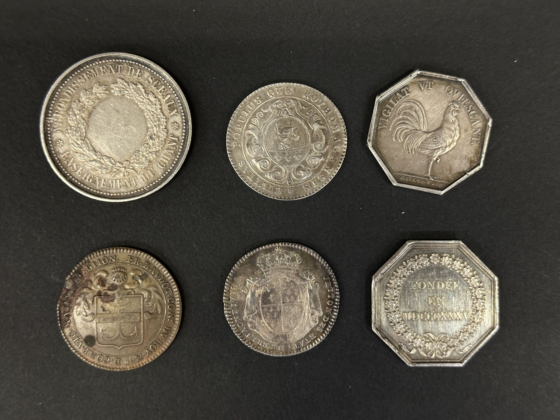 Ensemble de 5 jetons français en argent : Ville de Rouen, Banque de Lyon, Enseignement du Chant, Louis-Philippe Ier, Etats de Bretagne (poids brut : 70,51 g). On y adjoint un jeton en cuivre des maires de Dijon de 1691. Expertise réalisée par le Cabinet SUFFREN NUMISMATIQUE.