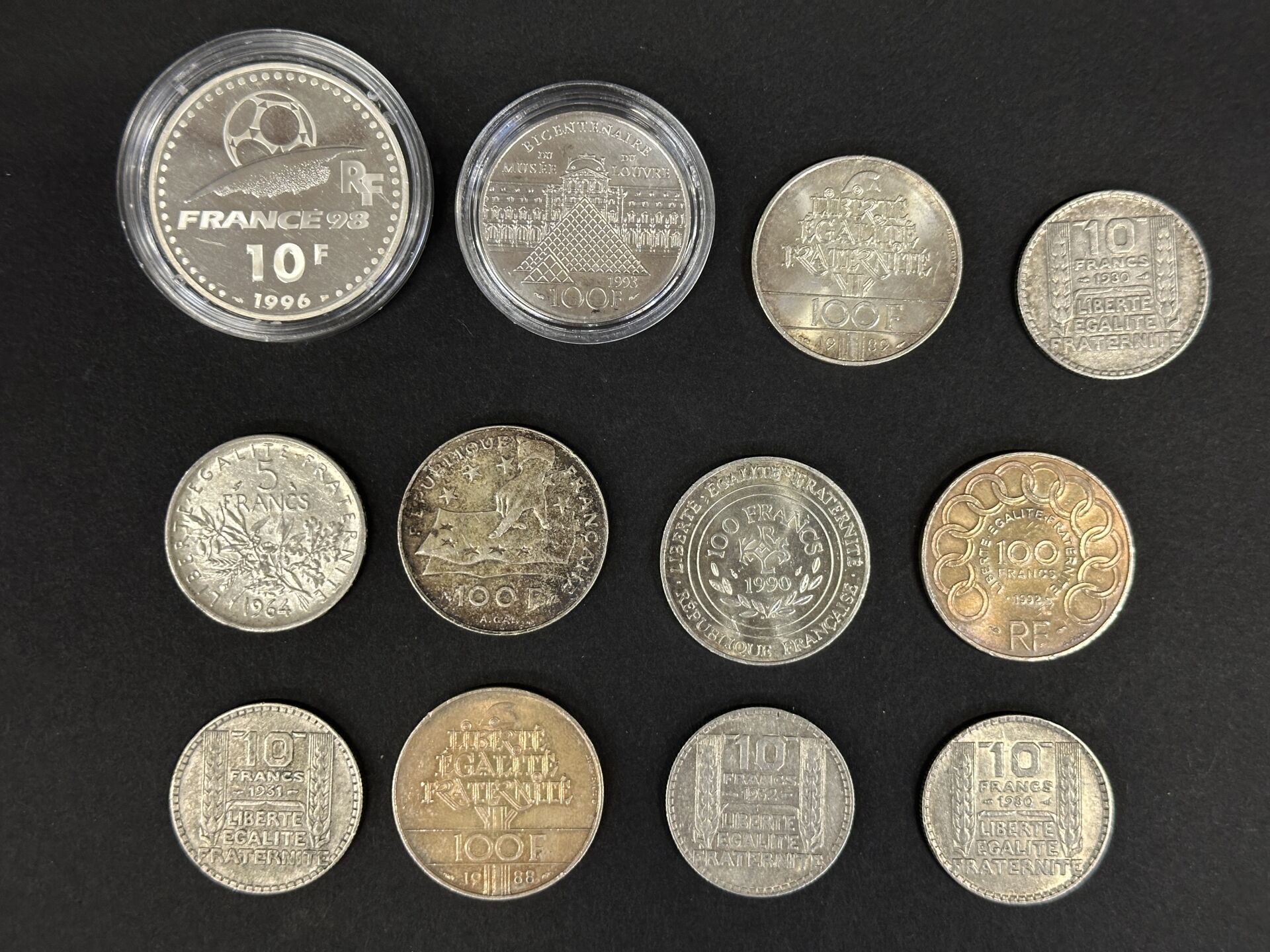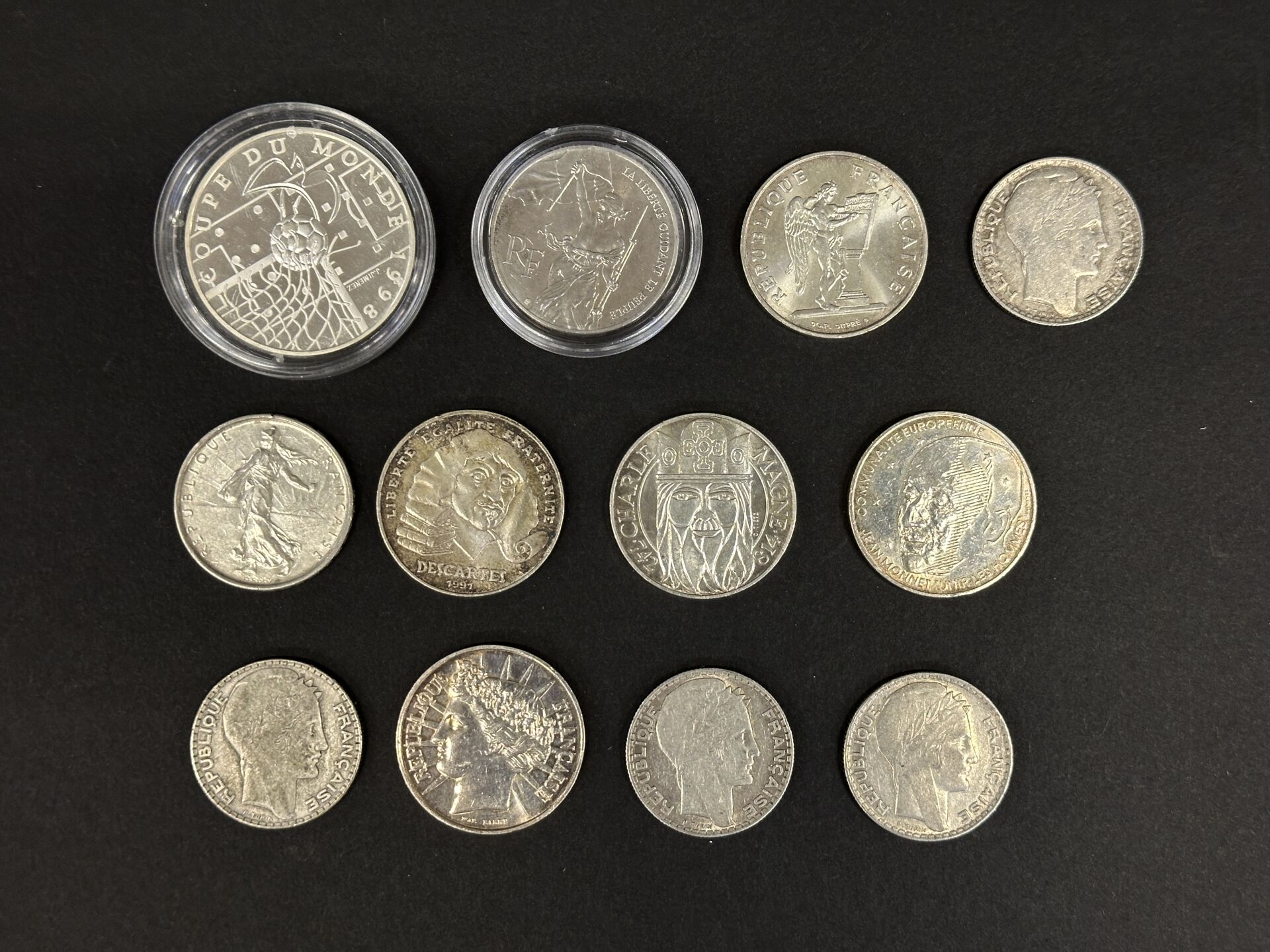 Ensemble de 12 monnaies françaises en argent : - 6 pièces de 100 Francs (Charlemagne, Fraternité, Liberté guidant le peuple, Droits de l'homme, Jean Monnet, Descartes) - 1 pièce de 5 Francs Semeuse 1964 - 4 Pièces de 10 Francs Turin (1930 x 2, 1931, 1932) - 1 pièce de 10 Francs 1996 pour la coupe du monde de Football 1998. Expertise réalisée par le Cabinet SUFFREN NUMISMATIQUE.