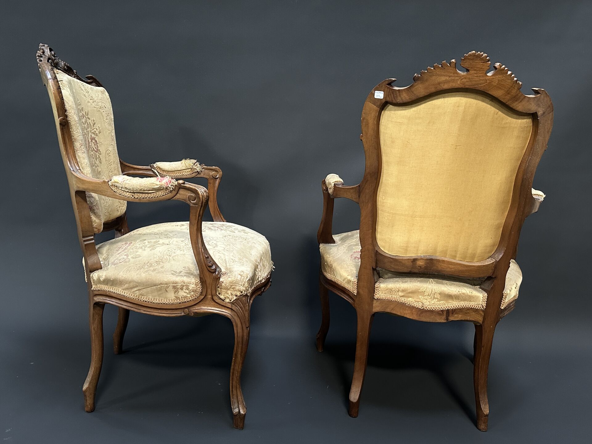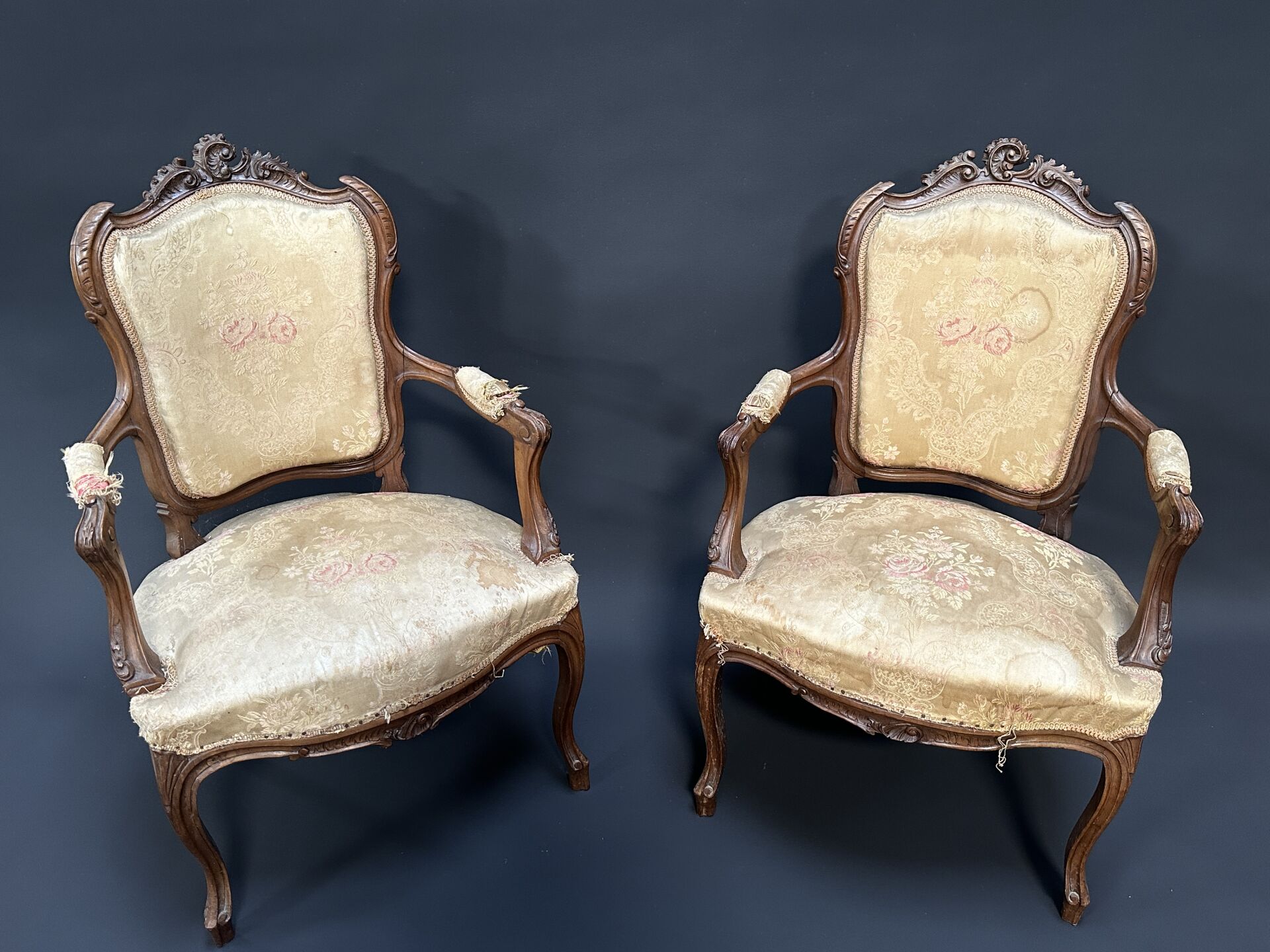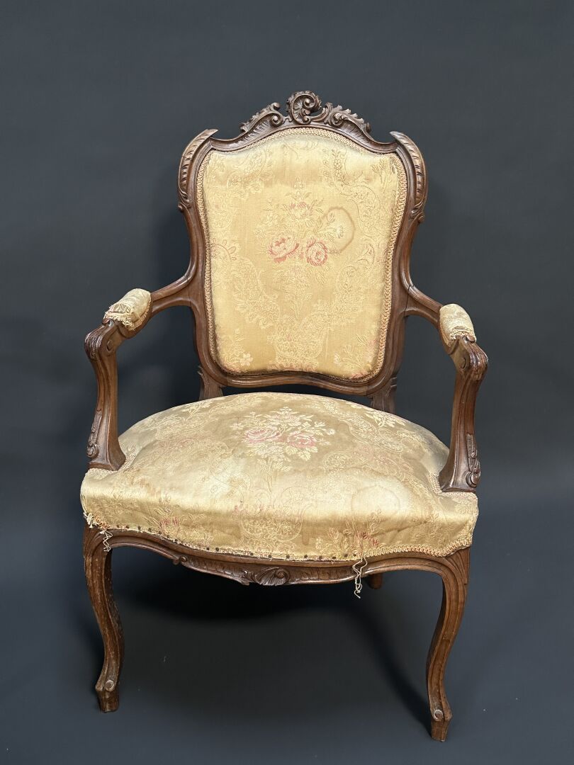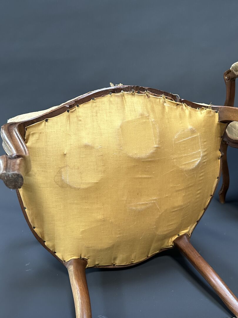 Paire de fauteuils cabriolets en bois naturel mouluré et sculpté de motifs rocaille. Les bras à manchettes, pieds violonnés. Style Louis XV. Haut. : 94 cm - Larg. : 63 cm - Prof. : 52 cm