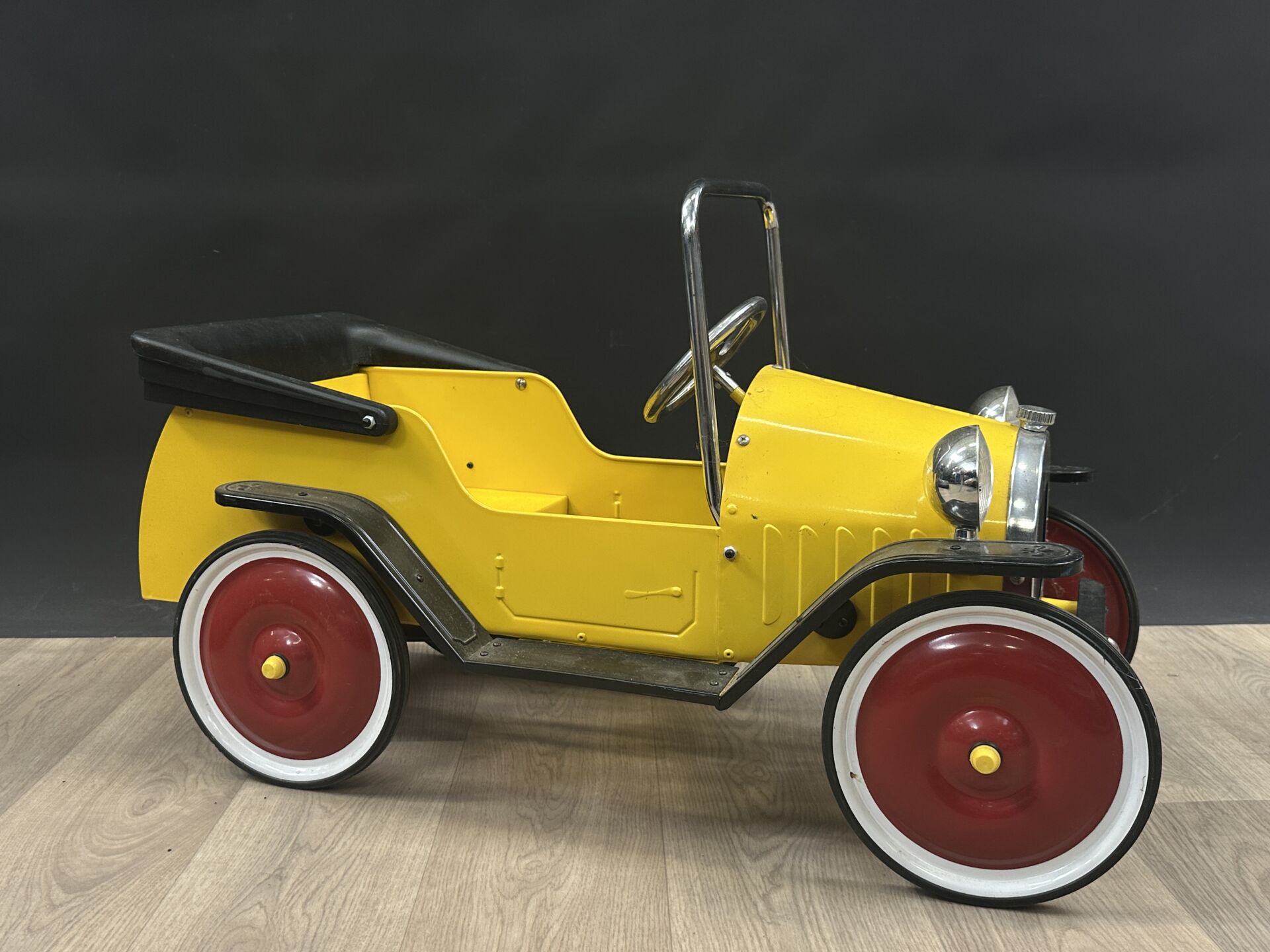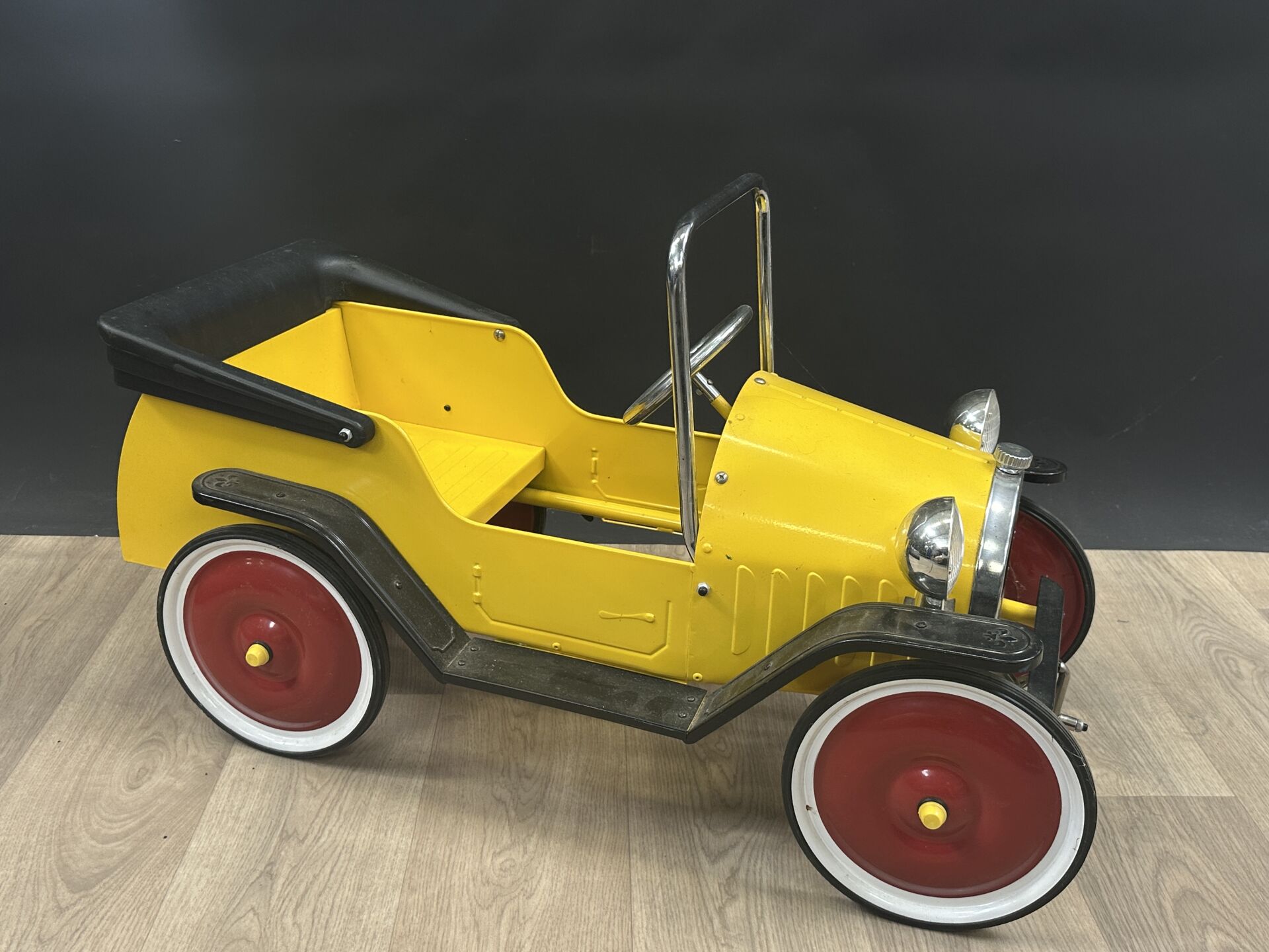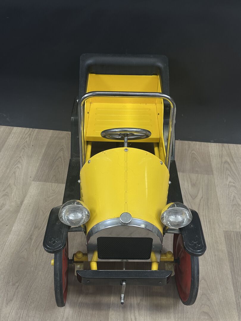 Voiture à pédales en tôle laquée jaune, rouge et noir et PVC (état d'usage). Haut. : 5 6cm - Larg. : 96 cm - Prof. : 43 cm