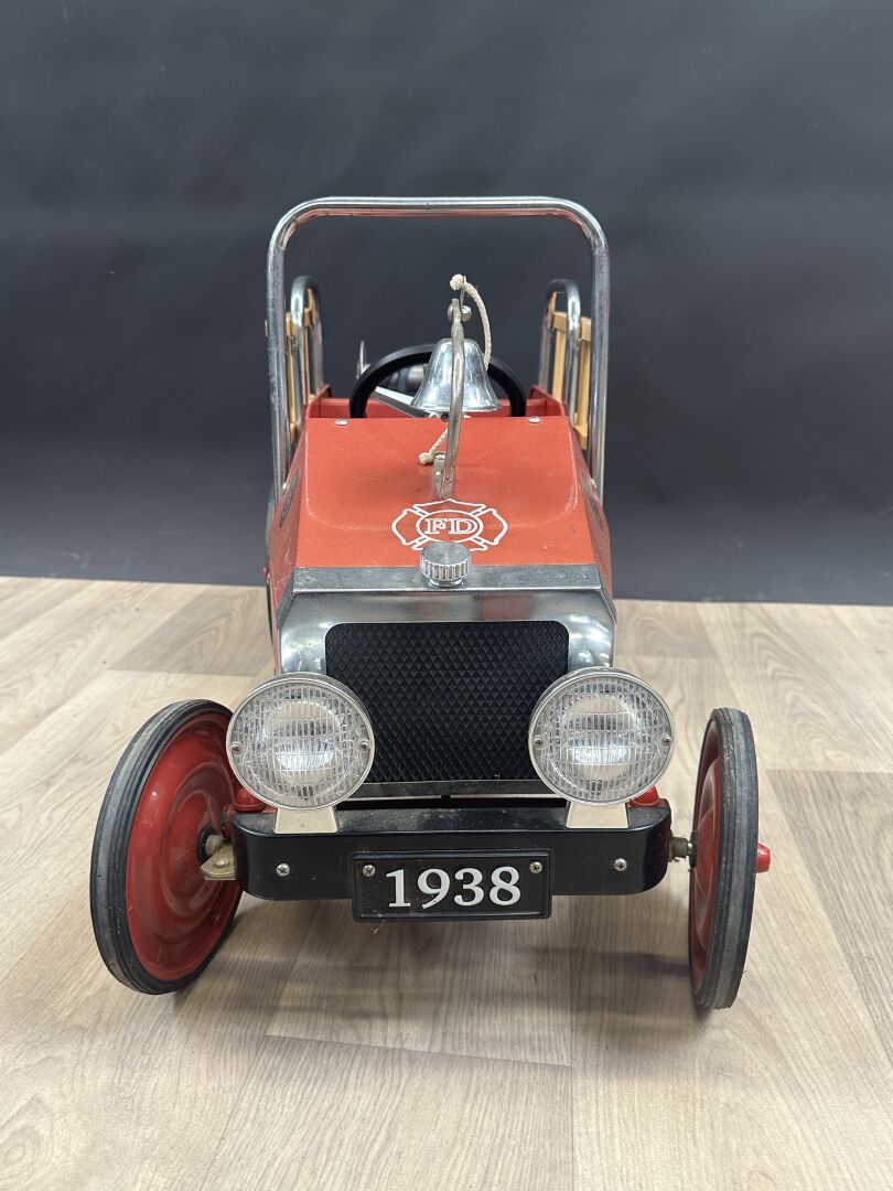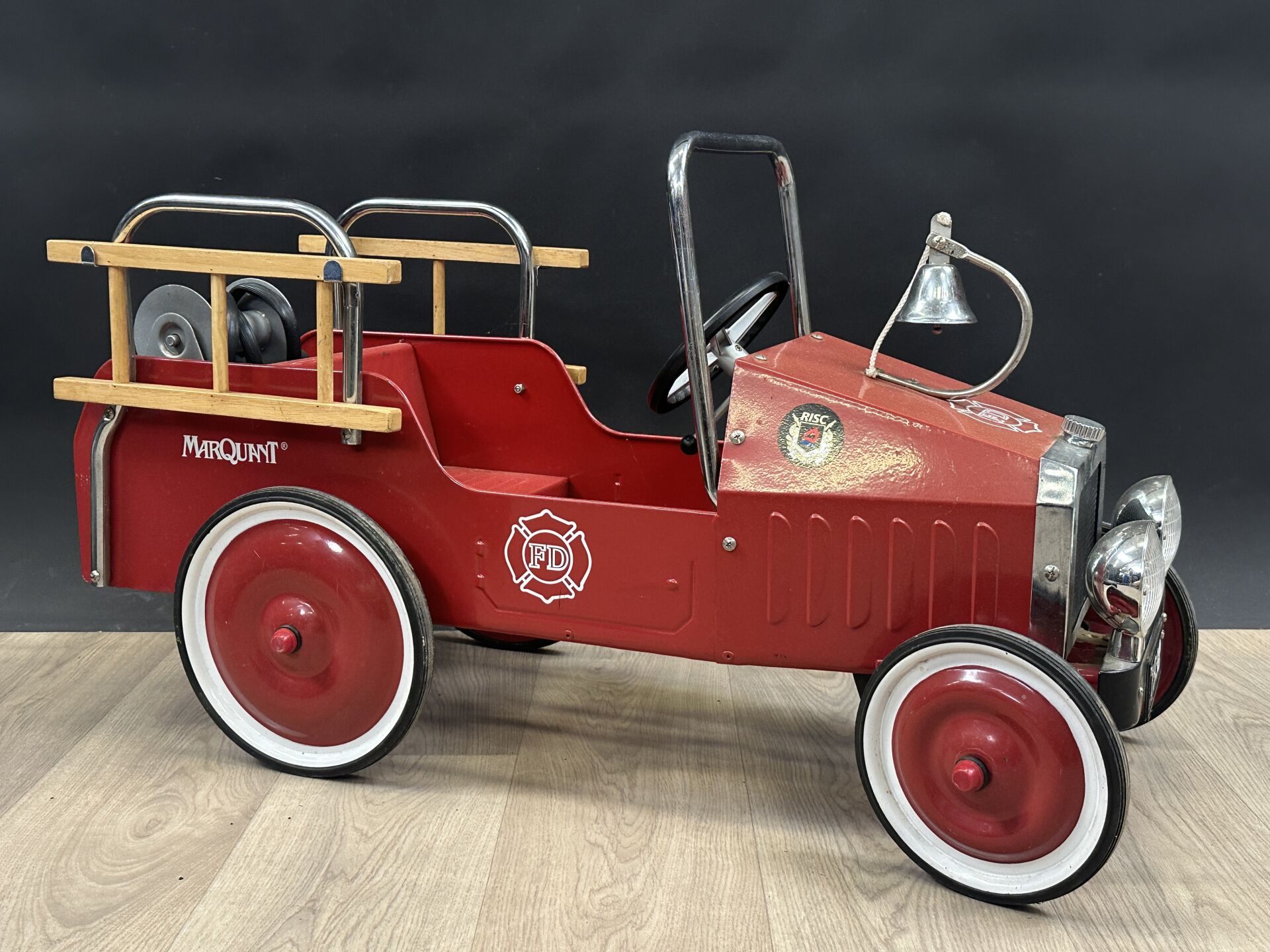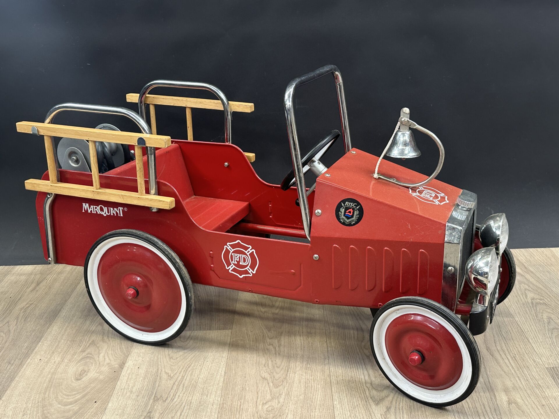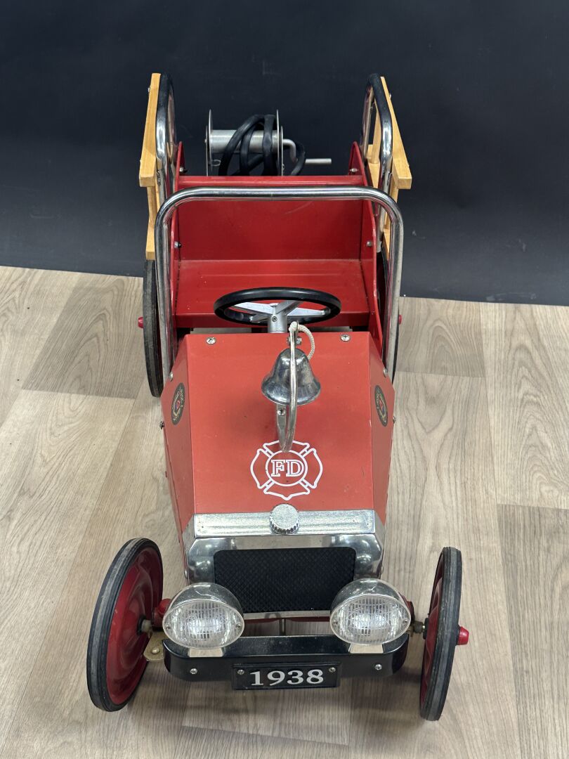 Voiture de pompier à pédales en tôle laquée rouge, chrome et bois avec lance à eau et clochette à l'avant (état d'usage). Haut. : 50 cm - Larg. : 94 cm - Prof. : 42 cm