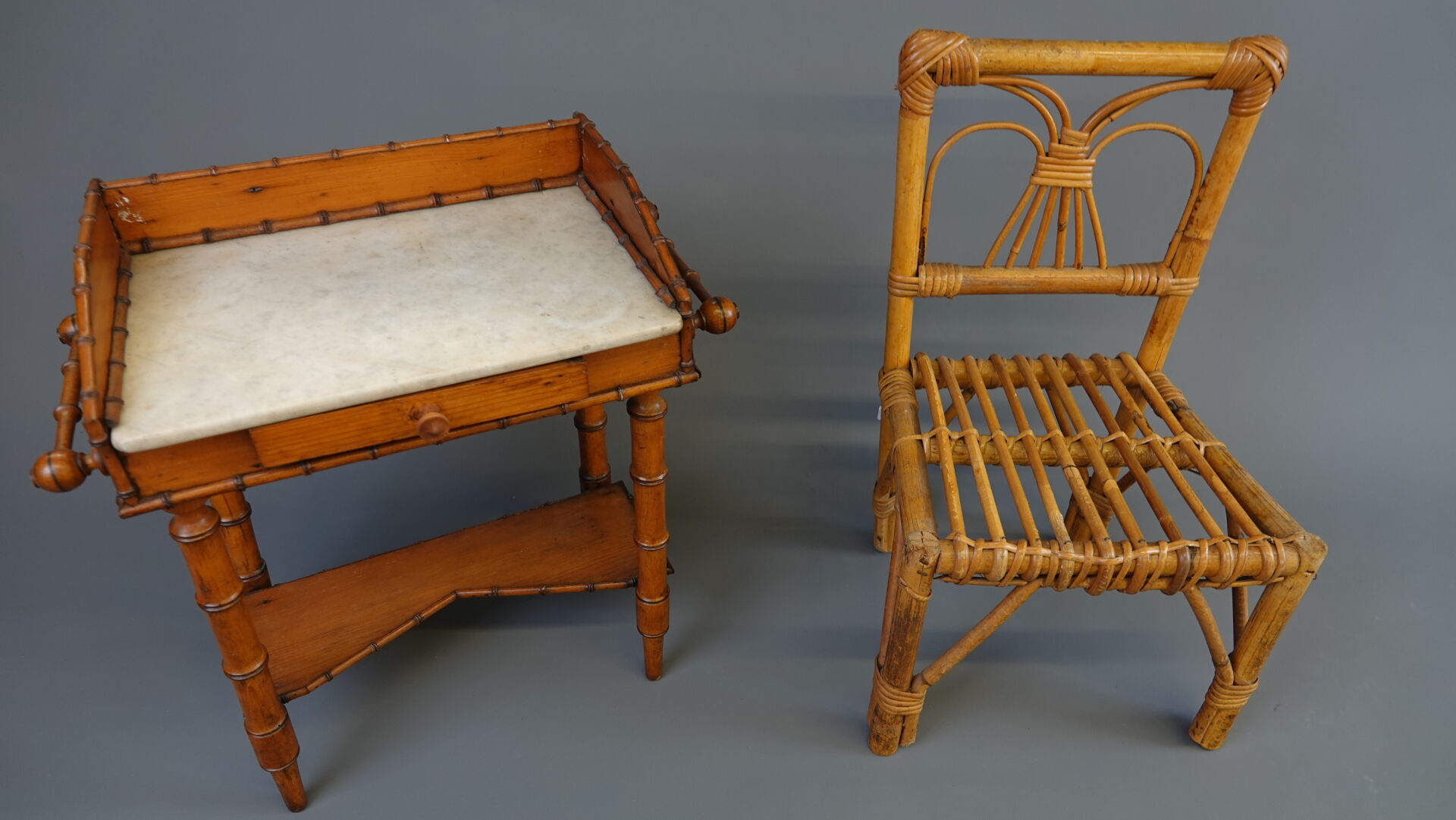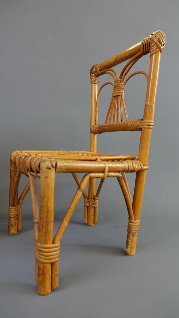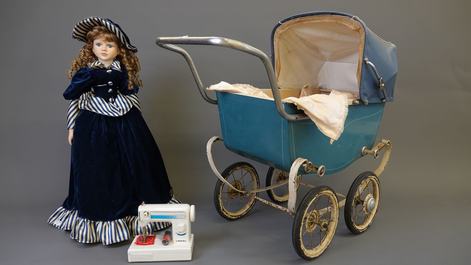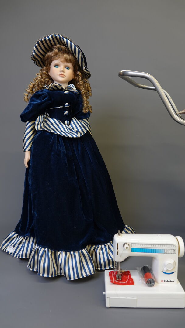 Lot comprenant 1 landau de poupée vers 1950, caisse en tôle et capote en moleskine long. 80 cm, 1 poupée contemporaine, 1 chaise en bambou pour enfant, haut. : 50 cm, 1 petite machine à coudre jouet ROBOLUX Long. 17,5 cm et 1 petite table de toilette à l'imitation bambou Haut. : 42 cm - Larg. : 43 cm - Prof. : 24 cm. Expertise réalisée par Monsieur Stanislas LEMOINE.