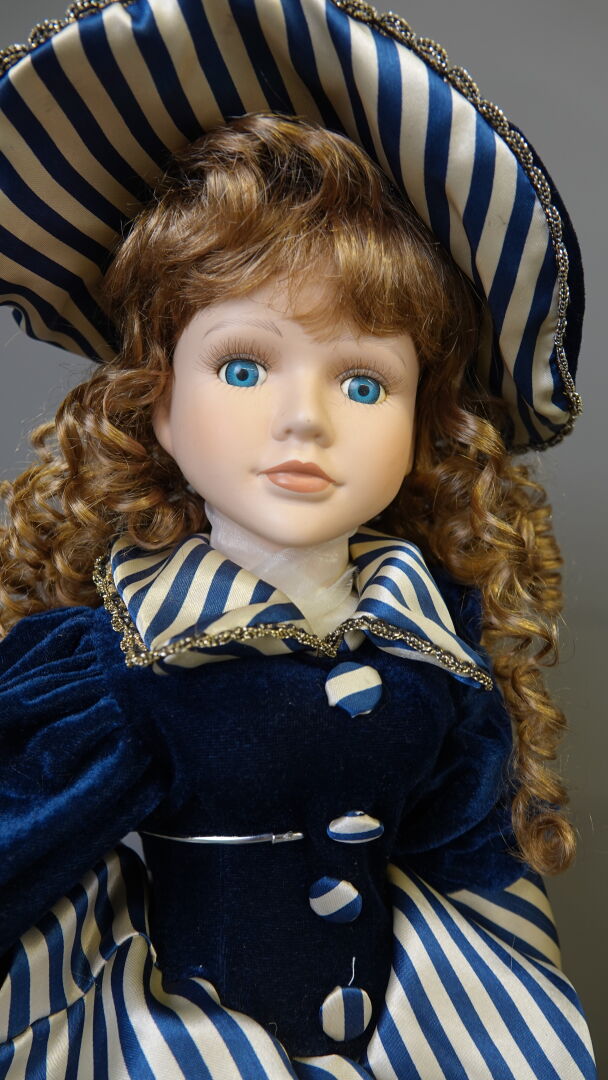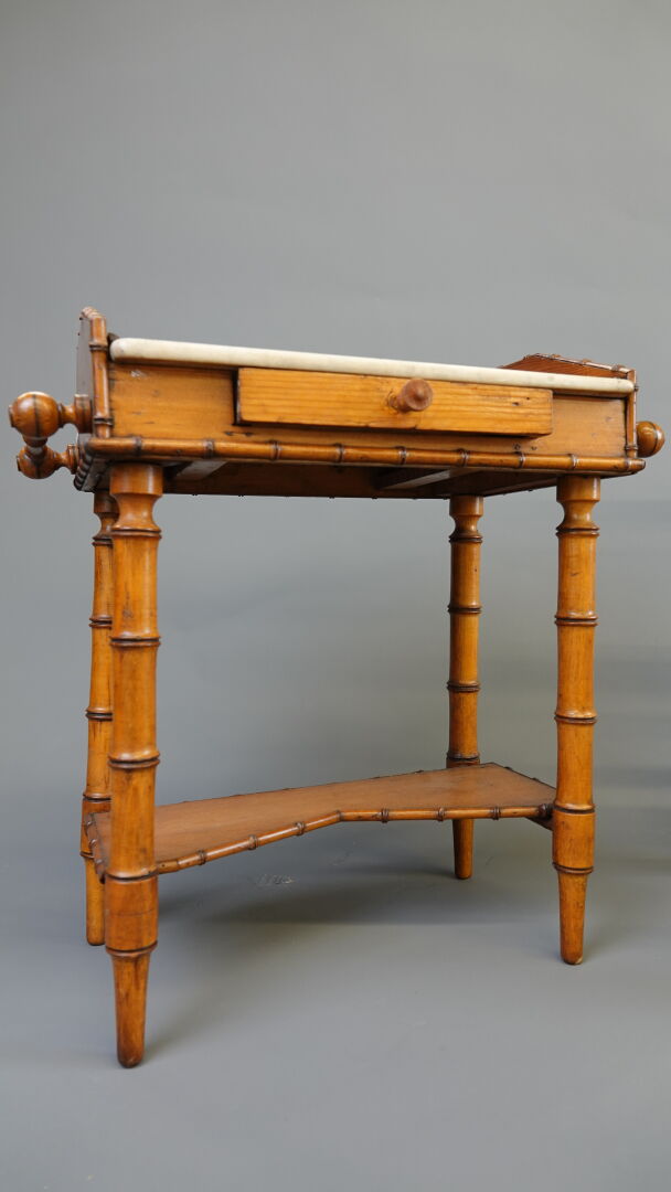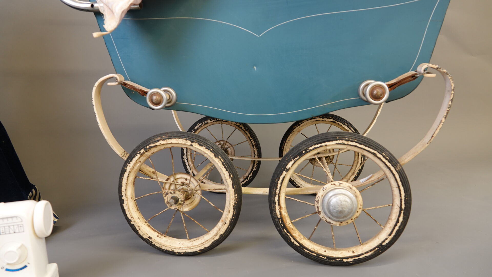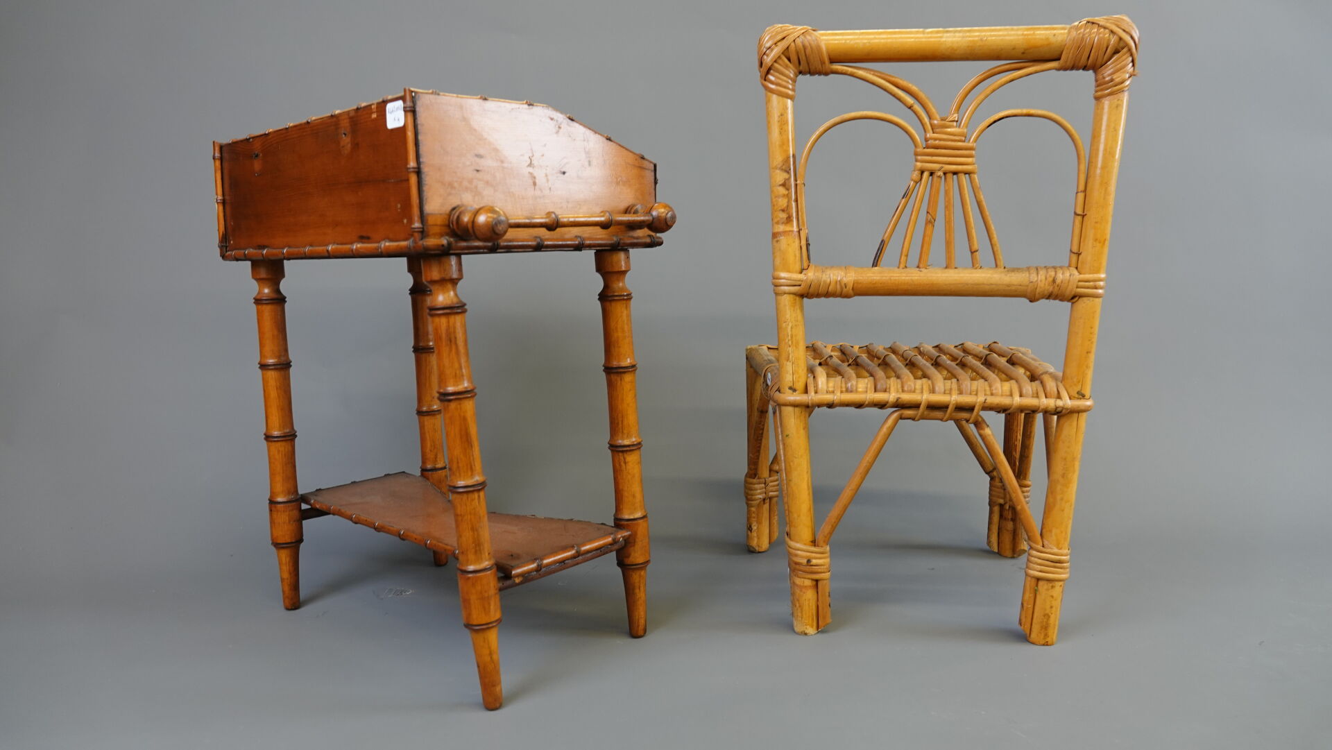 Lot comprenant 1 landau de poupée vers 1950, caisse en tôle et capote en moleskine long. 80 cm, 1 poupée contemporaine, 1 chaise en bambou pour enfant, haut. : 50 cm, 1 petite machine à coudre jouet ROBOLUX Long. 17,5 cm et 1 petite table de toilette à l'imitation bambou Haut. : 42 cm - Larg. : 43 cm - Prof. : 24 cm. Expertise réalisée par Monsieur Stanislas LEMOINE.