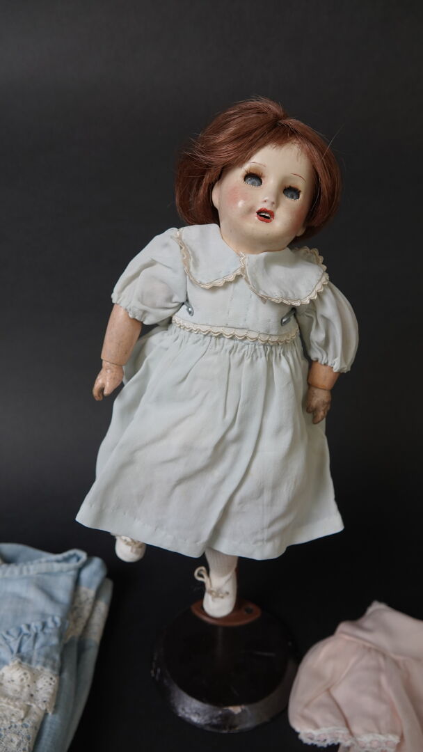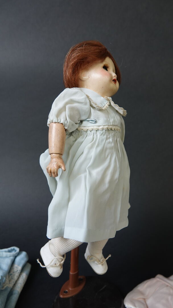 Bleuette incassable. Poupée à tête en composition peinte, yeux bleus dormeurs marqué en creux UNIFRANCE 301… Corps en composition articulé marqué 1 sous chaque pied, 2 dans le creux du dos. Haut. : 29 cm. Vêtements en partie anciens, perruque rapportée. Expertise réalisée par Monsieur Stanislas LEMOINE.