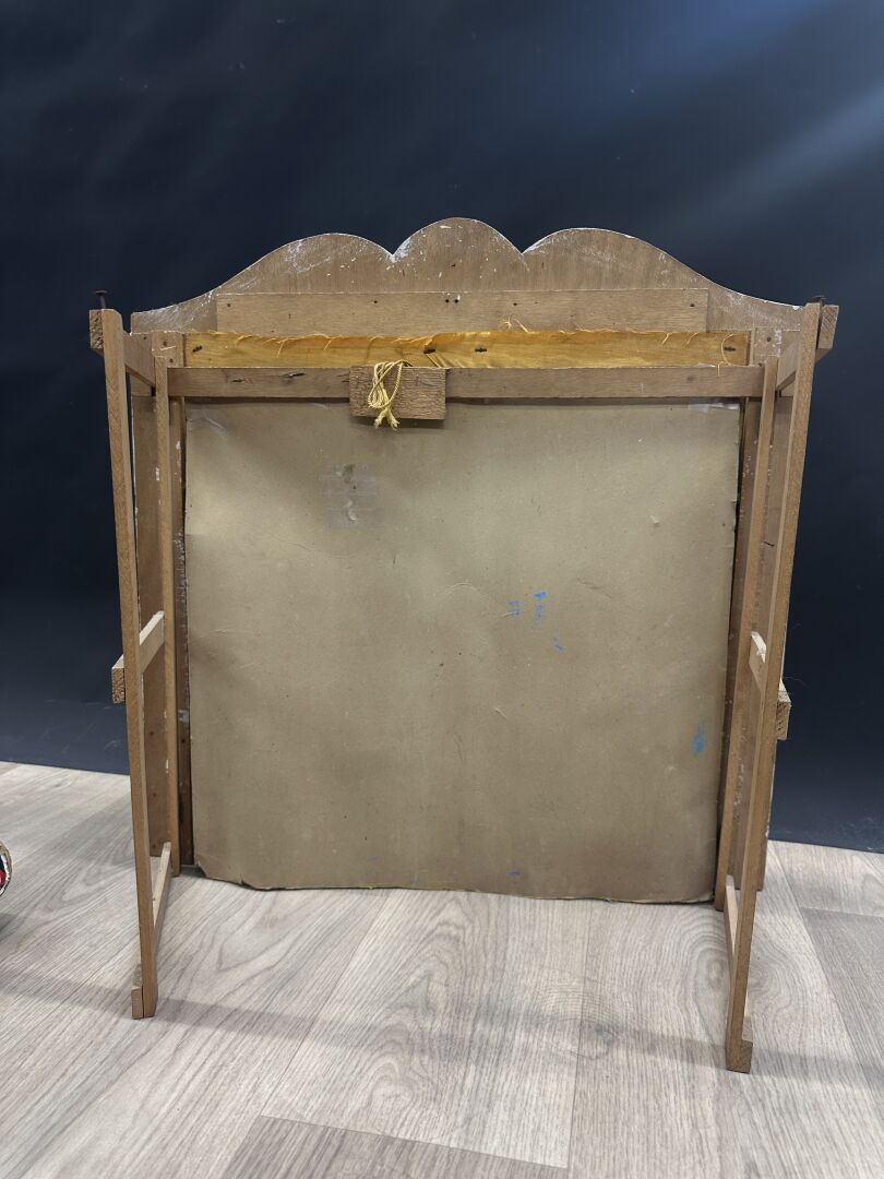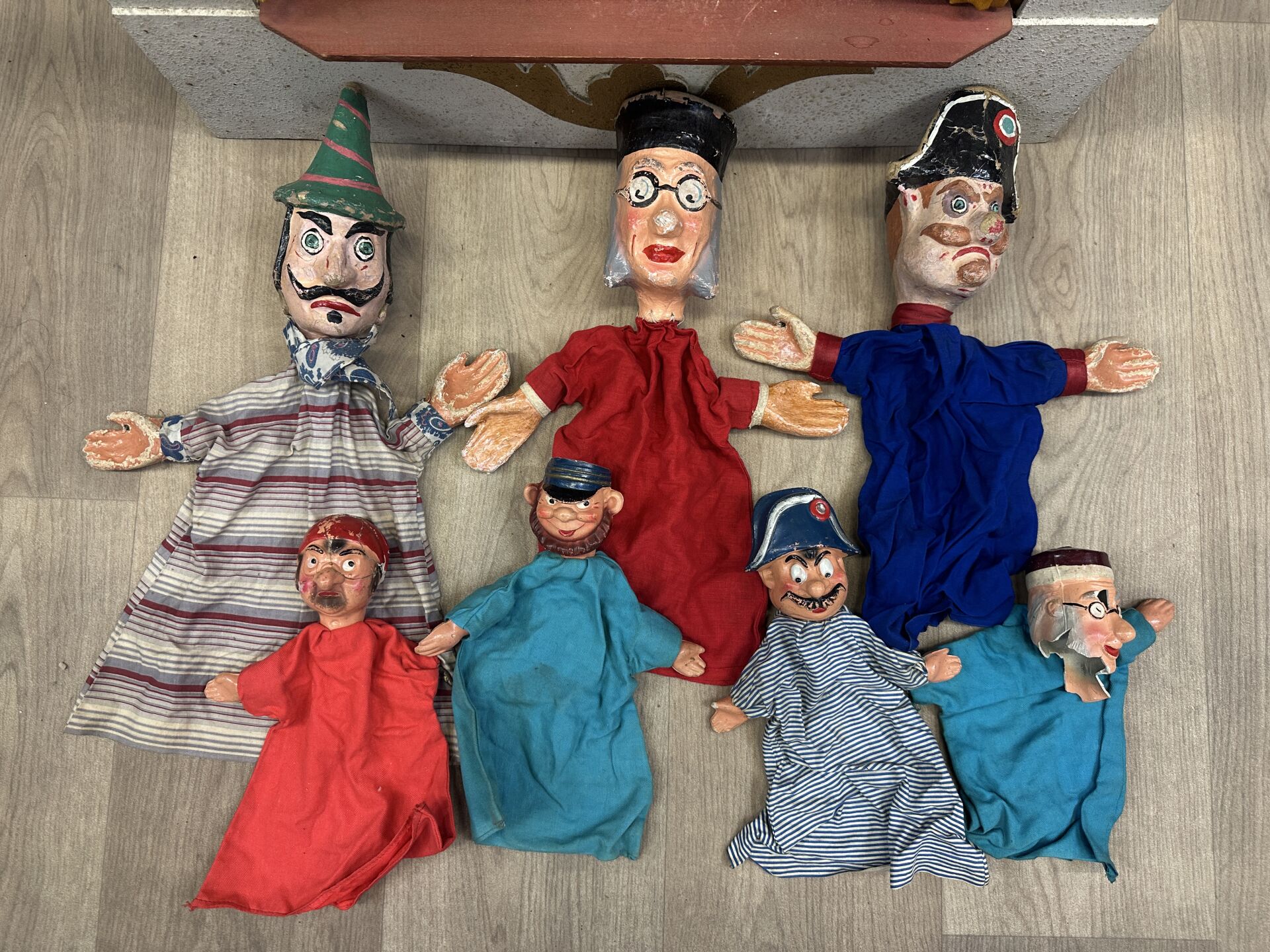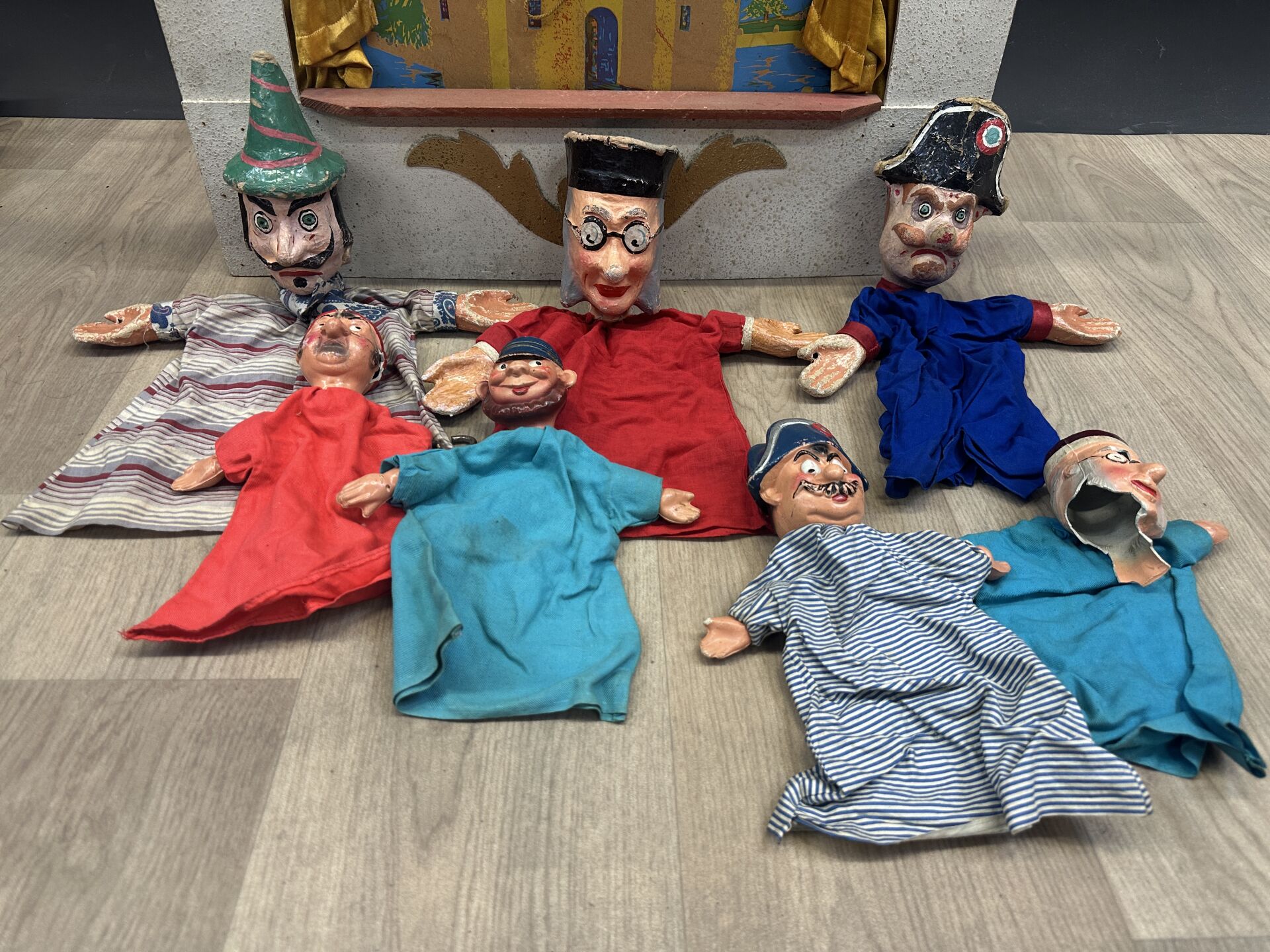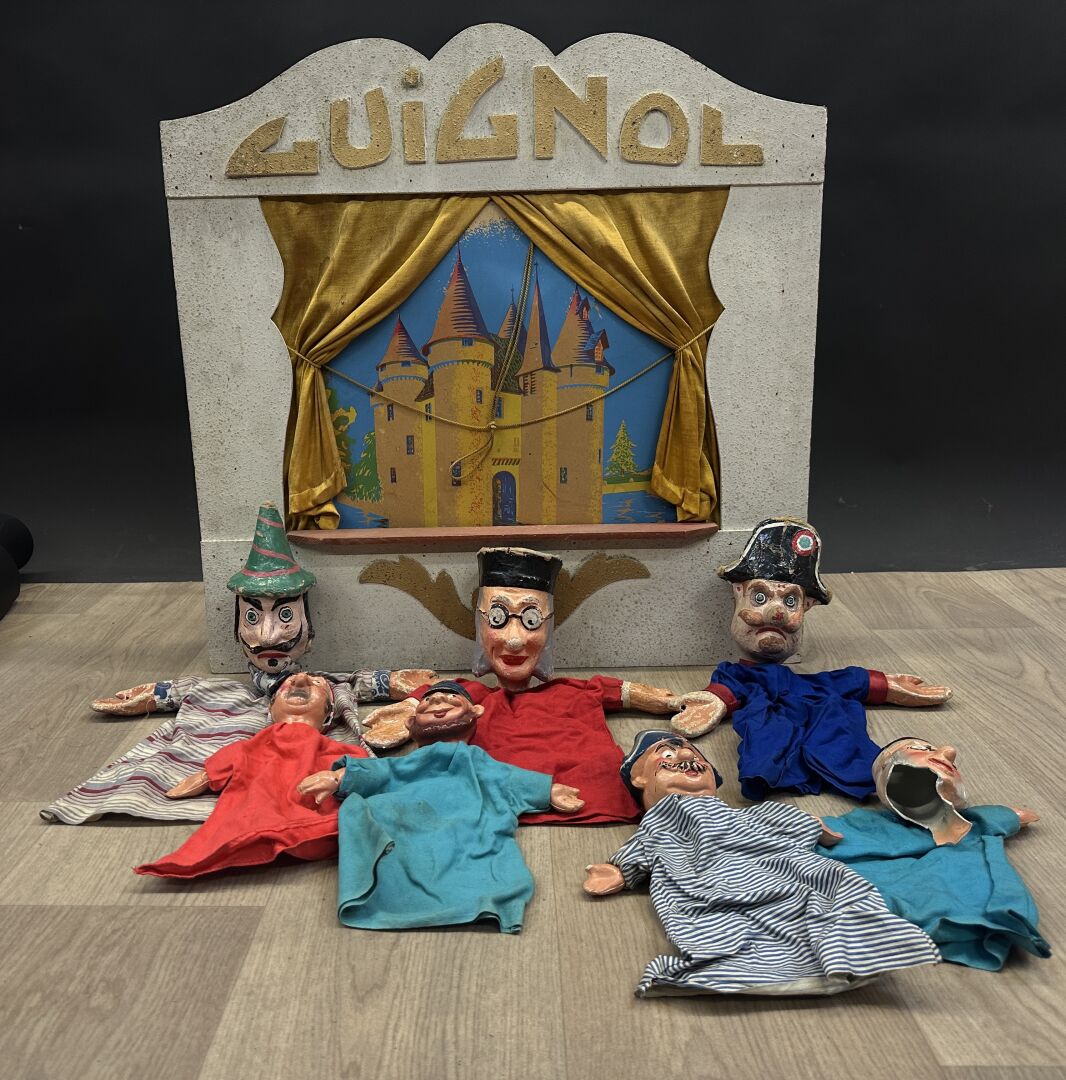 Théâtre de marionnettes "GUIGNOL" et sept marionnettes en composition ou papier mâché peintes et tissu (accidents, usures, manques). Circa 1950. Haut. : 66 cm - Larg. : 65 cm