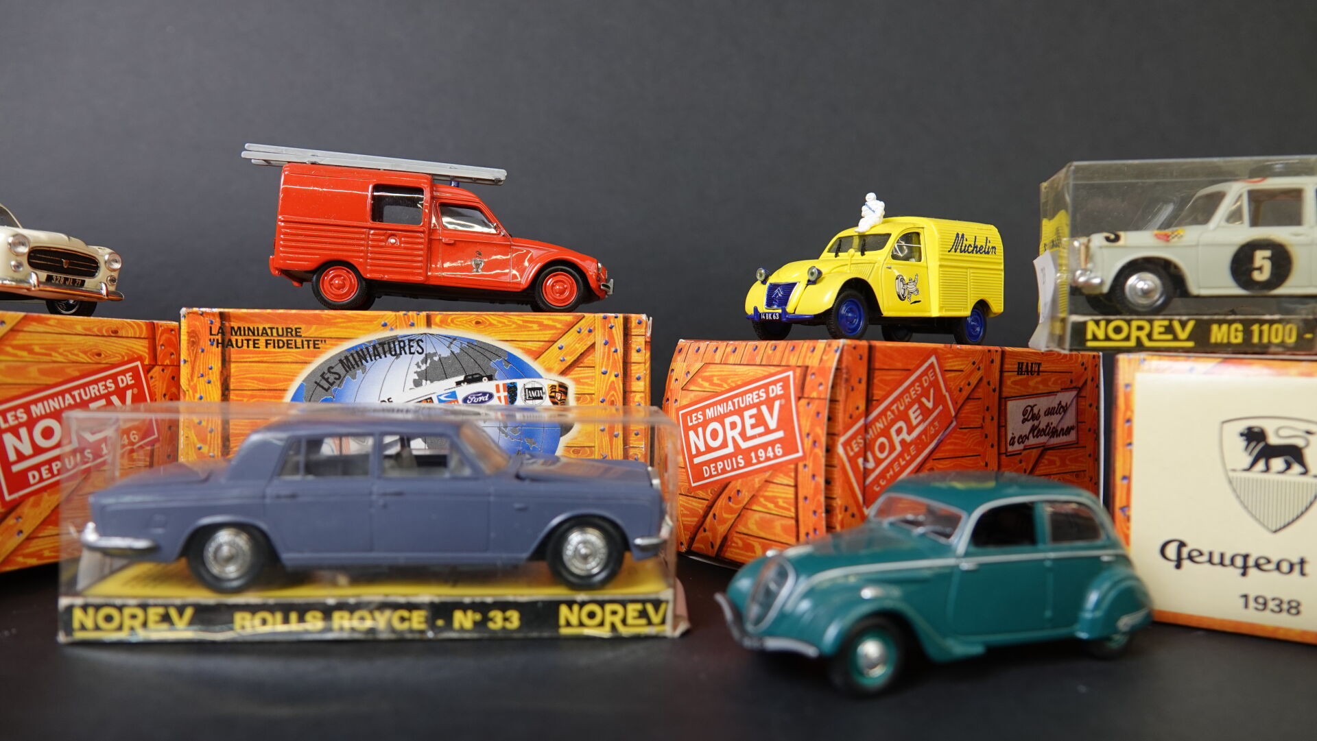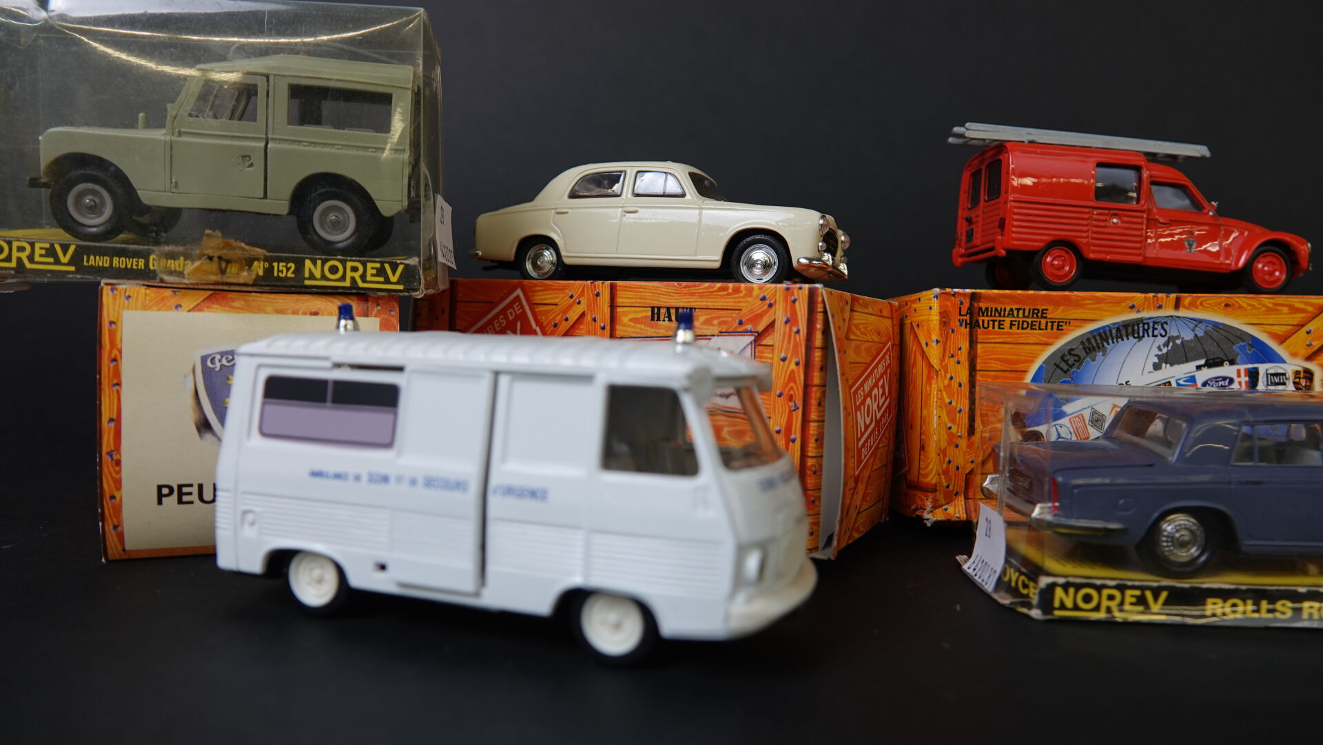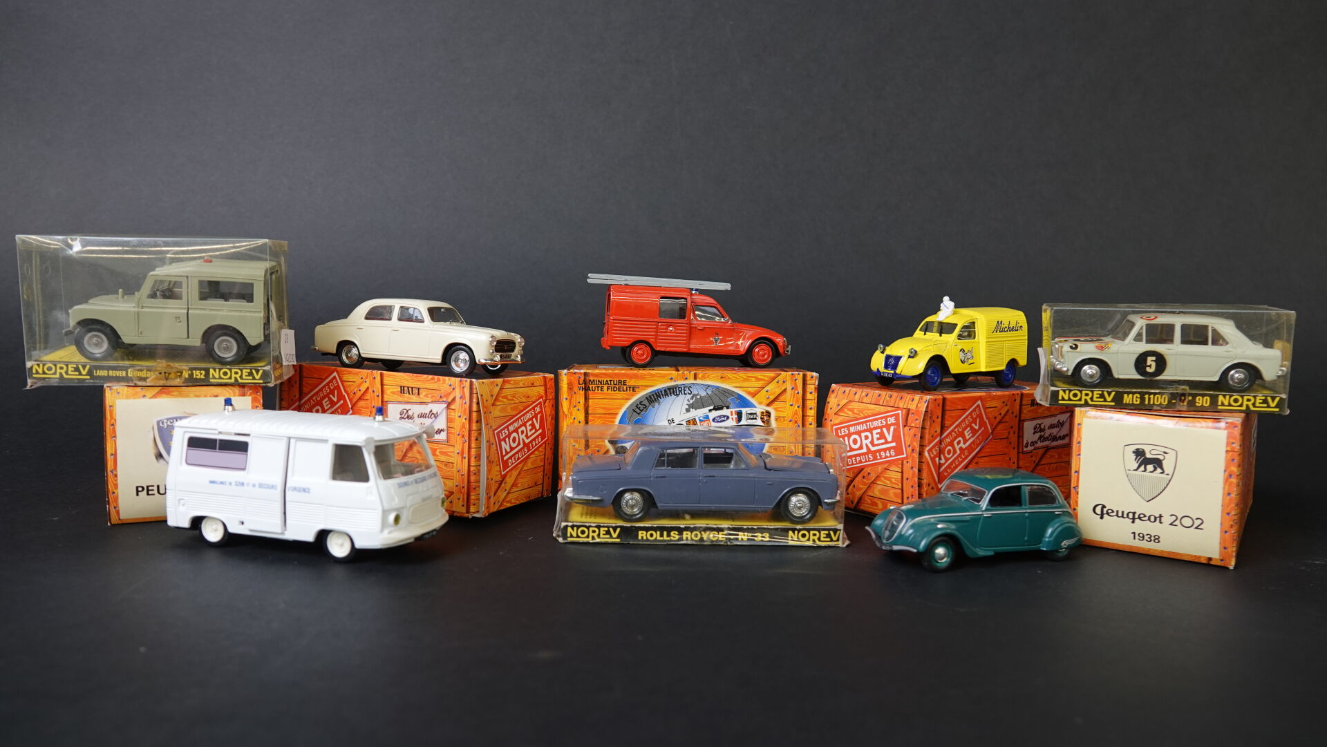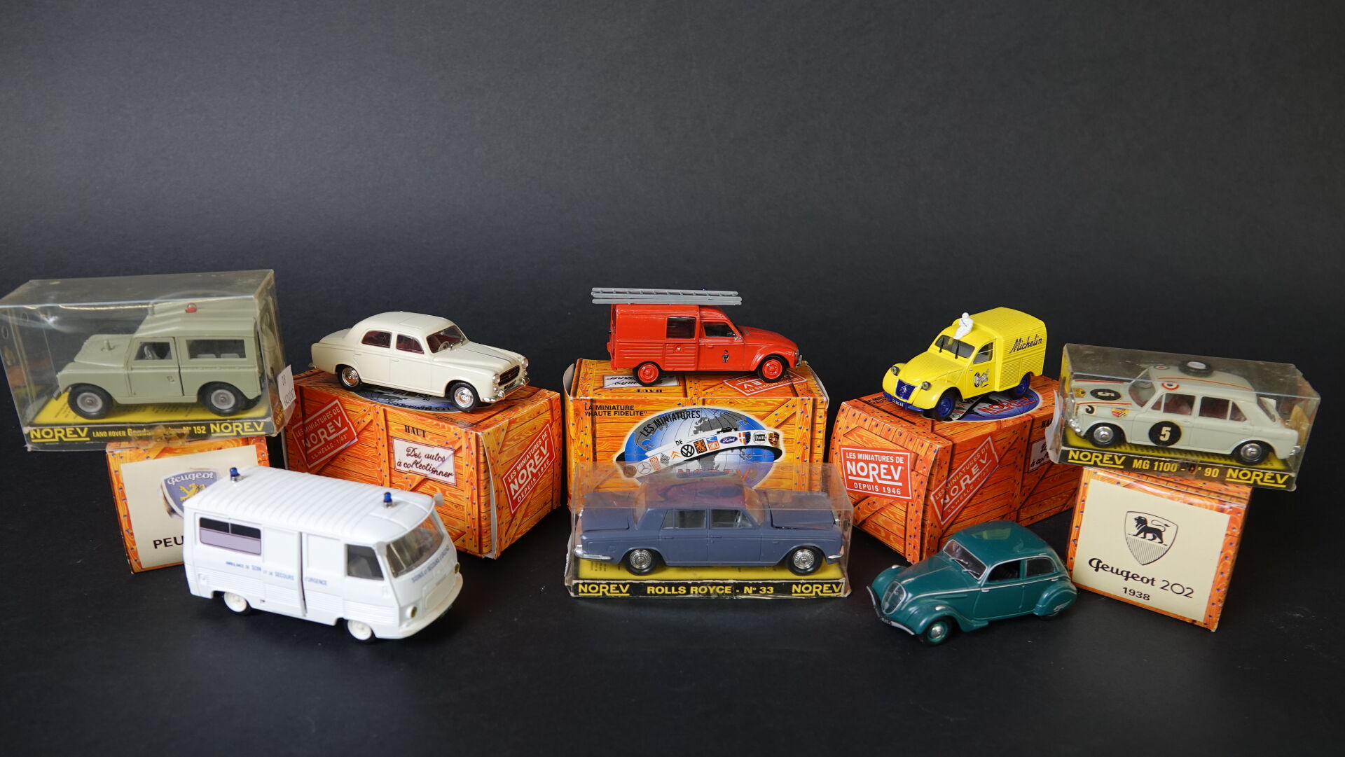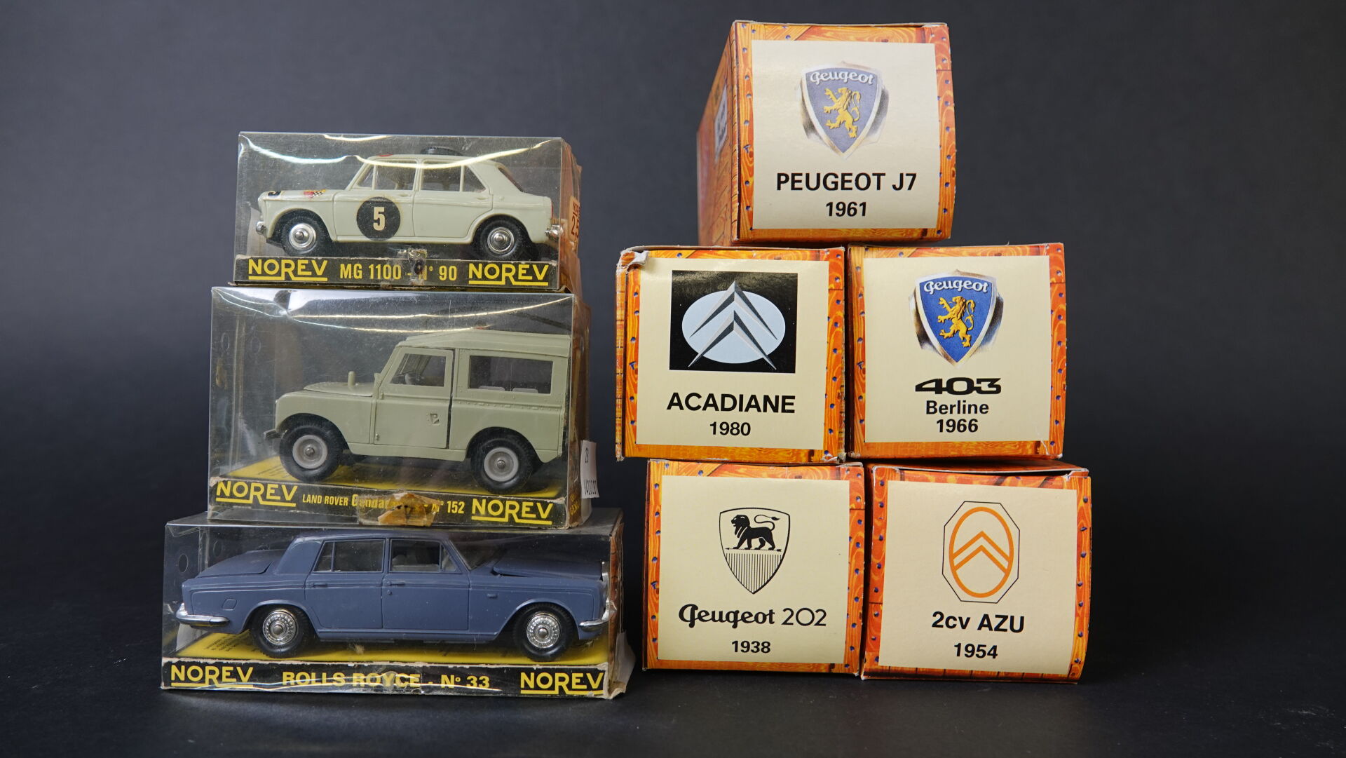 1/43ème - NOREV Lot de 3 véhicules en boites d'origines (plastique transparente avec base carton) dont MG 1100 Rallye Monte Carlo Réf 90 Land Rover Gendarmerie vert Réf 152 et Rolls Royce corniche Réf 33, on y joint 5 véhicules rééditions Norev dont J7 Peugeot, 202 Peugeot , 403 berline et 2cv Citroën état d'usage en boites d'origines (boites défraîchies pour les anciennes). Expertise réalisée par Monsieur Stanislas LEMOINE.