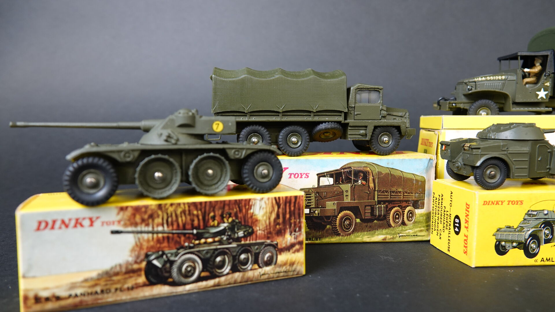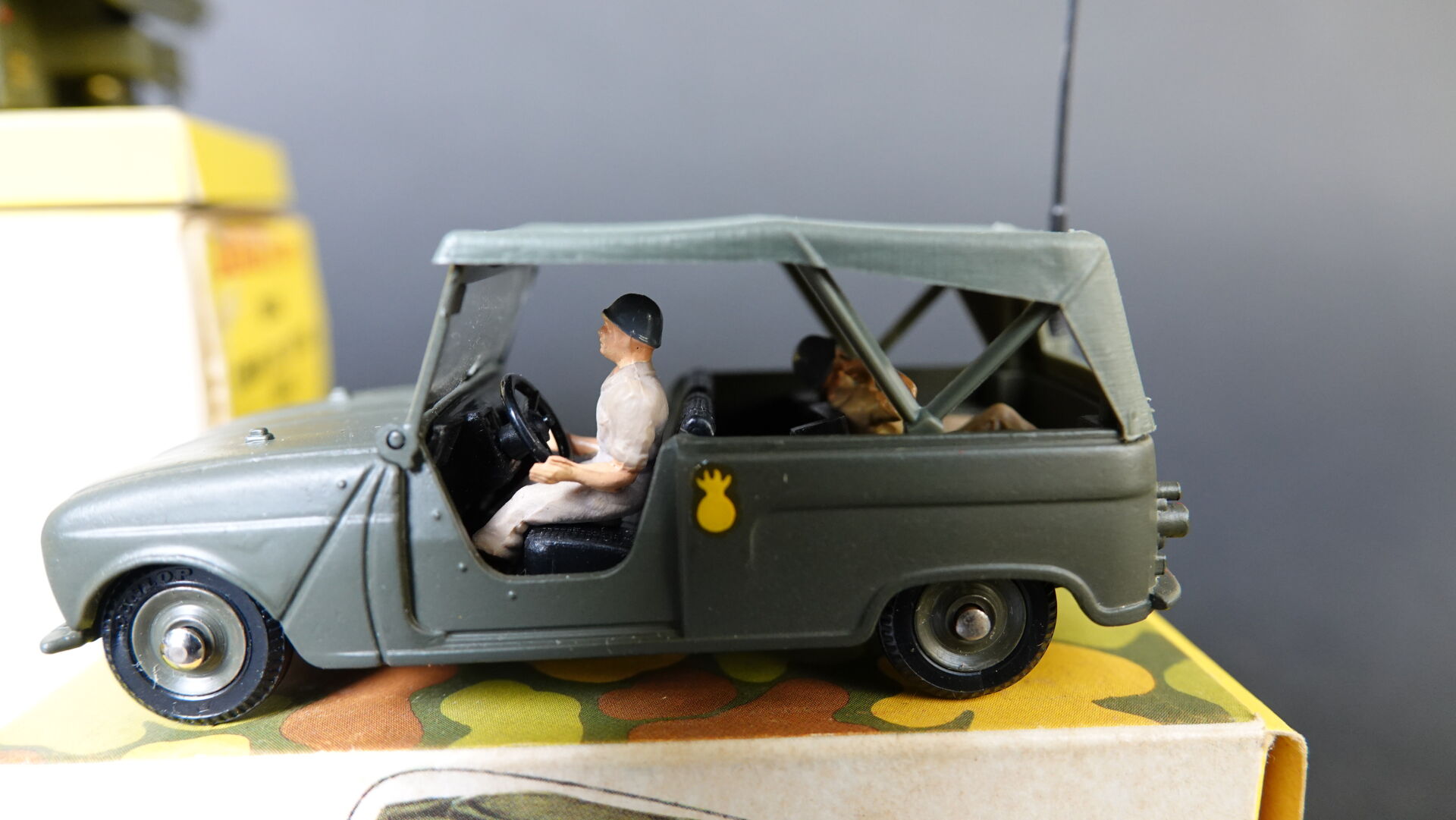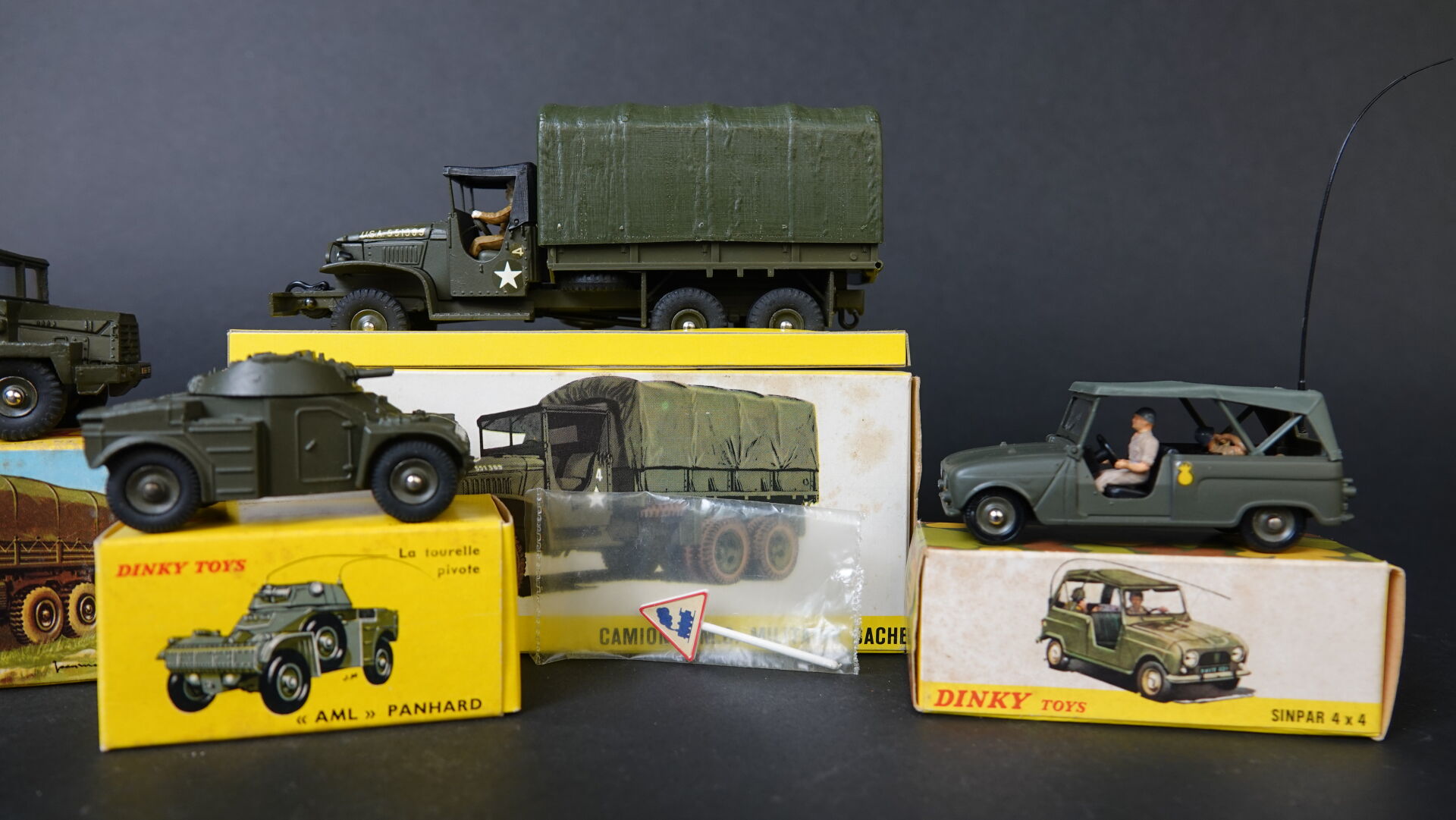 1/43ème - Dinky toys France Lot de 5 véhicules militaires en boites d'origines dont GMC bâché US Army avec carton de présentation Réf 809, Berliet Gazelle Réf 824, EBR Panhard Réf 827, AML n(Zuto mitrailleuse légère) Panhard Réf 814, Et Renault 4L Sinpar 4x4 complète avec 2 soldats et filets de camouflage Très bel état en boites d'origines. Expertise réalisée par Monsieur Stanislas LEMOINE.