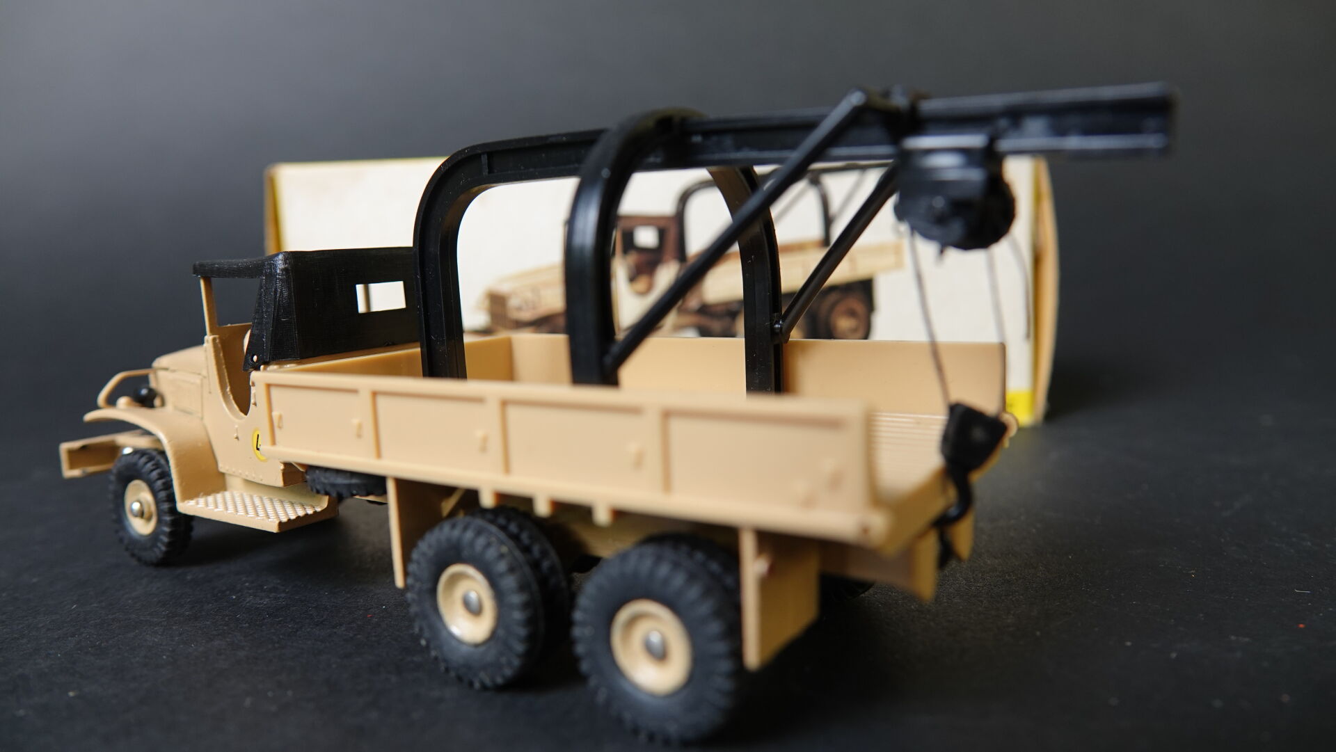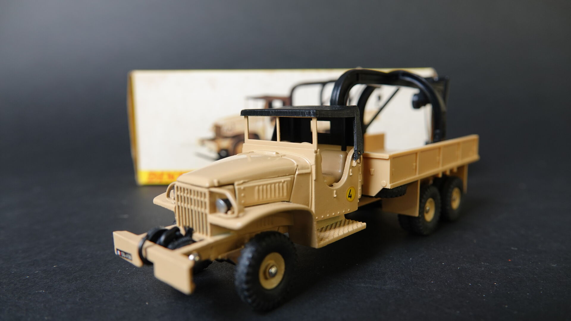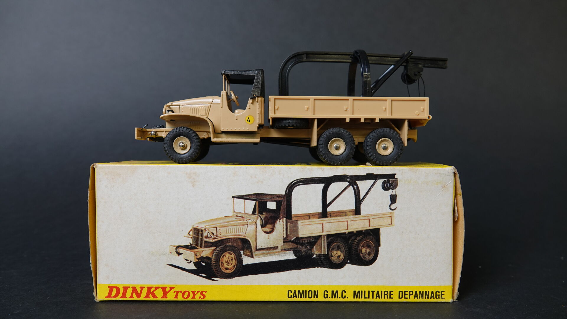 1/43ème - Dinky toys France Camion GMC Militaire dépannage 1ère version couleur Sable Réf 808 Très bel état proche du neuf en boite d'origine (défraîchie). Expertise réalisée par Monsieur Stanislas LEMOINE.