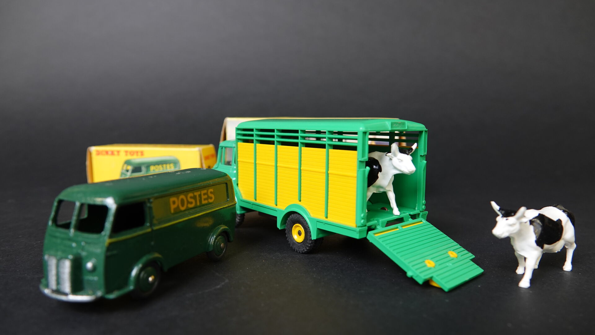 1/43ème - Dinky toys France, lot de 2 utilitaires dont Berliet bétaillère avec 2 vaches Réf 577, Fourgon Postal Peugeot D3A (cloques à l peinture) Réf 560, Très bel état proche du neuf en boite d'origine (défraîchie). Expertise réalisée par Monsieur Stanislas LEMOINE.
