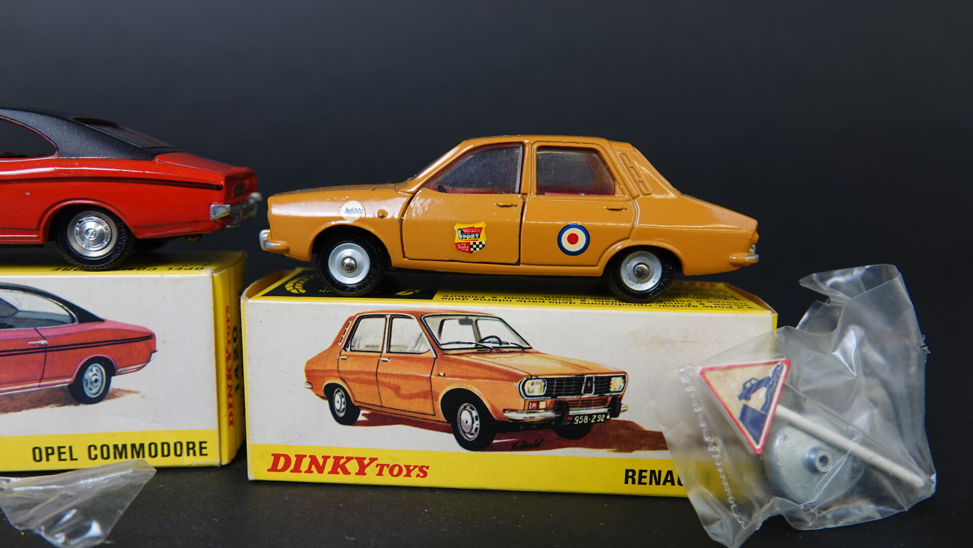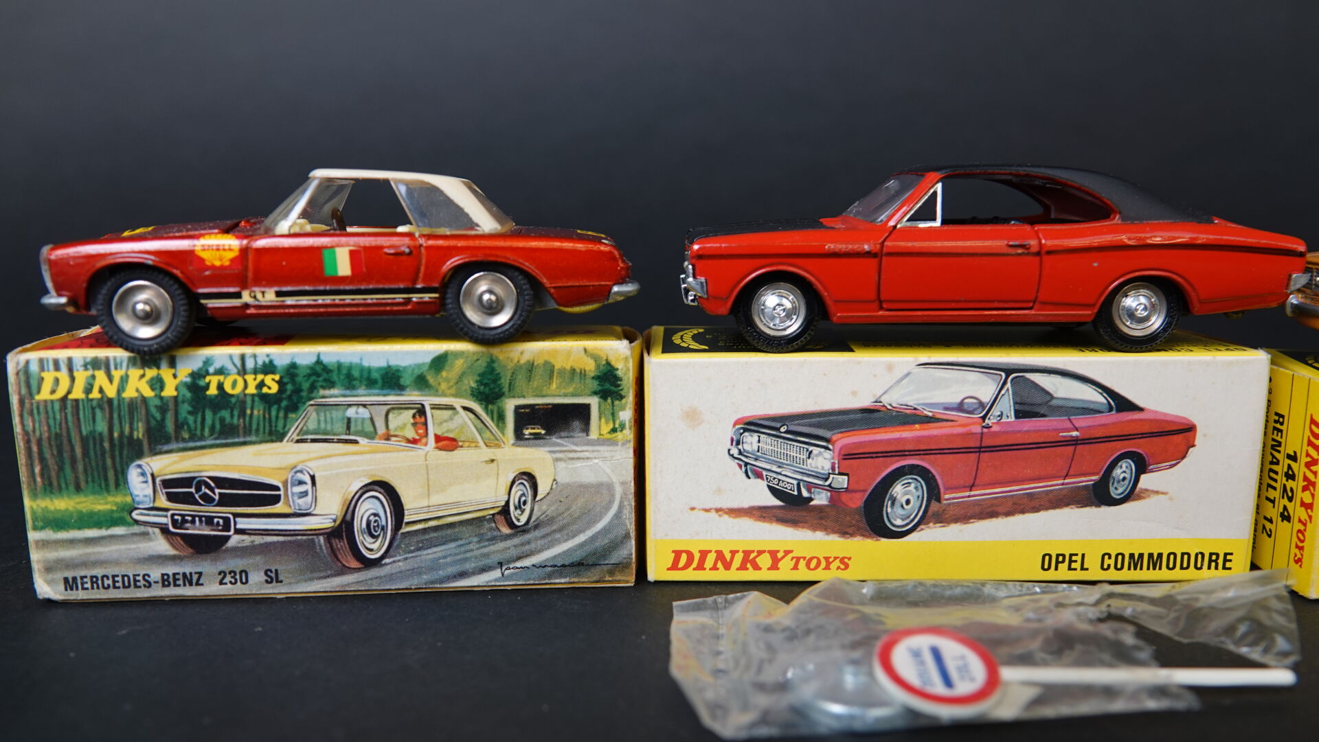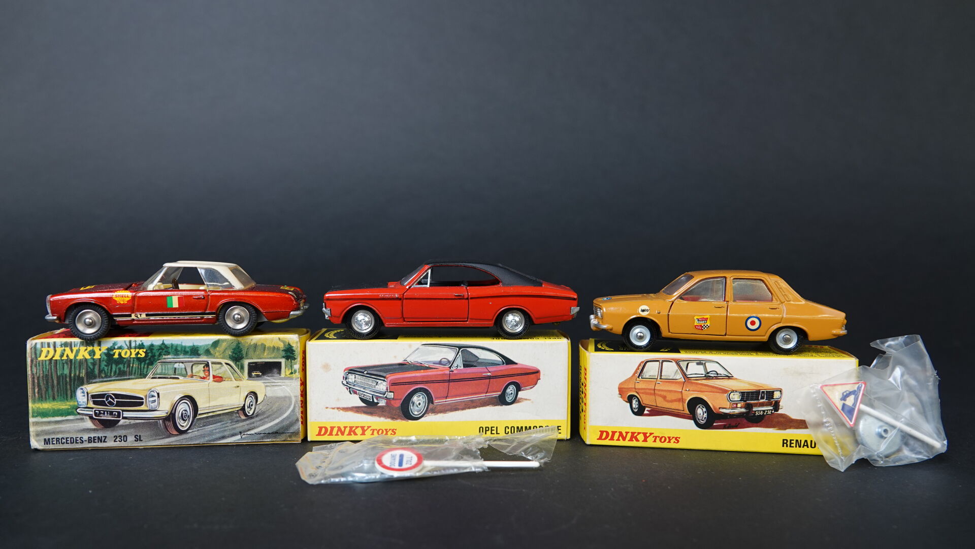 1/43ème - Dinky toys France, lot de 3 véhicules en boites d'origines dont Opel Commodore rouge et noire avec son panneau sous sachet Réf 1420, Mercedes 230 SL pagode rouge à toit crème avec rajouts de décalcomanies Réf 516, Renault 12 avec son panneau sous sachet et des décalcomanies rapportés Réf 1424. Bel état en boite d'origine (boite de la Mercedes défraîchie avec un rabat détaché). Expertise réalisée par Monsieur Stanislas LEMOINE.