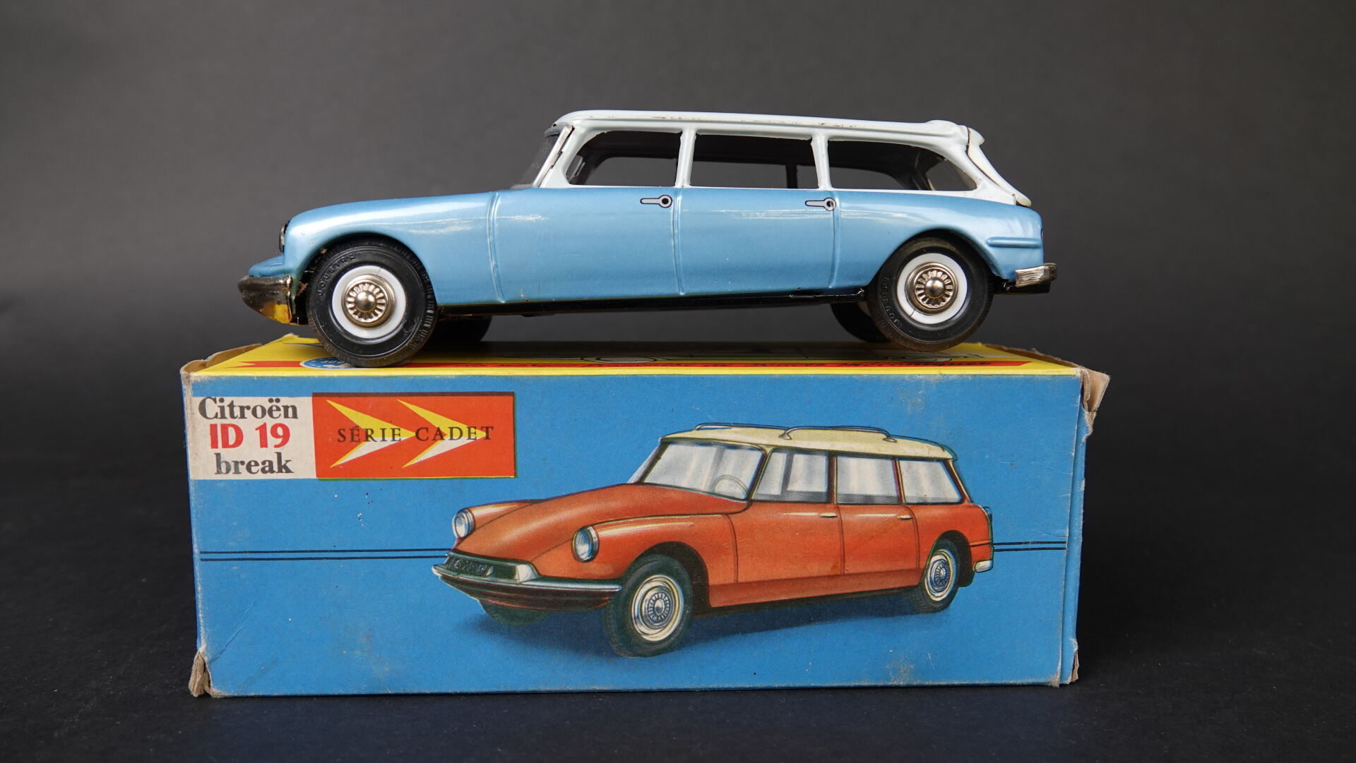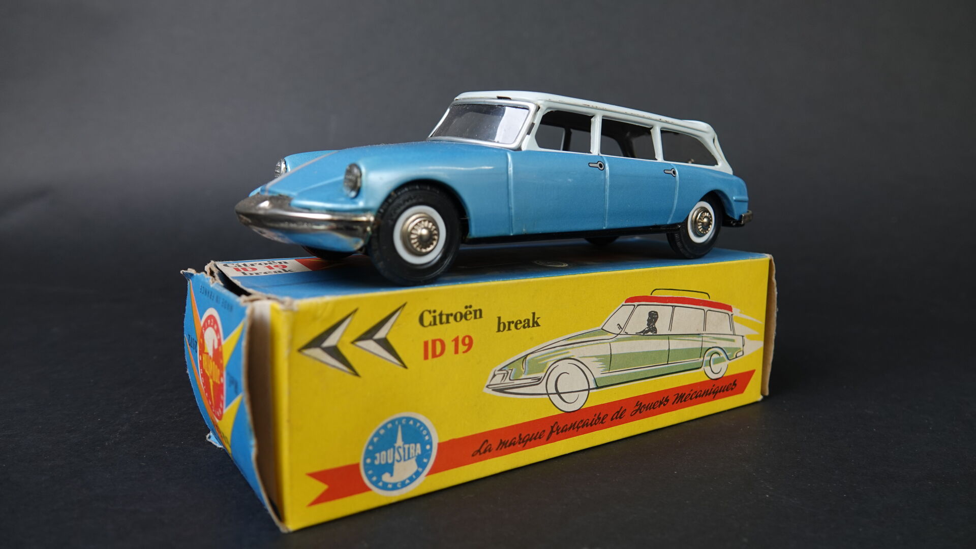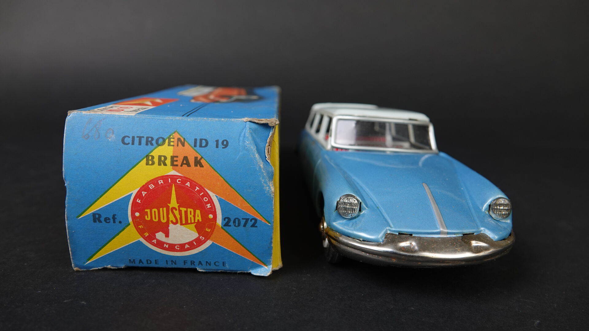 JOUSTRA Série Cadet, Citroën ID 19 break , jouet en tôle lithographiée à friction avec sa malle arrière ouvrante, elle est dans sa boite d'origine L 21 cm, Réf 2072 Très bel état proche du neuf. Expertise réalisée par Monsieur Stanislas LEMOINE.
