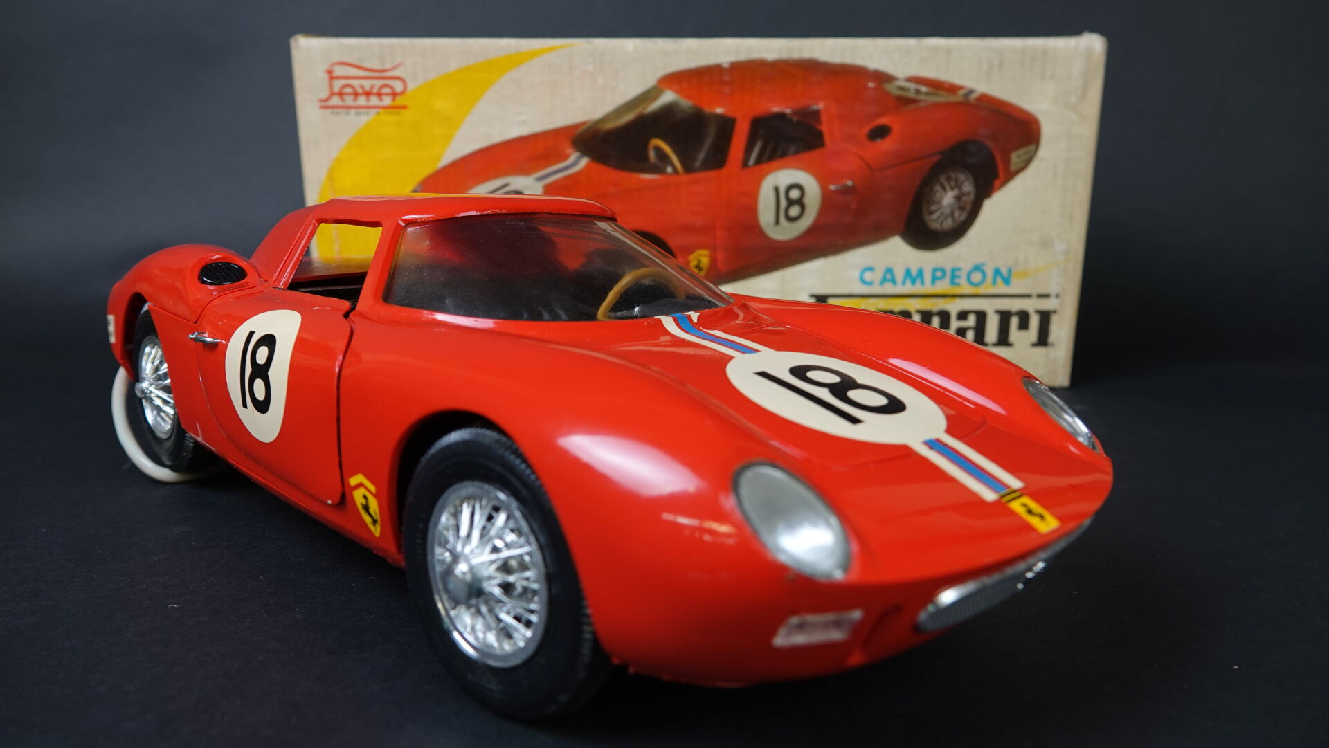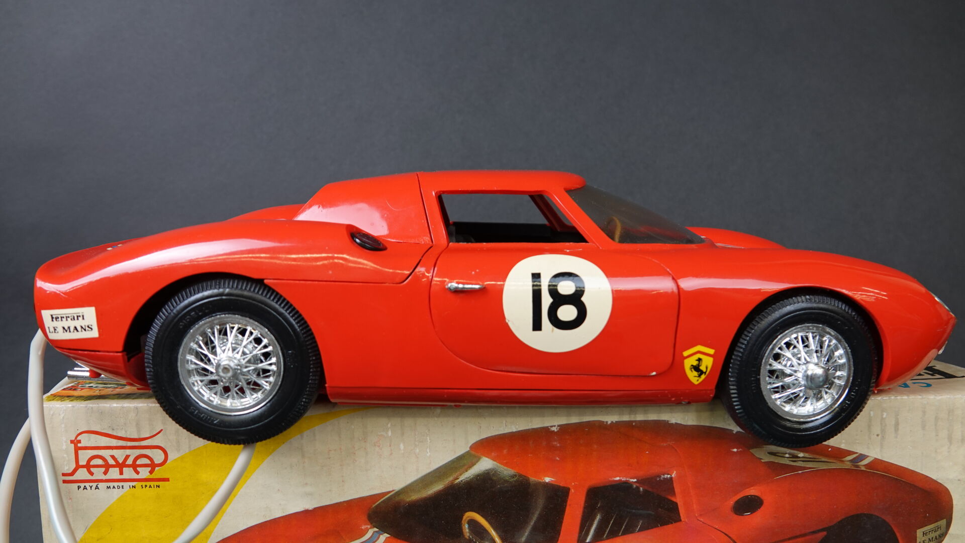 PAYA.Espagne - Ferrari 250 LM, jouet en plastique filoguidé en boîte d'origine avec notices. L 42,5 cm. Très bel état d'origine. Référence 3100. Expertise réalisée par Monsieur Stanislas LEMOINE.