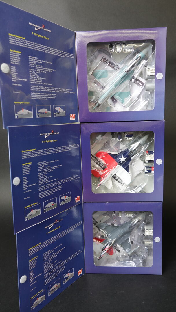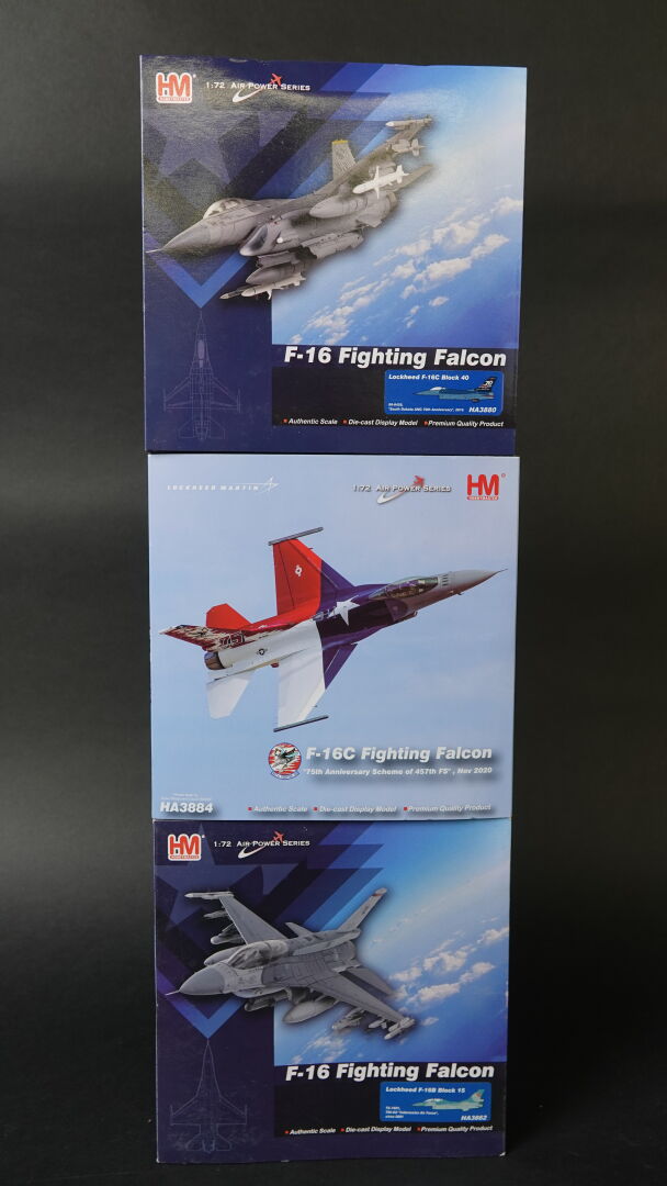 HOBBY MASTER. Réunion de trois modèles réduits 1/72ème, en boîtes d'origine (rares traces d'usures) comprenant : - F-16C Fighting Falcon "75th anniversary Scheme of 457th FS, Nov. 2020" référence HA3884; - F-16 Fighting Falcon "Lockheed F-16B Block 15" référence HA3862; - F-16 Fighting Falcon "Lockheed F-16 Block 40" référence HA3880.