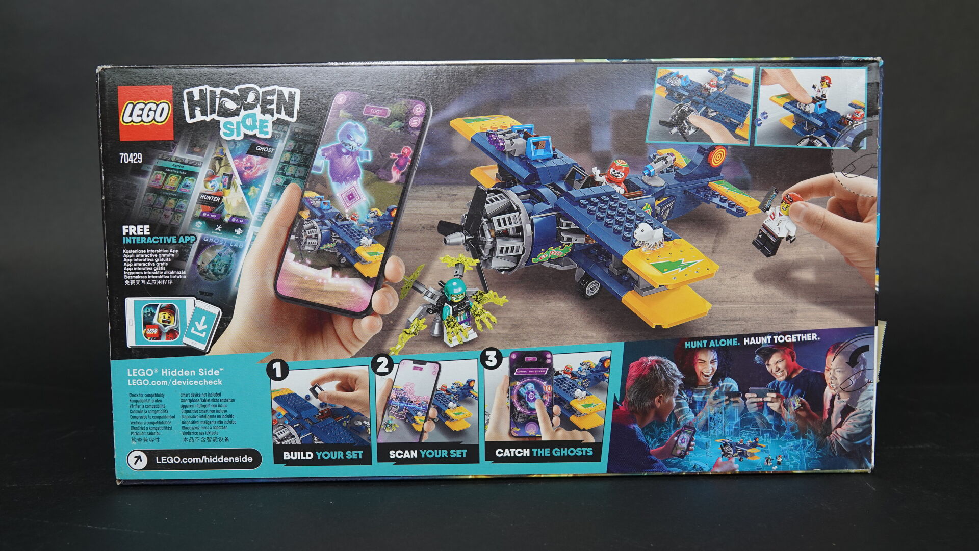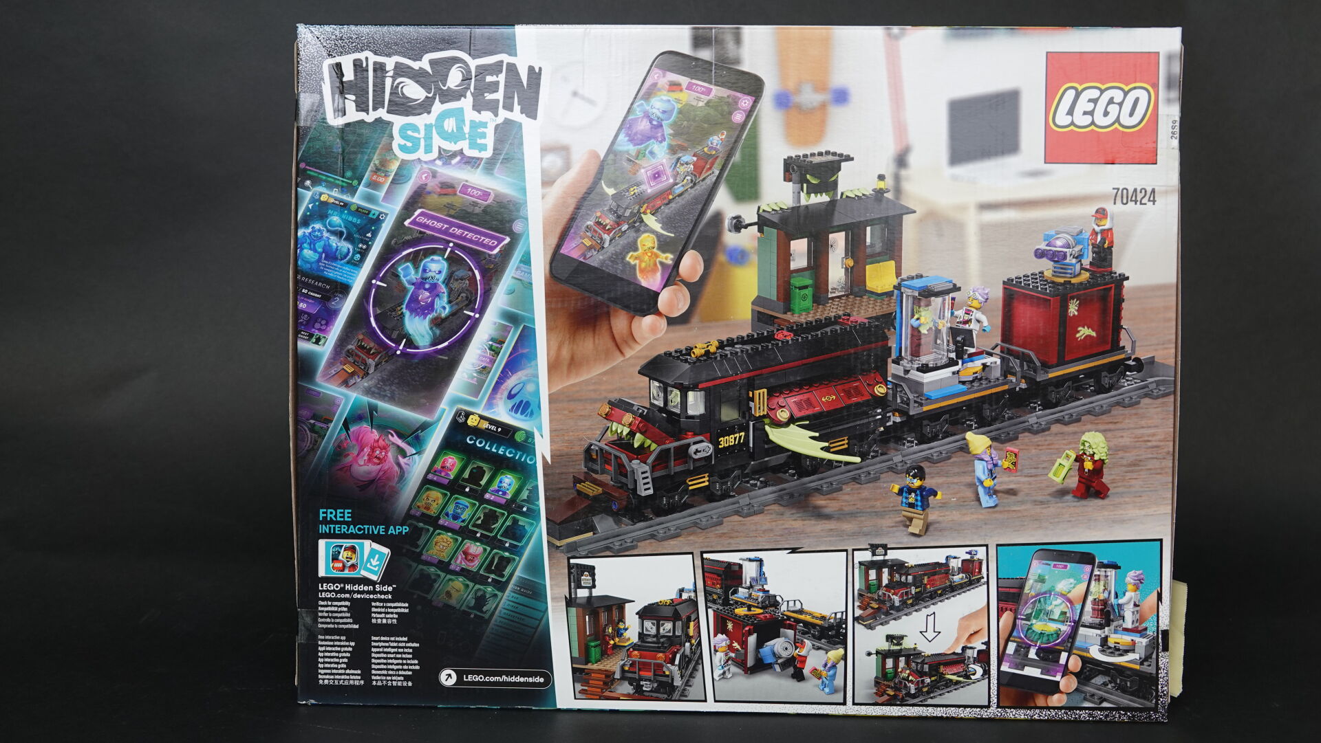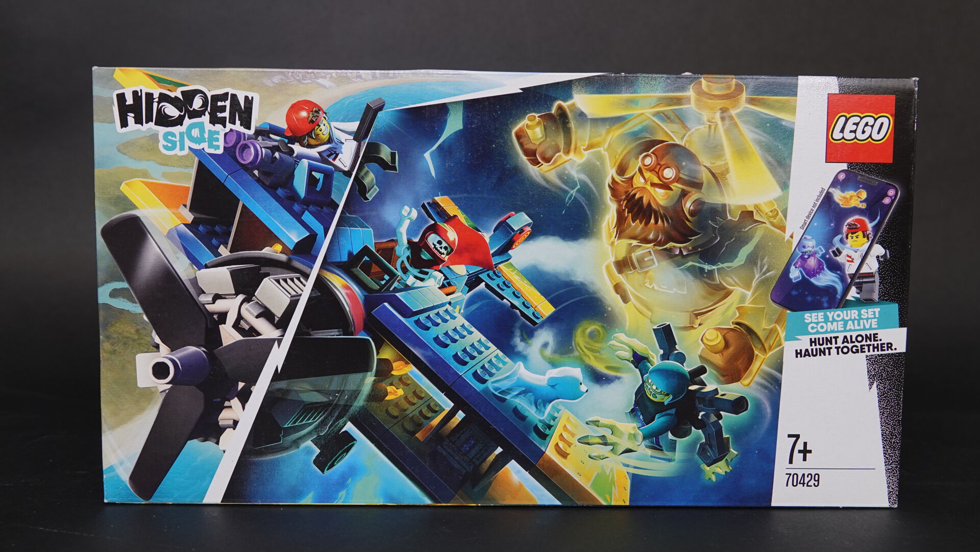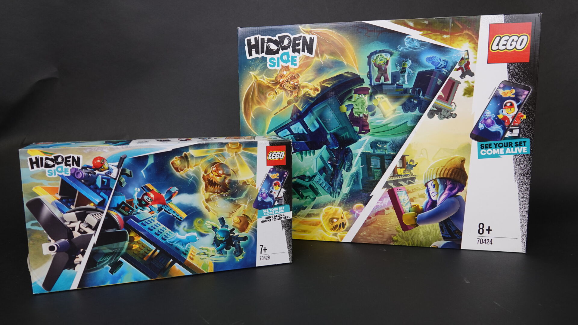 LEGO. Collection "Hidden side" réunion de deux boîtes (non ouvertes, légers enfoncements), comprenant : - boîte n° 70424 "Ghost train express" Haut. : 37,5 cm - Larg. : 48 cm - boîte n° 70429 "El Fuego stunt plane" Haut. : 19 cm - Larg. : 35 cm