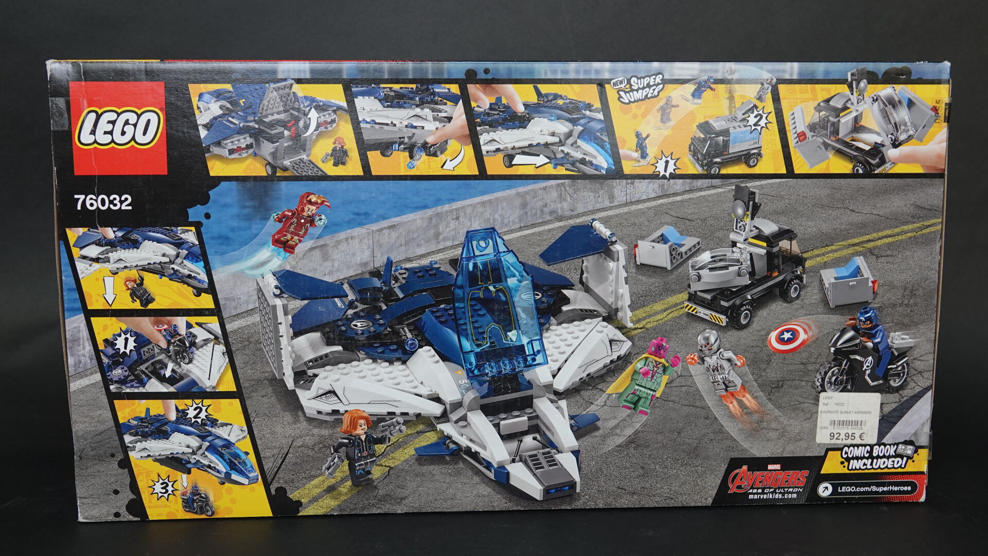 LEGO. Collection "MARVEL Super heroes", boîte n° 76032 "The Avengers Quinjet city chase" (boîte ouverte, sachets fermés non collationnés, légers enfoncements). Haut. : 28 cm - Larg. : 54 cm
