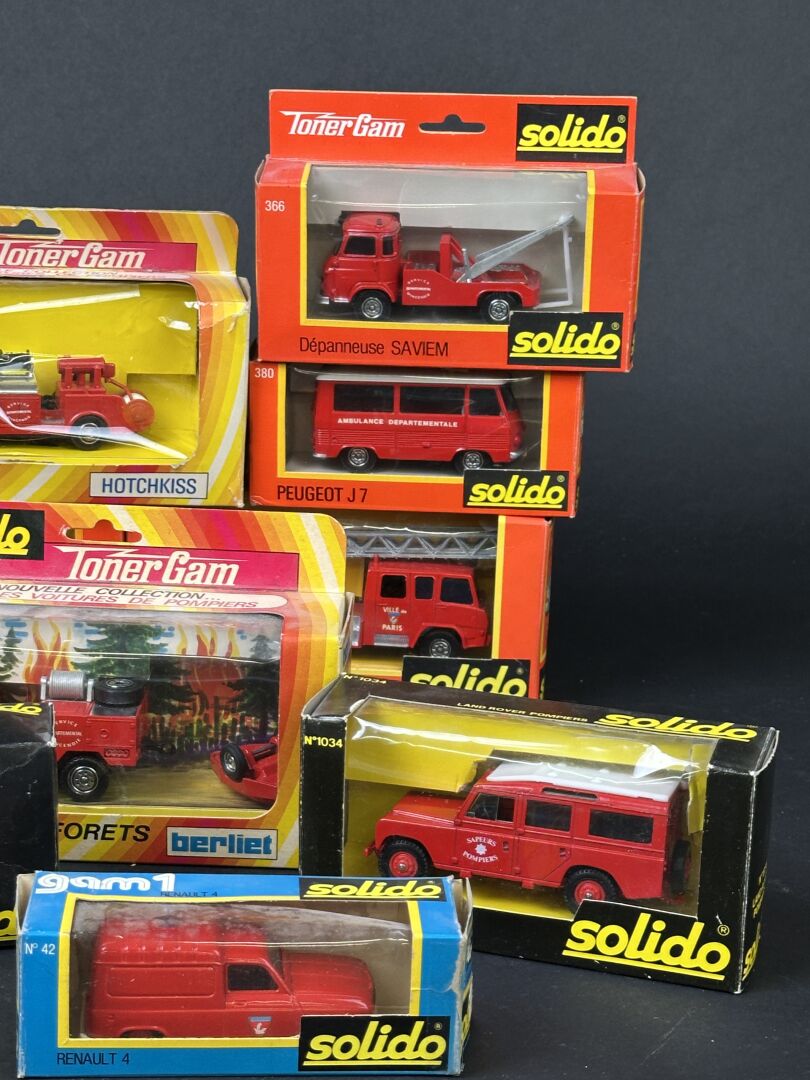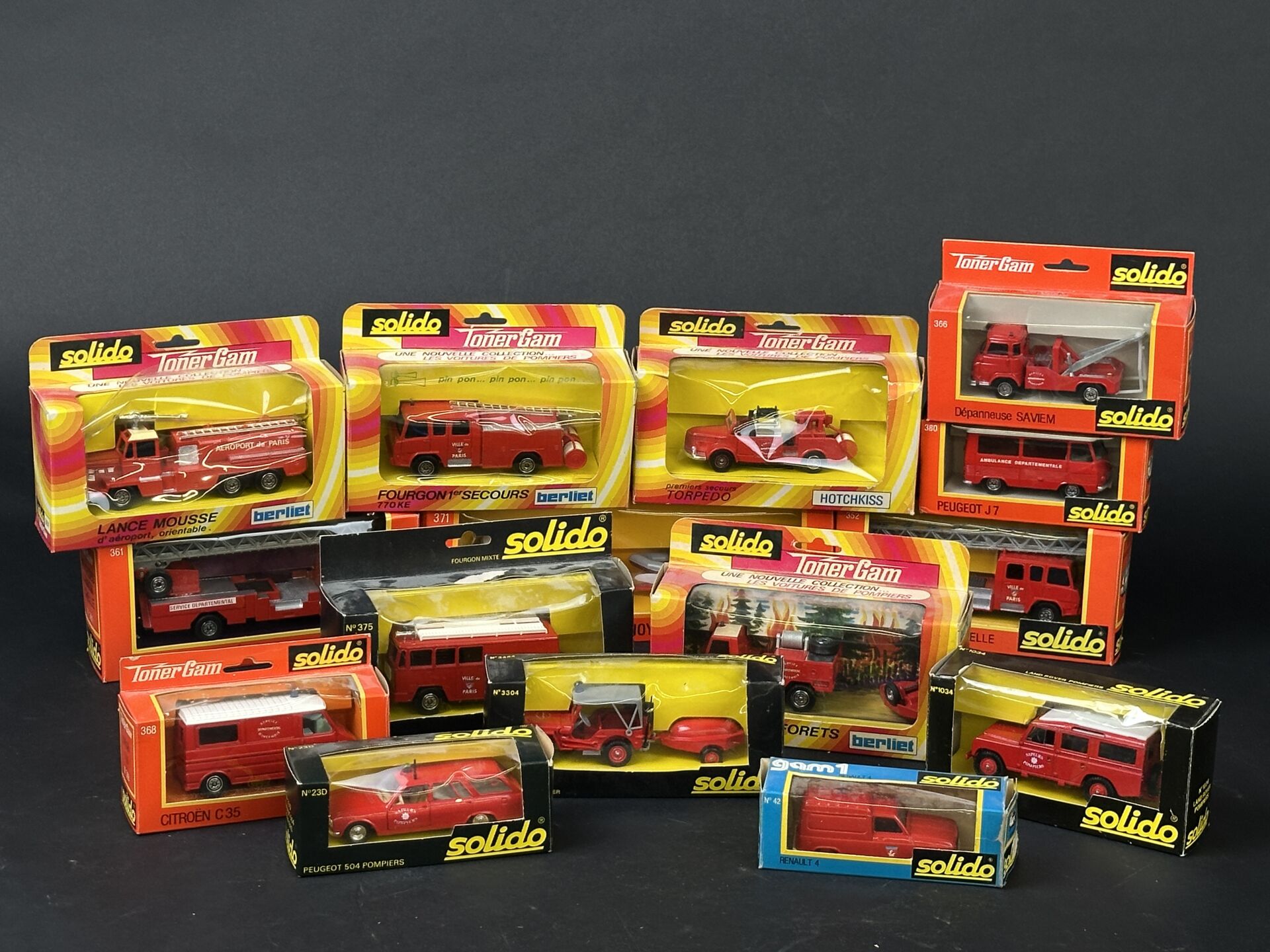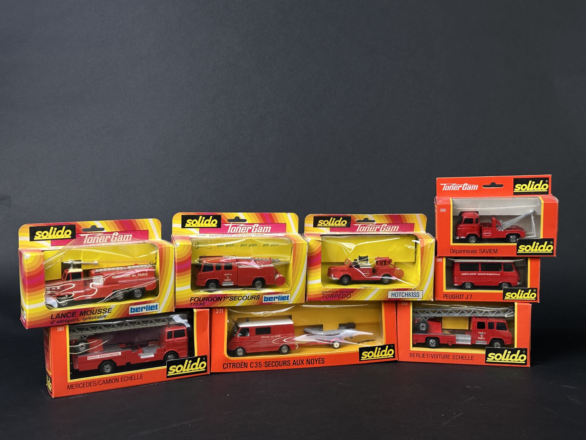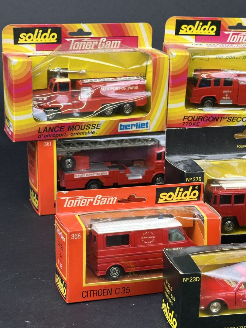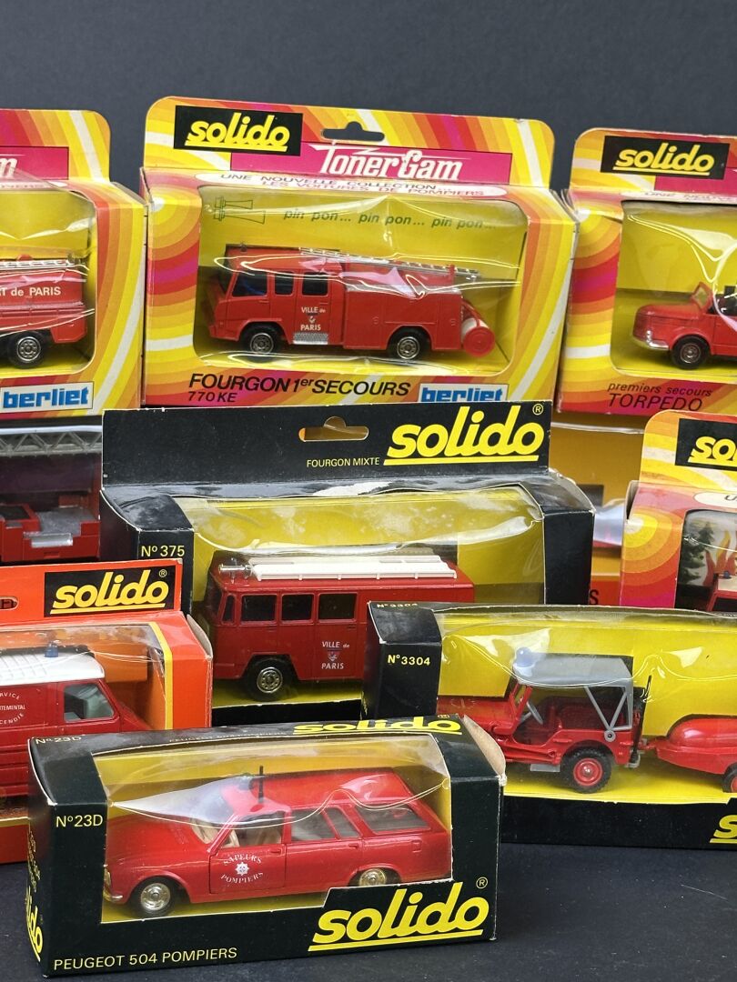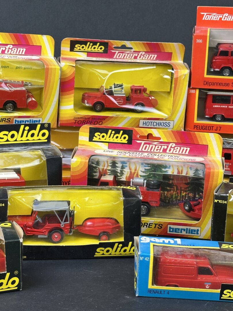 1/43ème, SOLIDO collection Toner GAM et divers lot de 15 véhicules incendies, pompiers, pour tous type d'interventions Très bel état en boites d'origines. Expertise réalisée par Monsieur Stanislas LEMOINE.