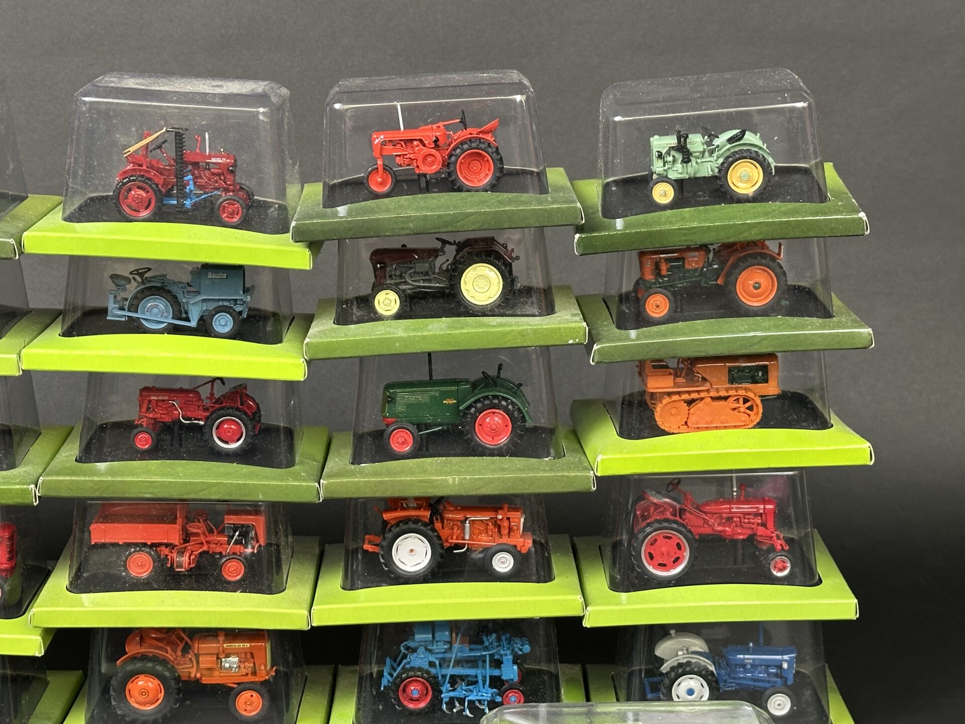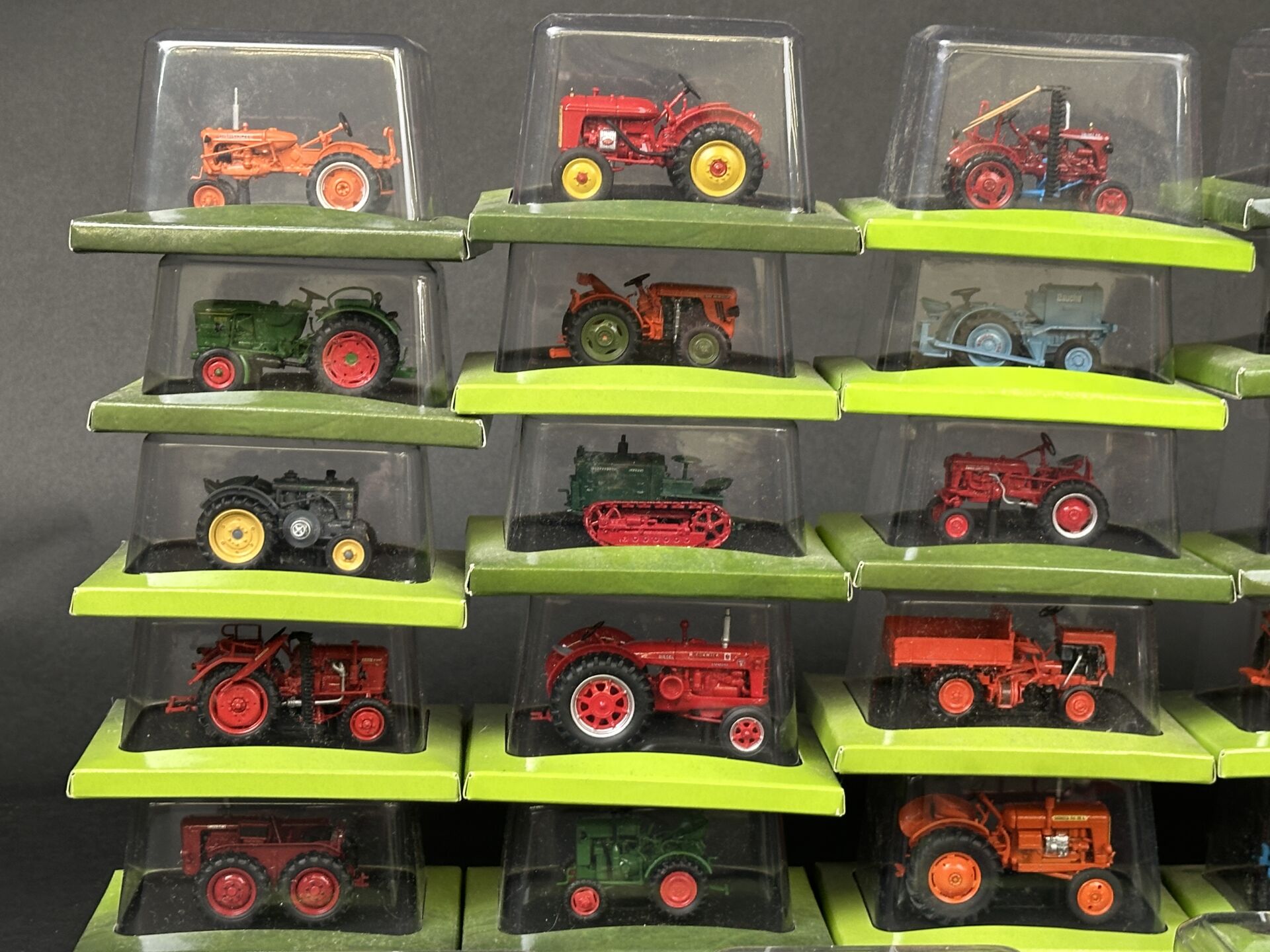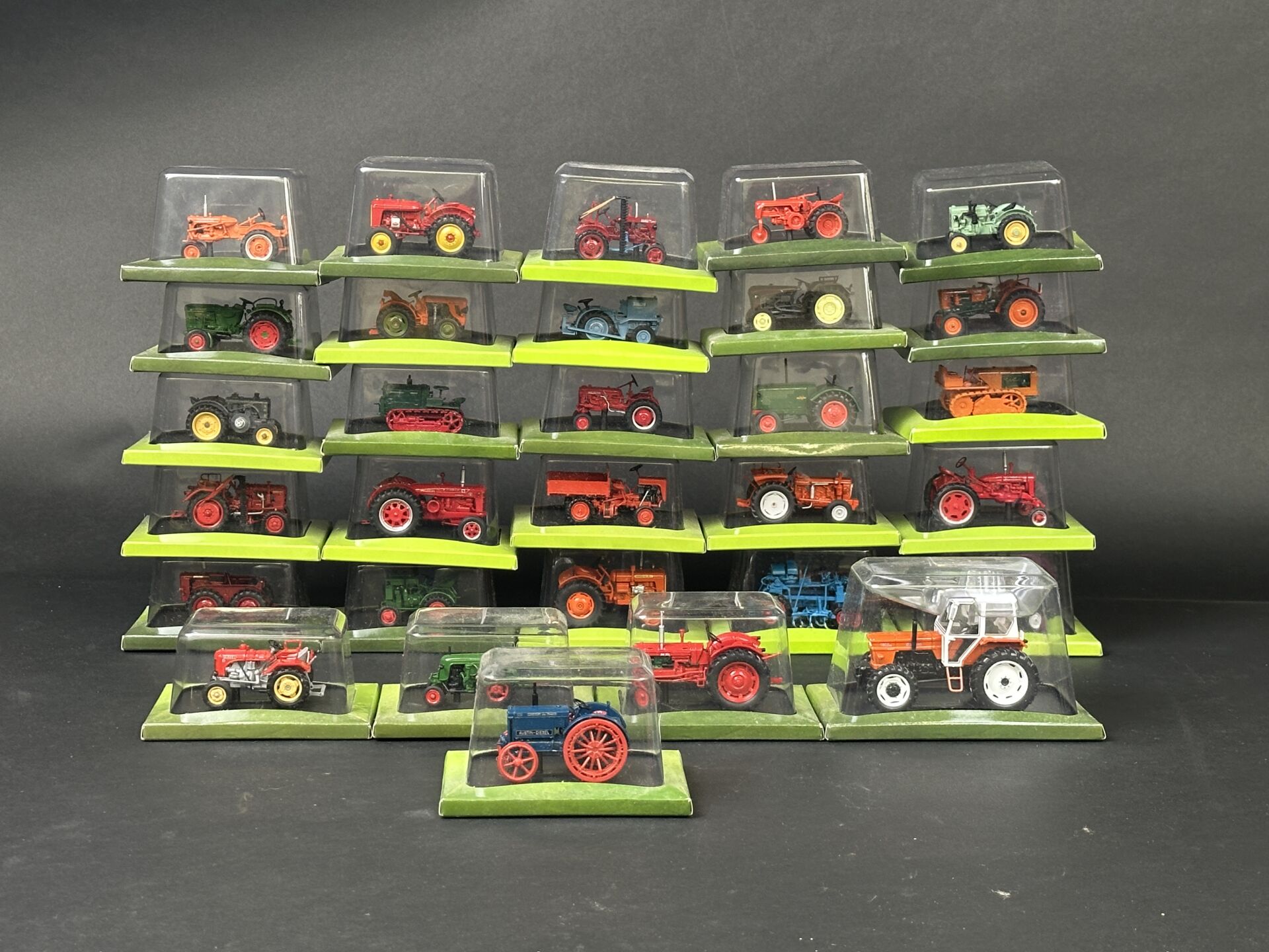 1/43ème HACHETTE collection lot de 30 tracteurs, matériels agricole. Etat neuf en boites d'origines. Expertise réalisée par Monsieur Stanislas LEMOINE.