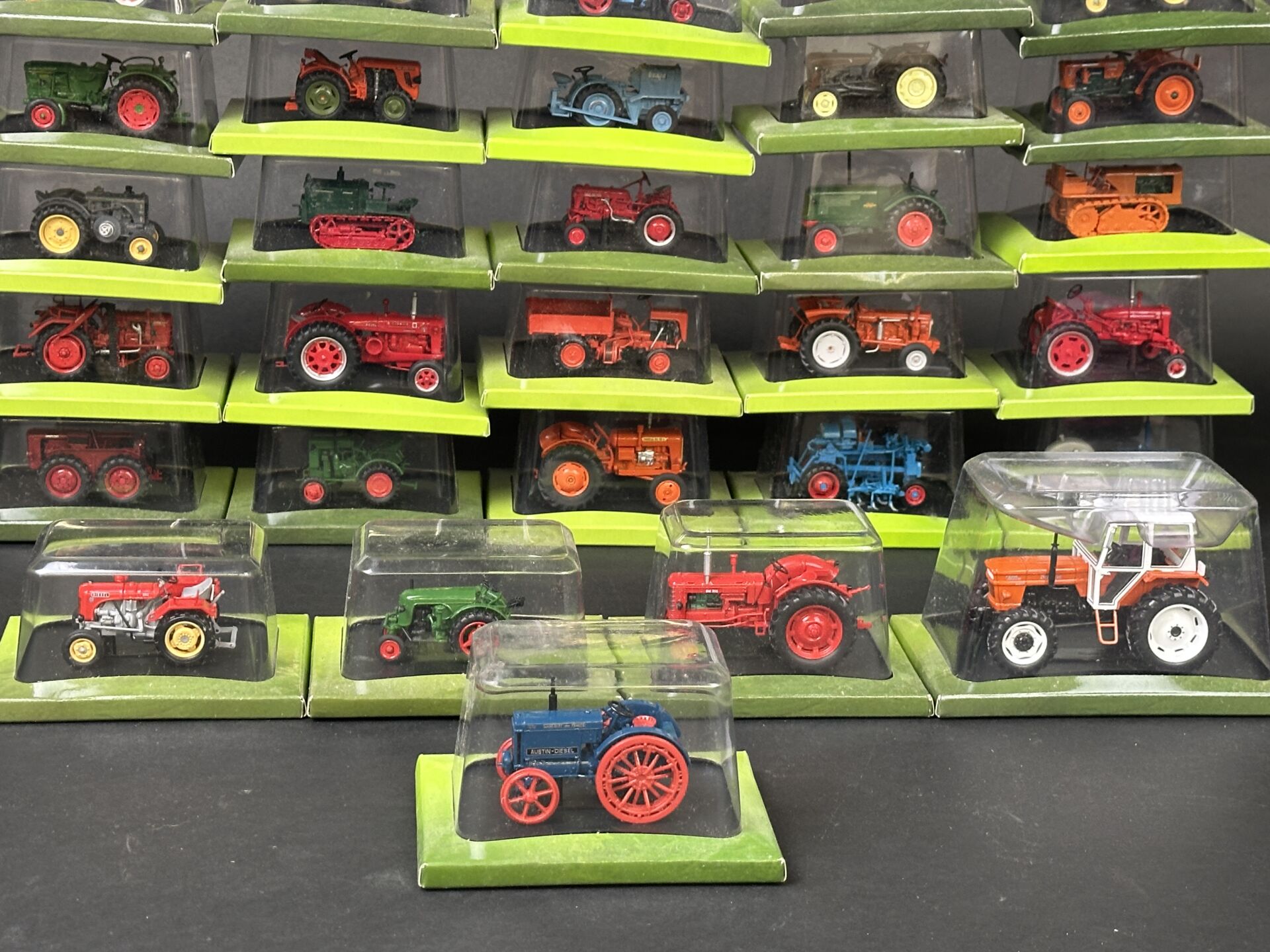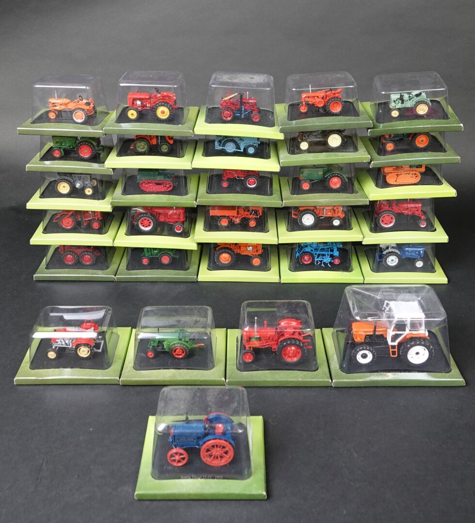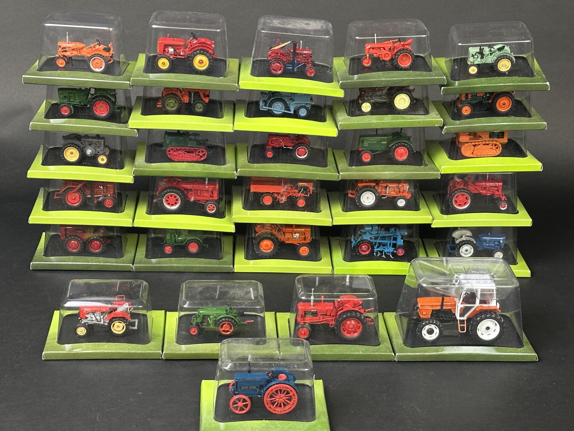 1/43ème HACHETTE collection lot de 30 tracteurs, matériels agricole. Etat neuf en boites d'origines. Expertise réalisée par Monsieur Stanislas LEMOINE.