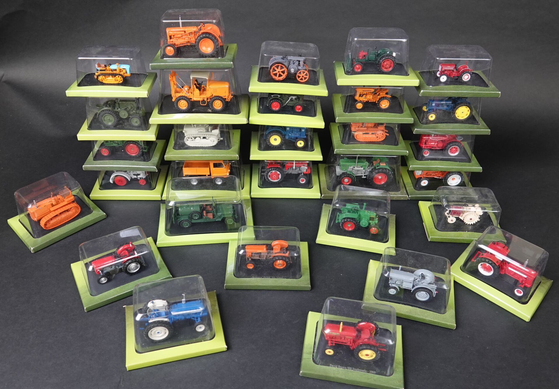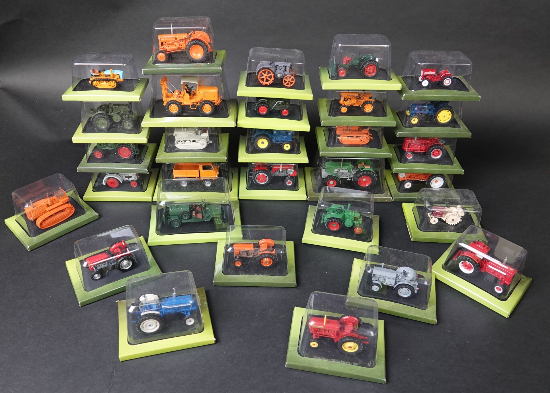1/43ème HACHETTE collection lot de 30 tracteurs, matériels agricole. Etat neuf en boites d'origines. Expertise réalisée par Monsieur Stanislas LEMOINE.