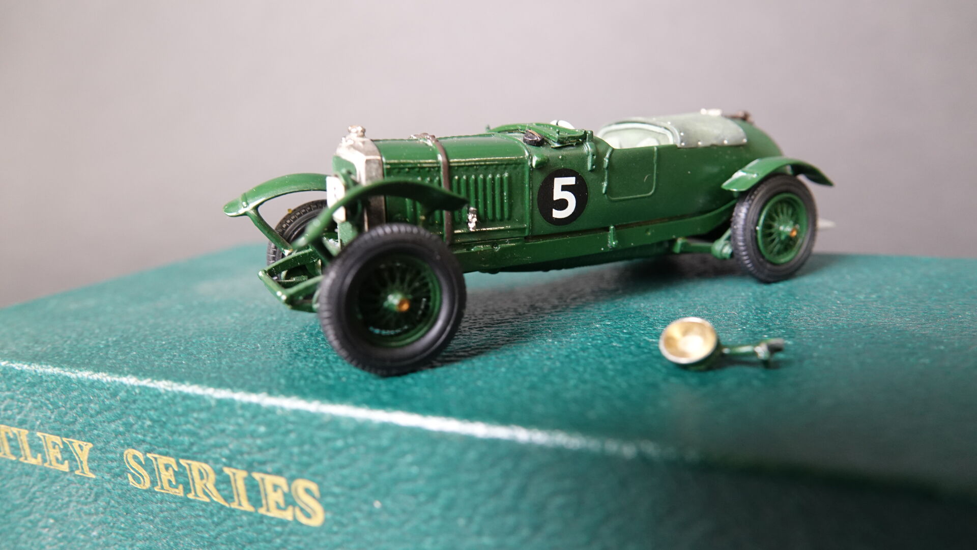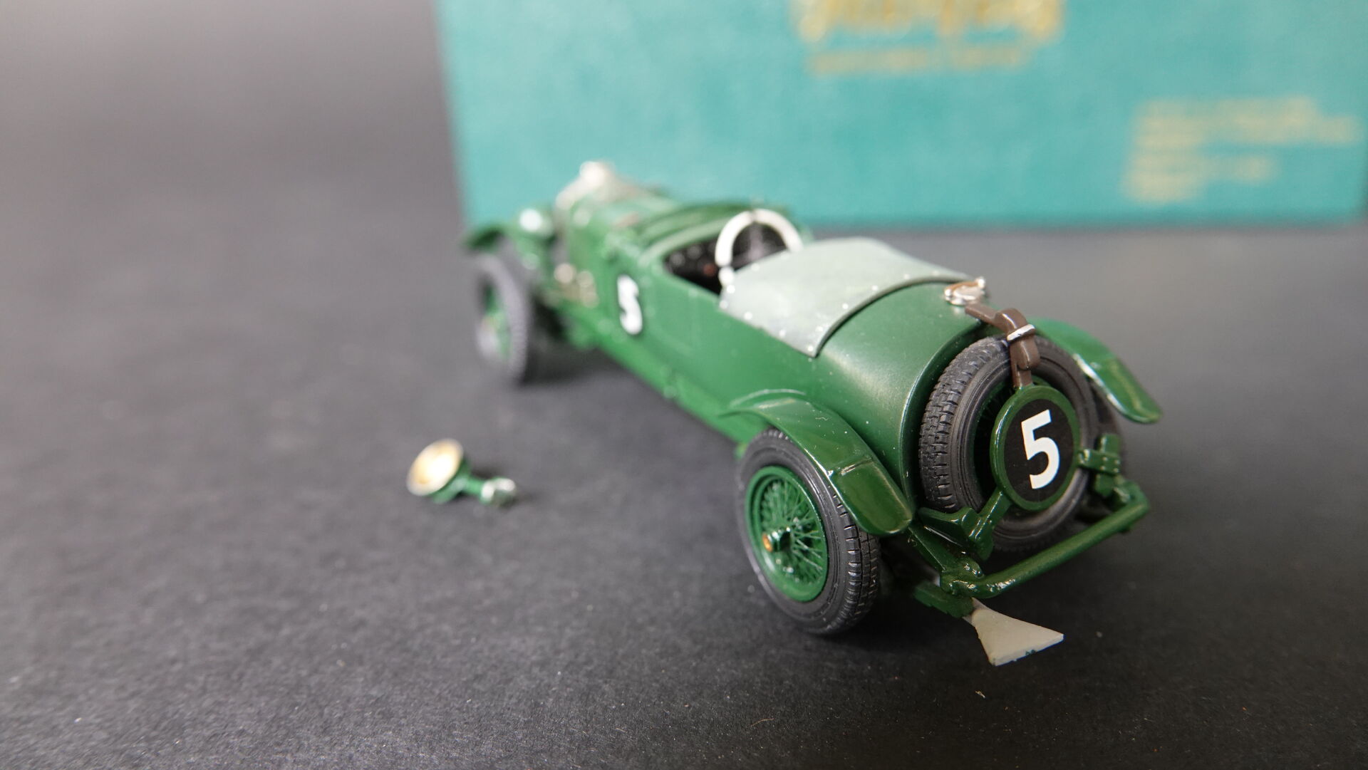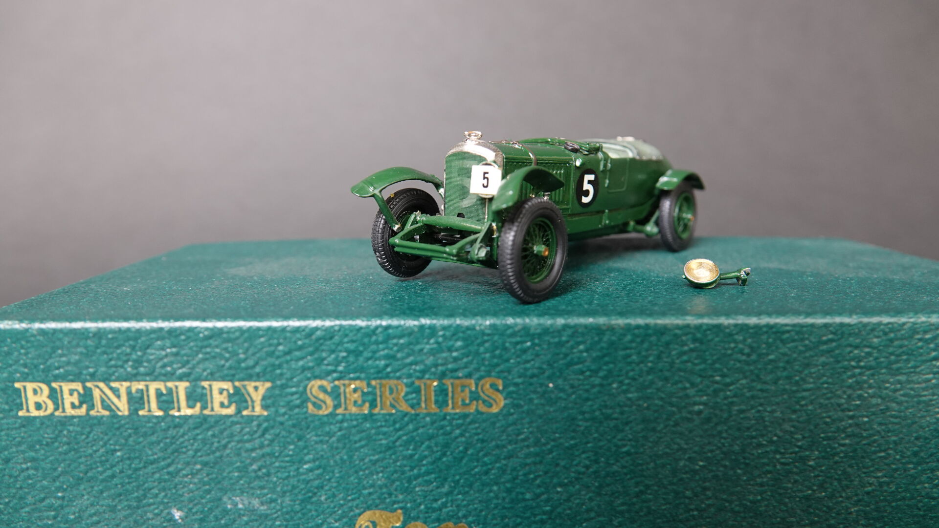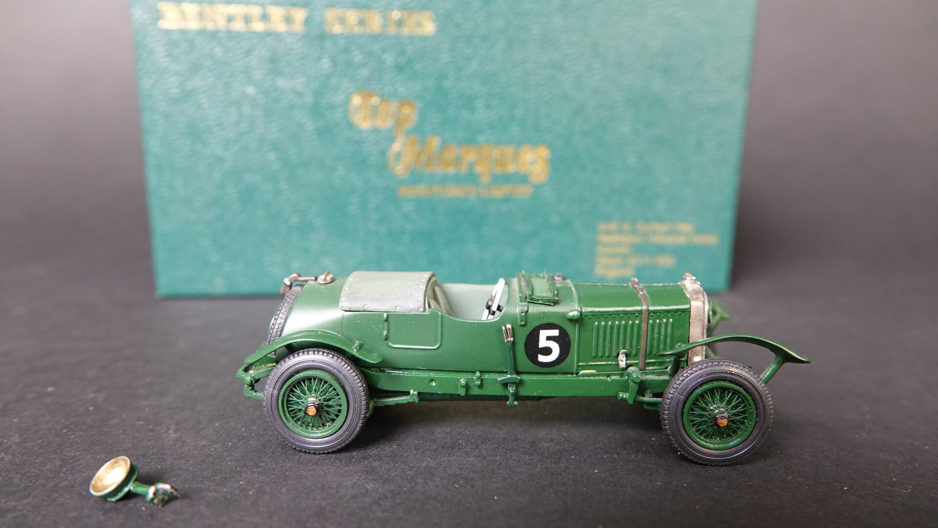 1/43ème TOP MARQUES, Coffret contenant 1 Bentley séries Bobtail 4,5l 1928 numéro 5, en livrée verte, édition limitée à 15 exemplaires numérotée 11, à signaler : fixation à l'avant et un phare à refixer sinon très bel état en boîte d'origine. Expertise réalisée par Monsieur Stanislas LEMOINE.