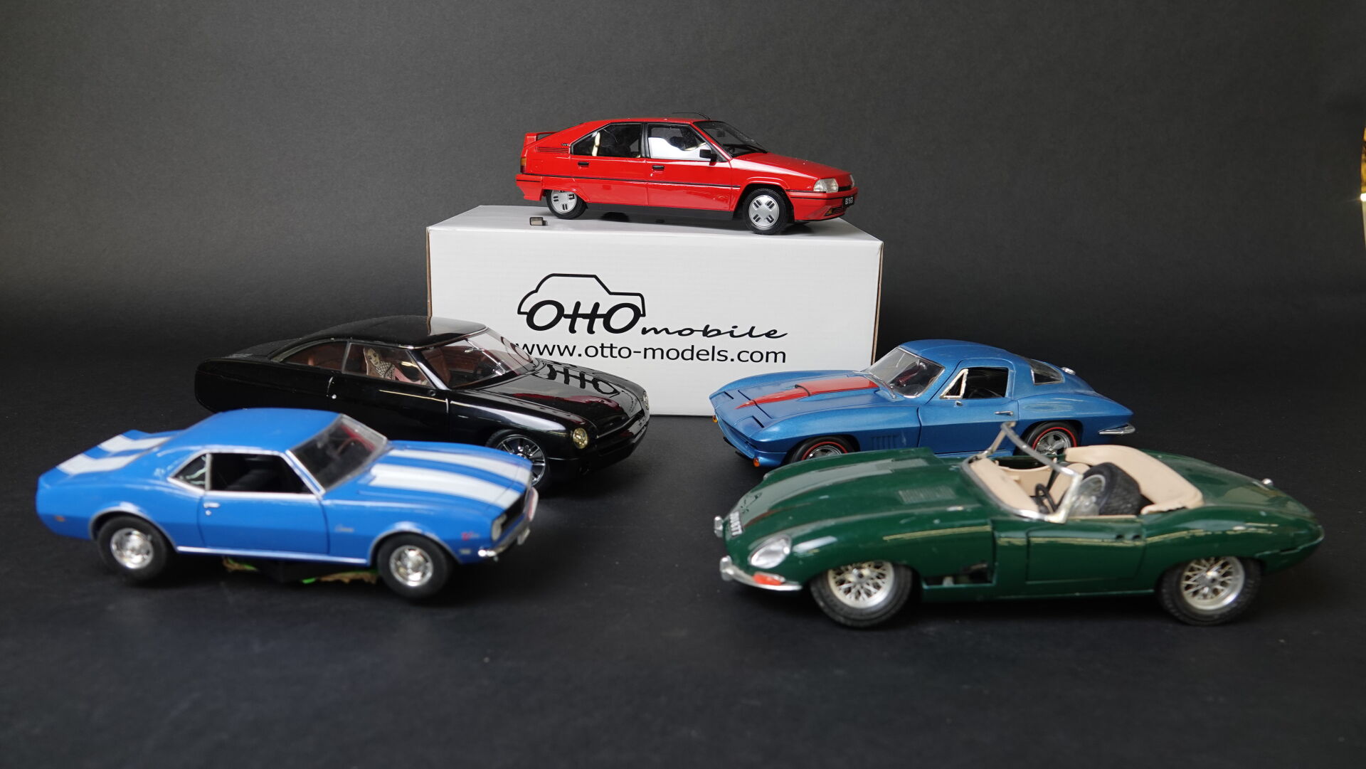 1/18ème OTTO Mobile, AUTOART, ERTL, BURAGO et 1/24ème lot de 5 véhicules dont Citroën BX19 GTI édition à 1500 exemplaires portant le numéro 110 très bon état en boîte d'origine (rétroviseur gauche à recoller) référence OTO 025UVI, Ford Forty nine, Chevrolet Corvette, Jaguar type E cabriolet (mauvais état) et Camaro. Etat d'usage. Expertise réalisée par Monsieur Stanislas LEMOINE.