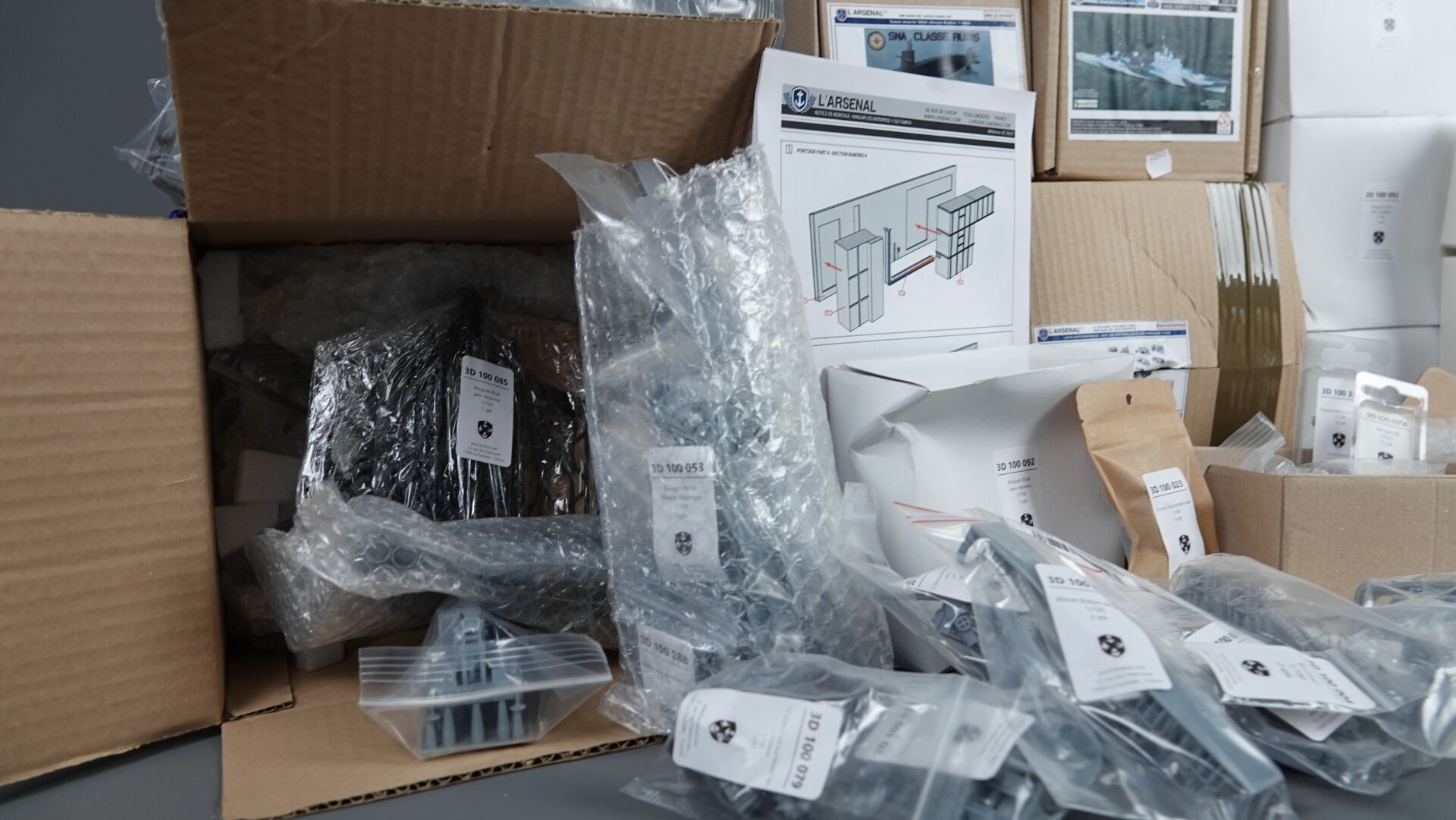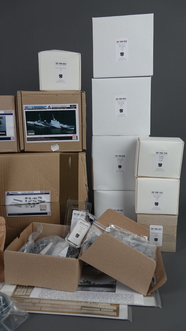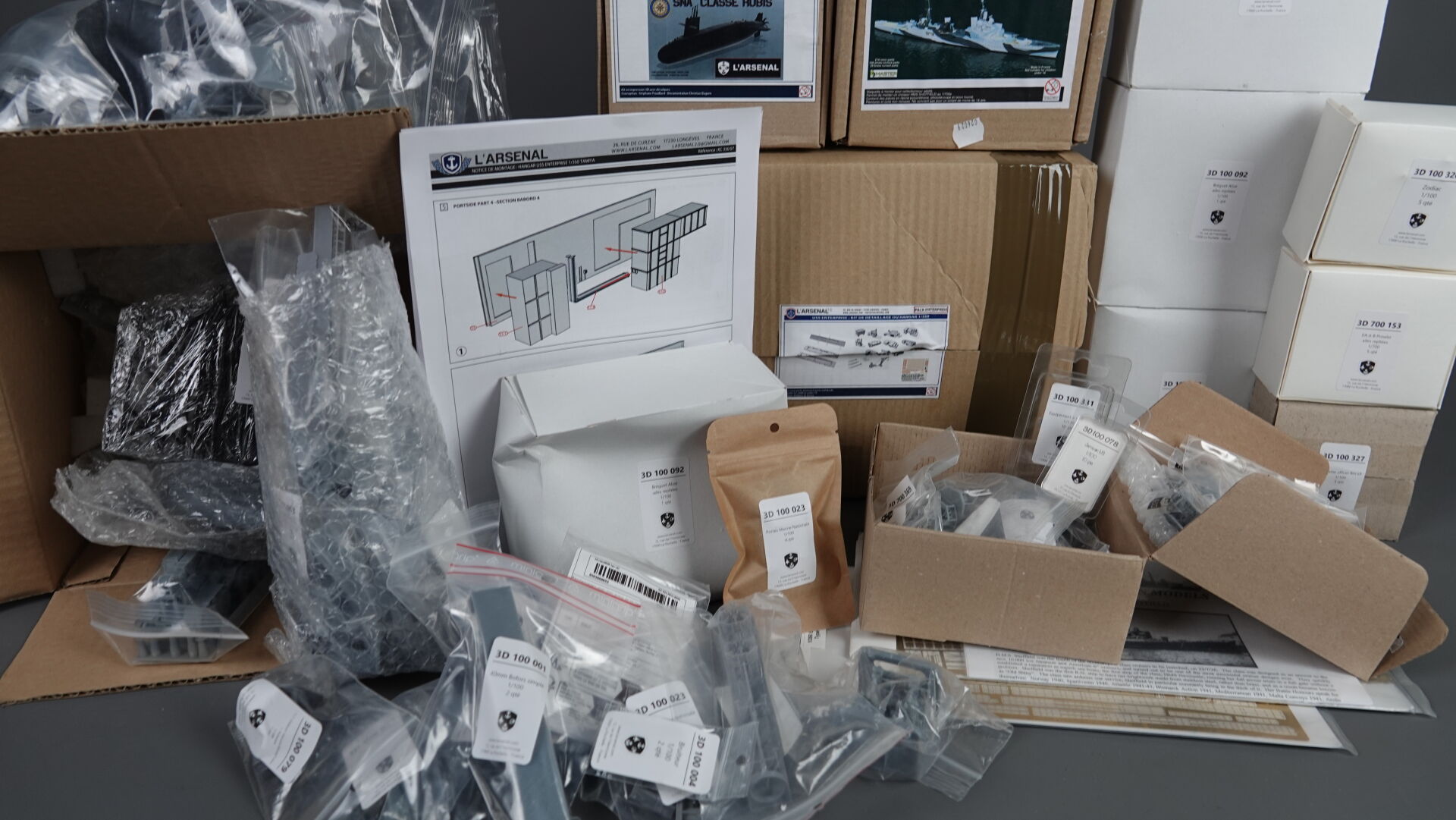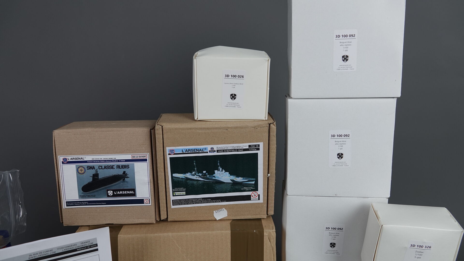 1/400ème, 1/700ème et divers- - L'ARSENAL.COM gros lot de maquettes imprimées 3D à monter (bâtiments portuaires, bateaux, sous-marin, croiseur Shefield) état neuf sous blister. Voir photos. Etat neuf de stock. Expertise réalisée par Monsieur Stanislas LEMOINE.