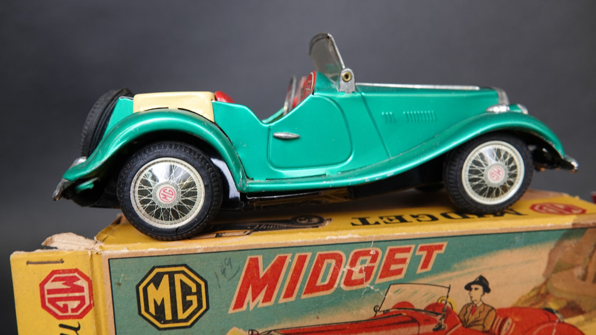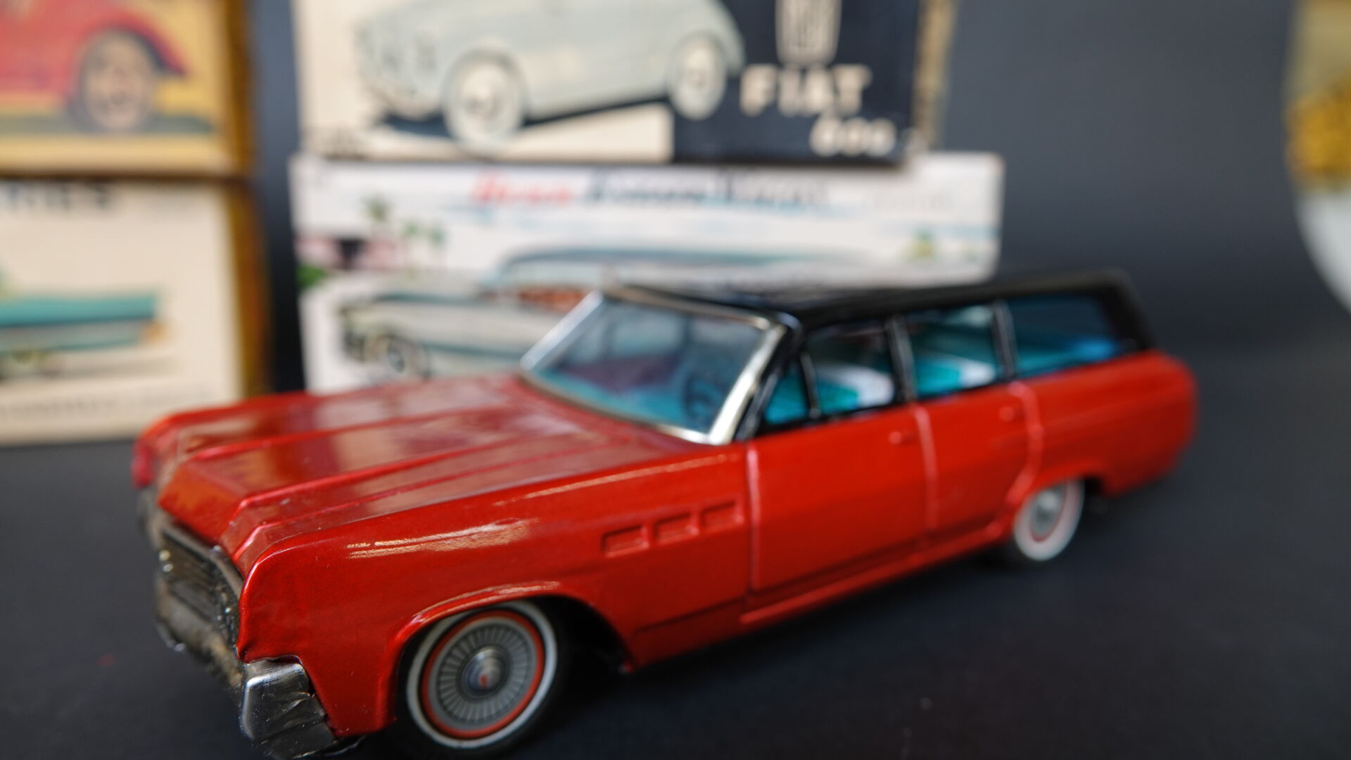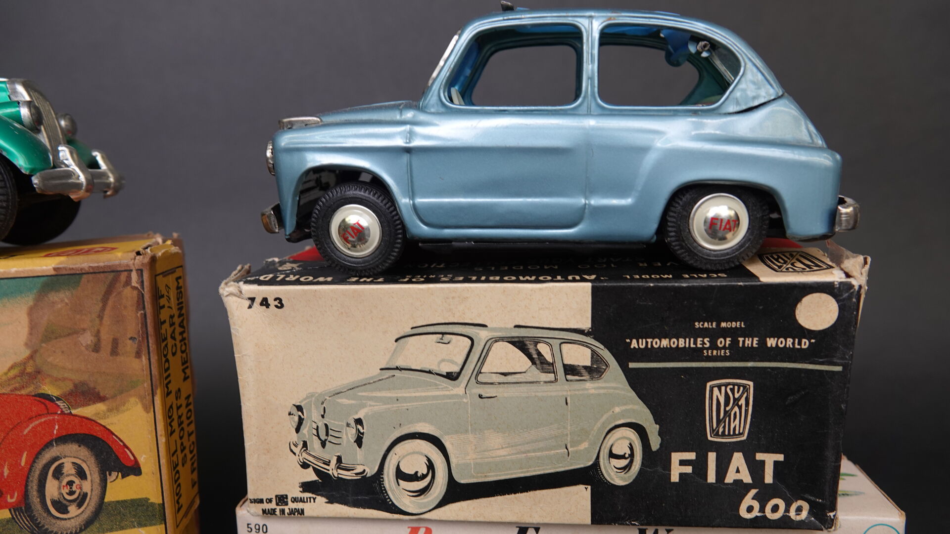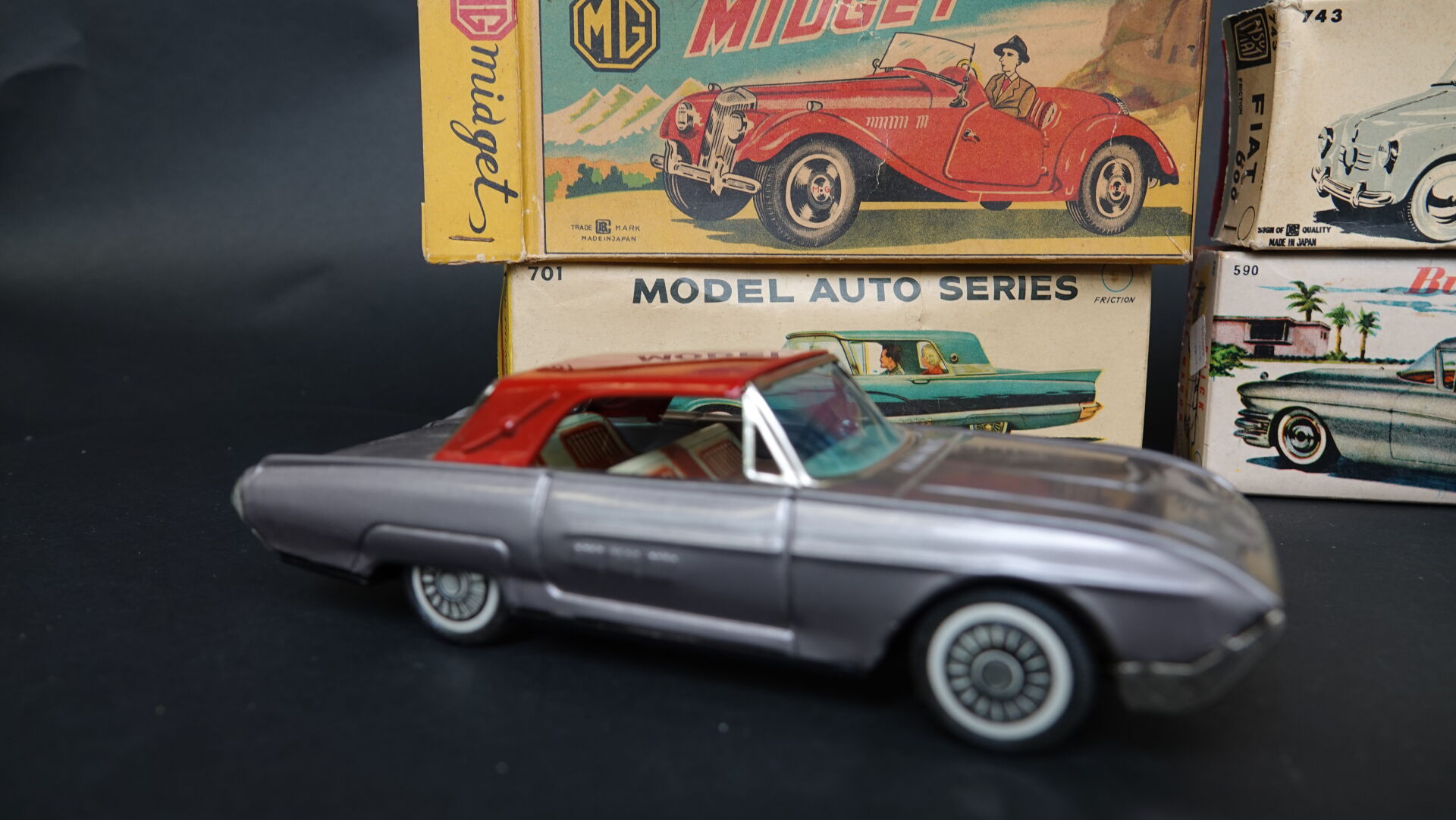 B Japan lot de 4 voitures en tôle à friction en boîtes d'origine dont une Fiat 600, une Ford Thunderbird, une MG Midget et une Buick Estate Wagon, bel état. Expertise réalisée par Monsieur Stanislas LEMOINE.