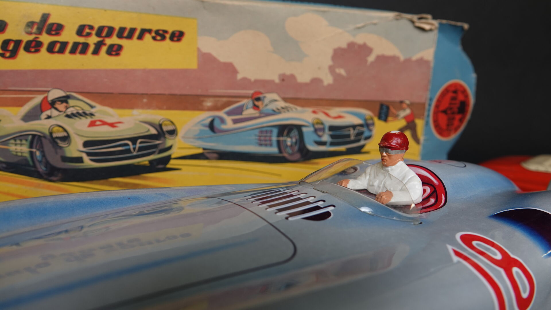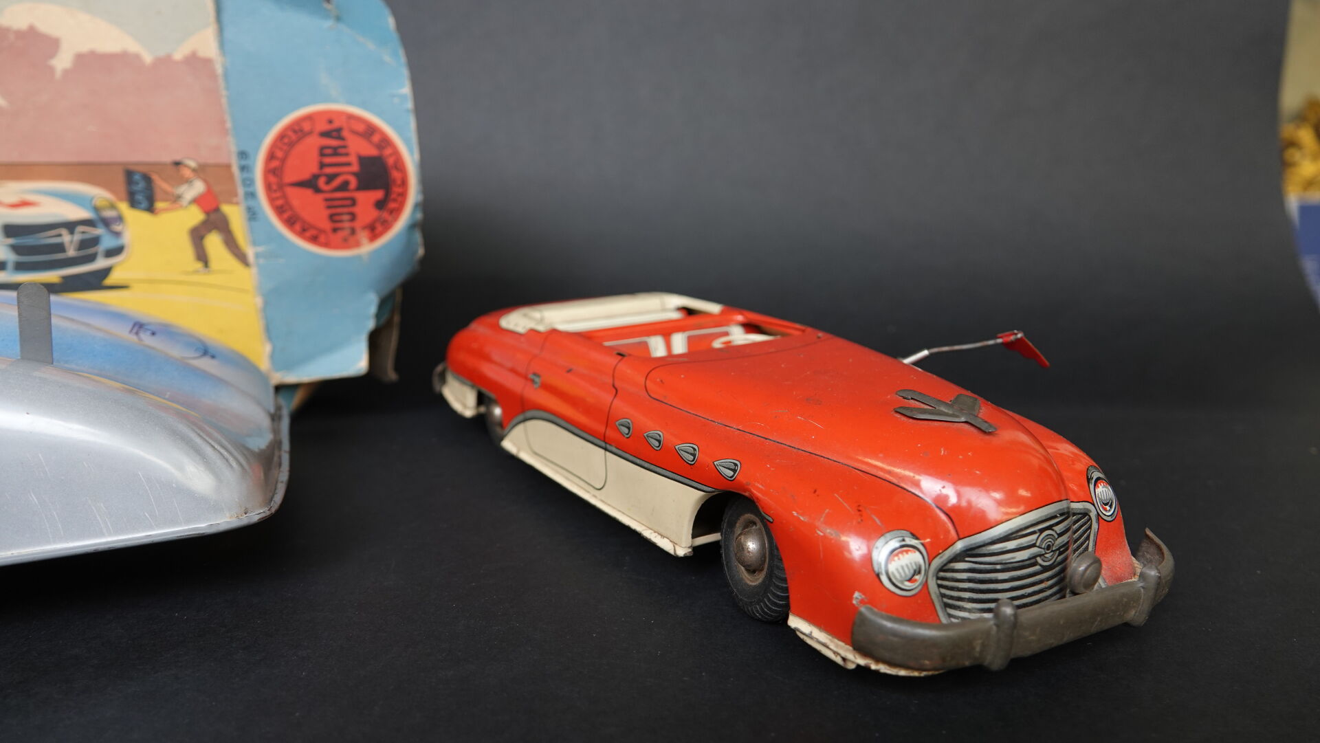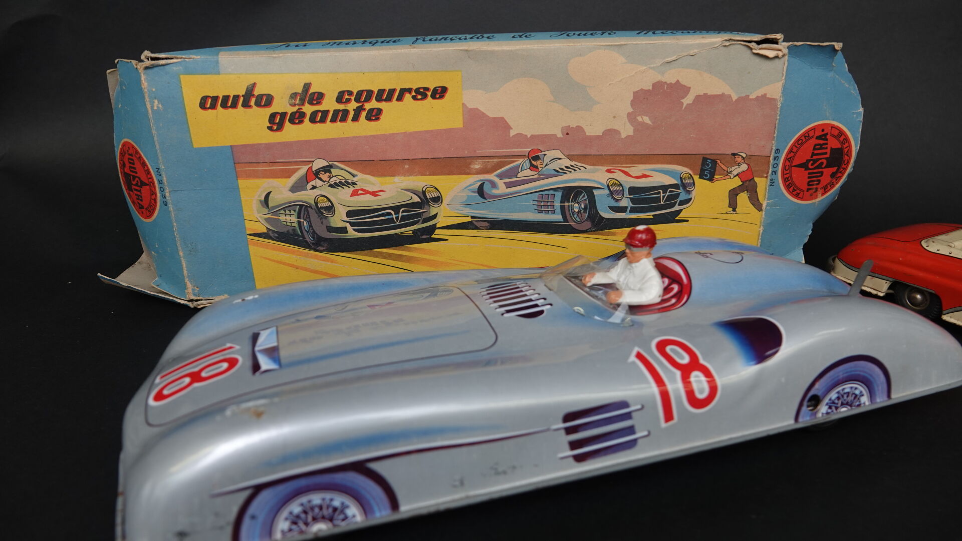 JOUSTRA lot de 2 véhicules dont grande Mercedes F1 mécanique en tôle lithographiée dans sa boîte d'origine, long. : 41 cm (boîte défraîchie, déchirures) référence 2039 et une américaine électrique en tôle lithographiée (accidentée, manques) long. : 29 cm. Expertise réalisée par Monsieur Stanislas LEMOINE.