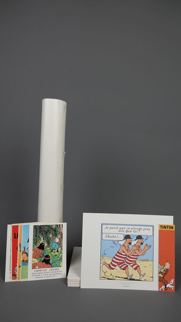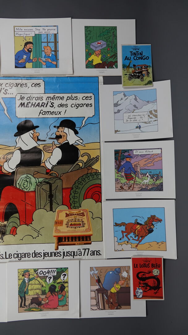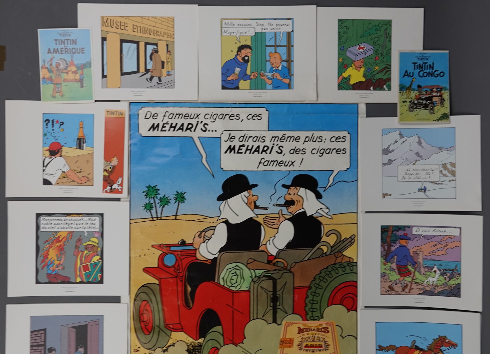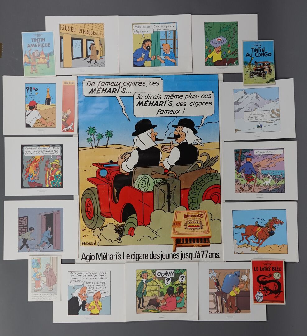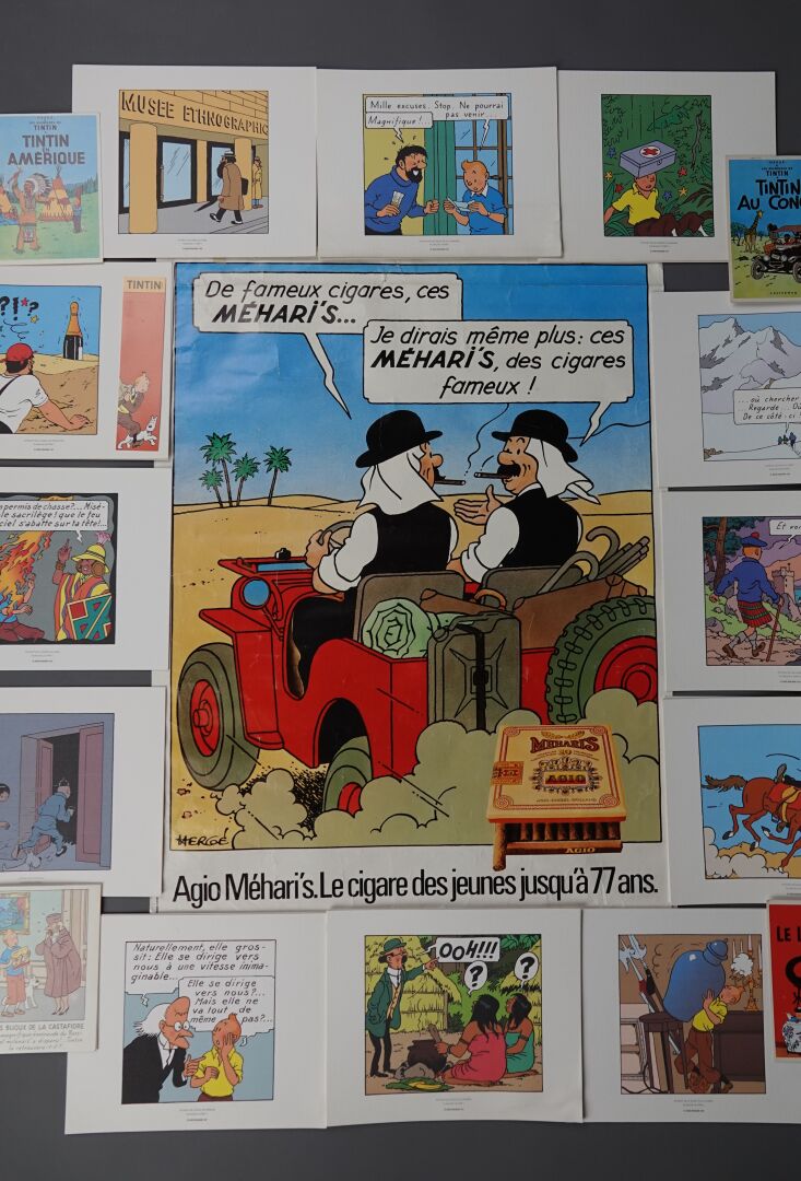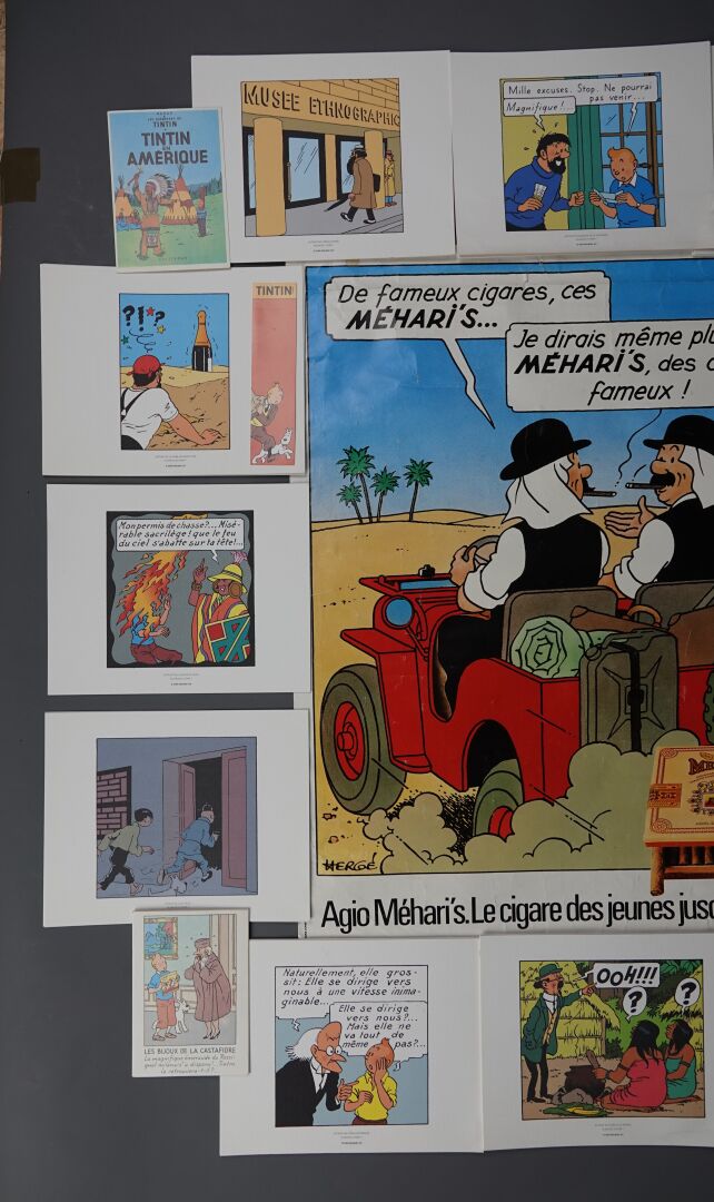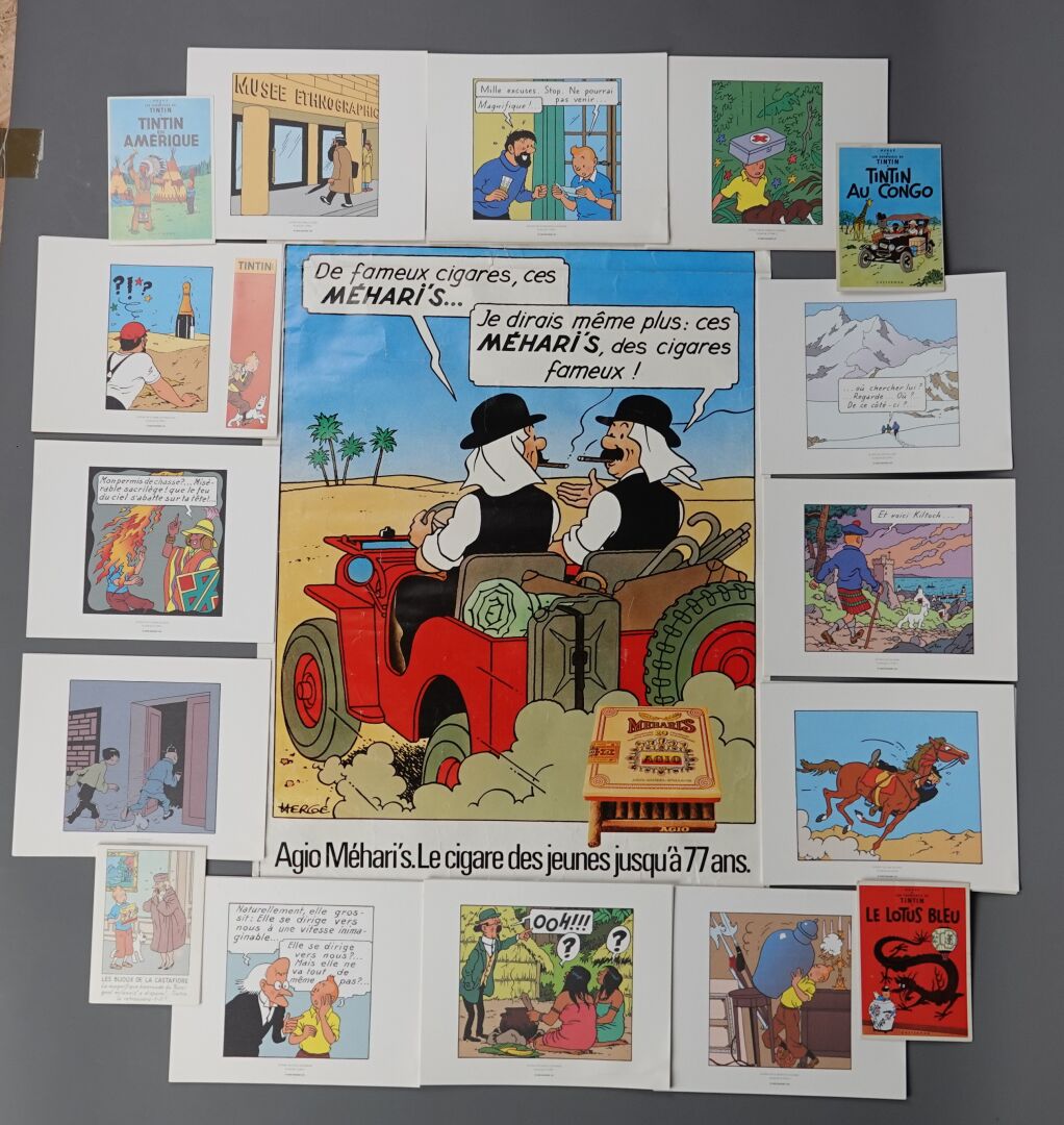 TINTIN d'après l'œuvre d'Hergé, lot divers dont affiche publicitaire MEHARI'S, éditions HAVAS CONSEIL représentant les DUPONDT dans le désert fumant un cigare de chez MEHARI'S 69 x 50 cm ; 6 cartes postales éditions 1984 CASTERMAN ; ensemble d'environ 60 extraits de planches édité par RG MOULINSART 2011 19,5 x 24,5 cm. Etat d'usage. Expertise réalisée par Monsieur Stanislas LEMOINE.