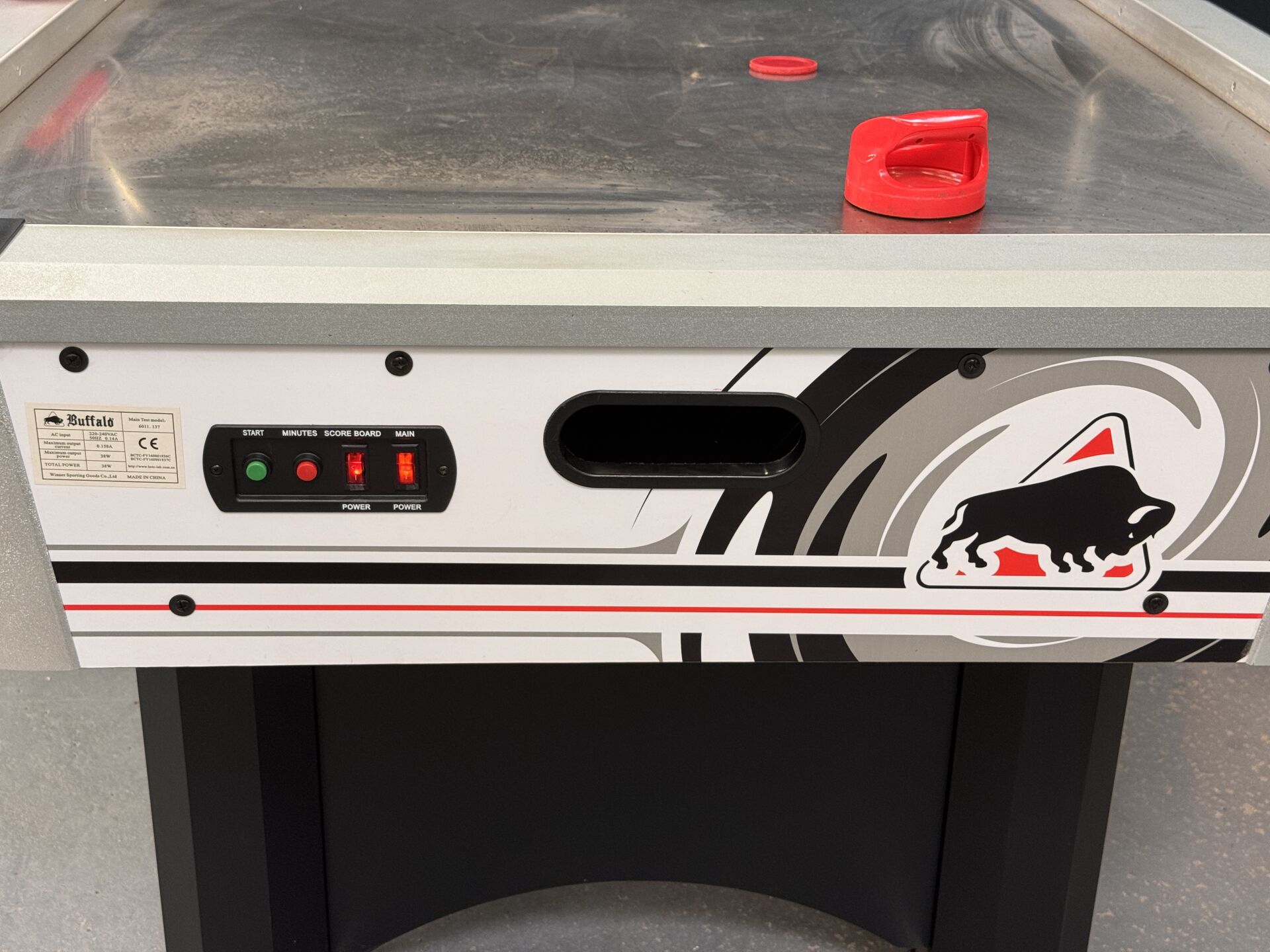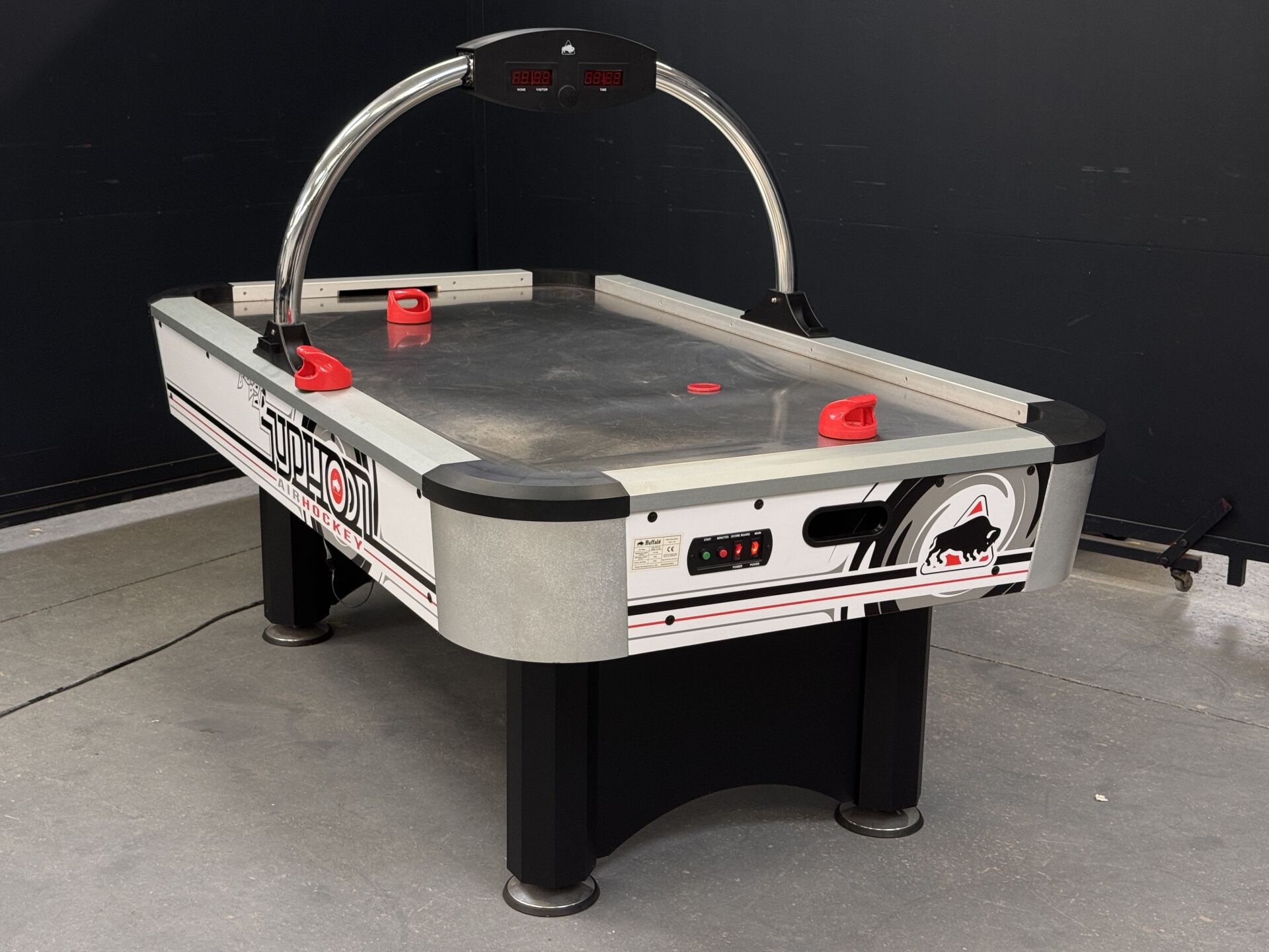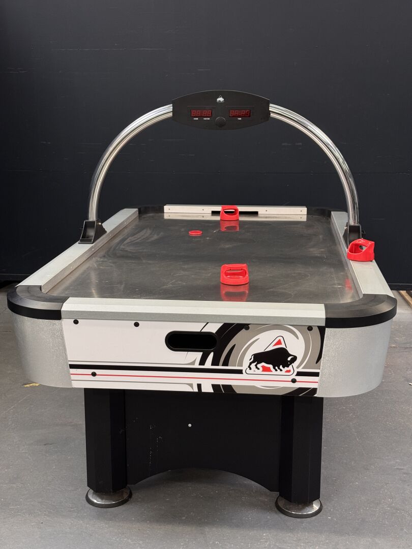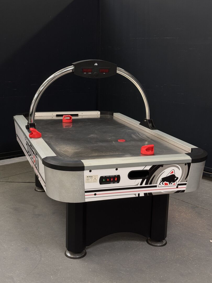 Table de air-hockey BUFFALO TYPHOON dimension 2m15 x 1m23 x 1m33, test d'allumage effectué avec succès (on note cependant un dysfonctionnement sur l'affichage du tableau des scores). LOT VENDU SUR DESIGNATION, EXPOSITION ET ENLEVEMENT 24 RUE DU MARCHE COMMUN 44300 NANTES SUR RDV.