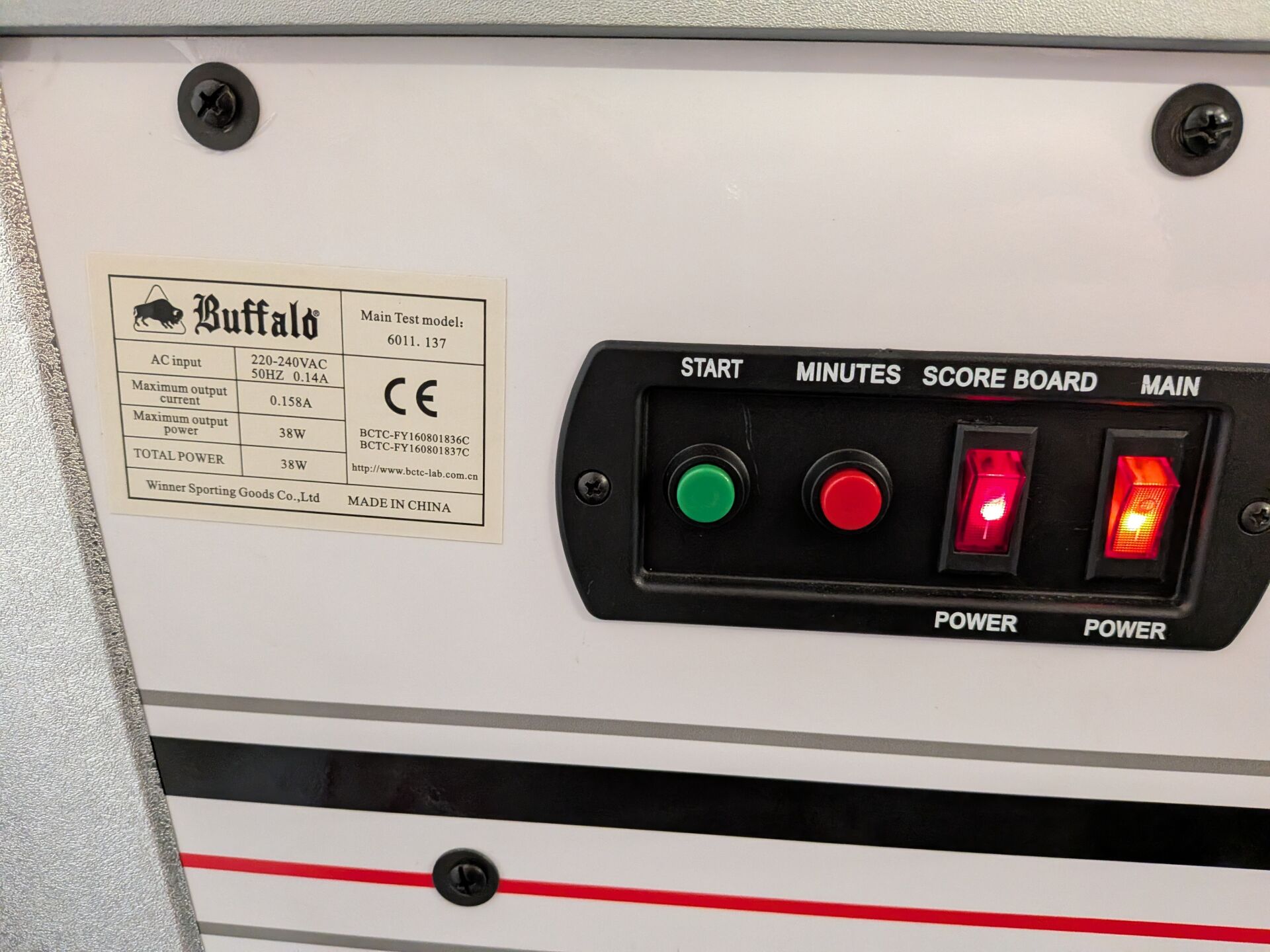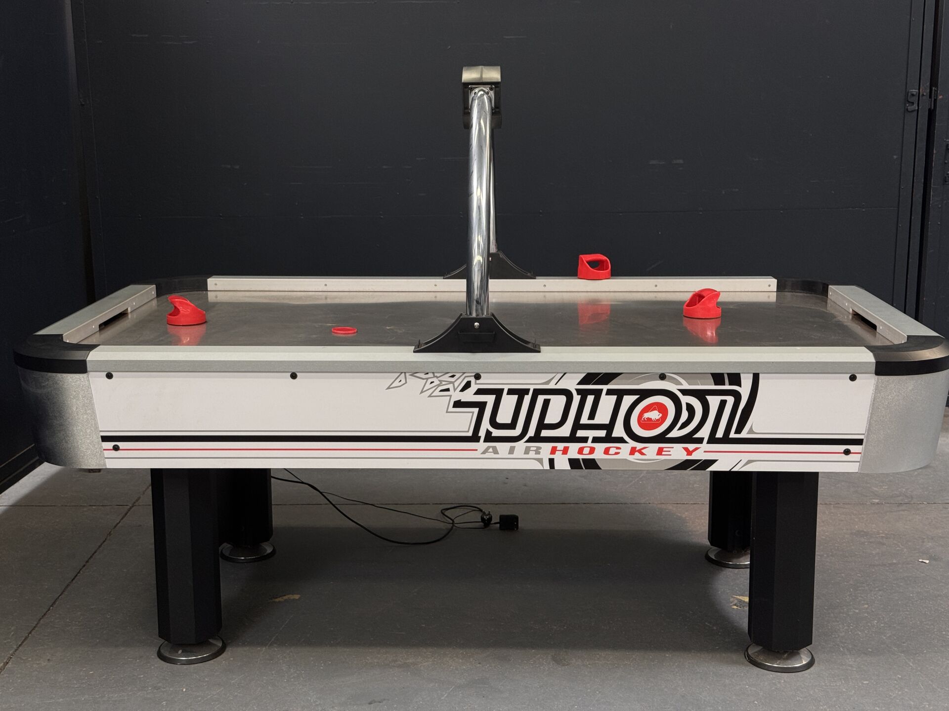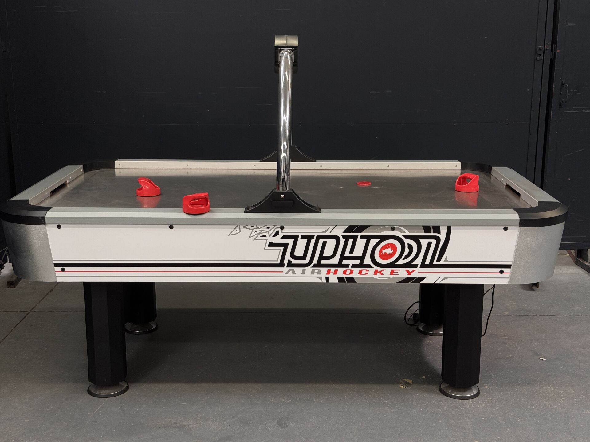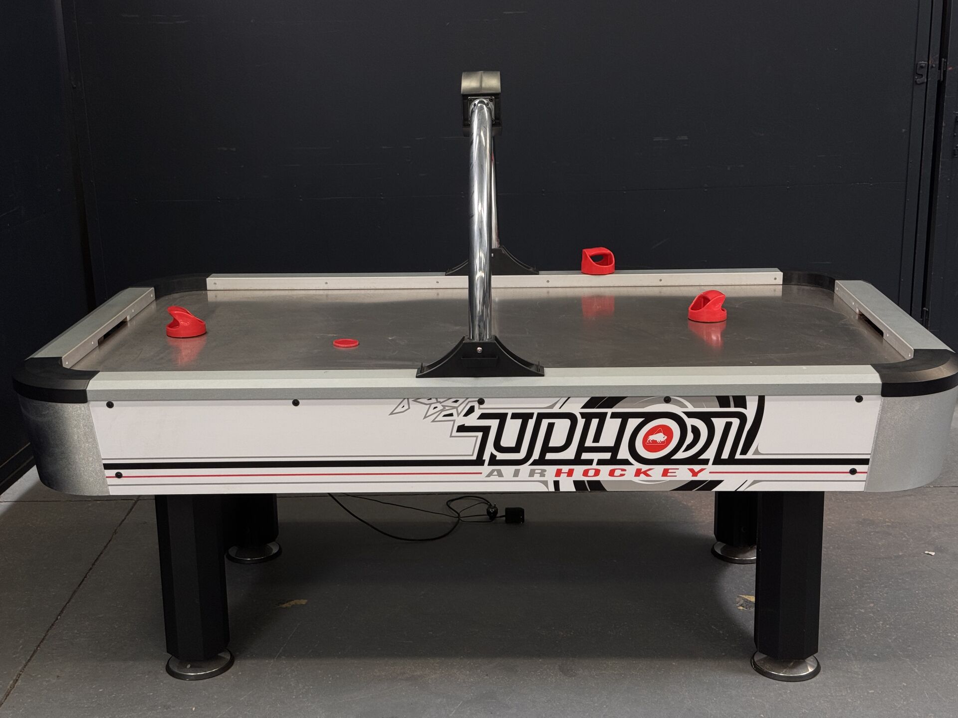 Table de air-hockey BUFFALO TYPHOON dimension 2m15 x 1m23 x 1m33, test d'allumage effectué avec succès (on note cependant un dysfonctionnement sur l'affichage du tableau des scores). LOT VENDU SUR DESIGNATION, EXPOSITION ET ENLEVEMENT 24 RUE DU MARCHE COMMUN 44300 NANTES SUR RDV.