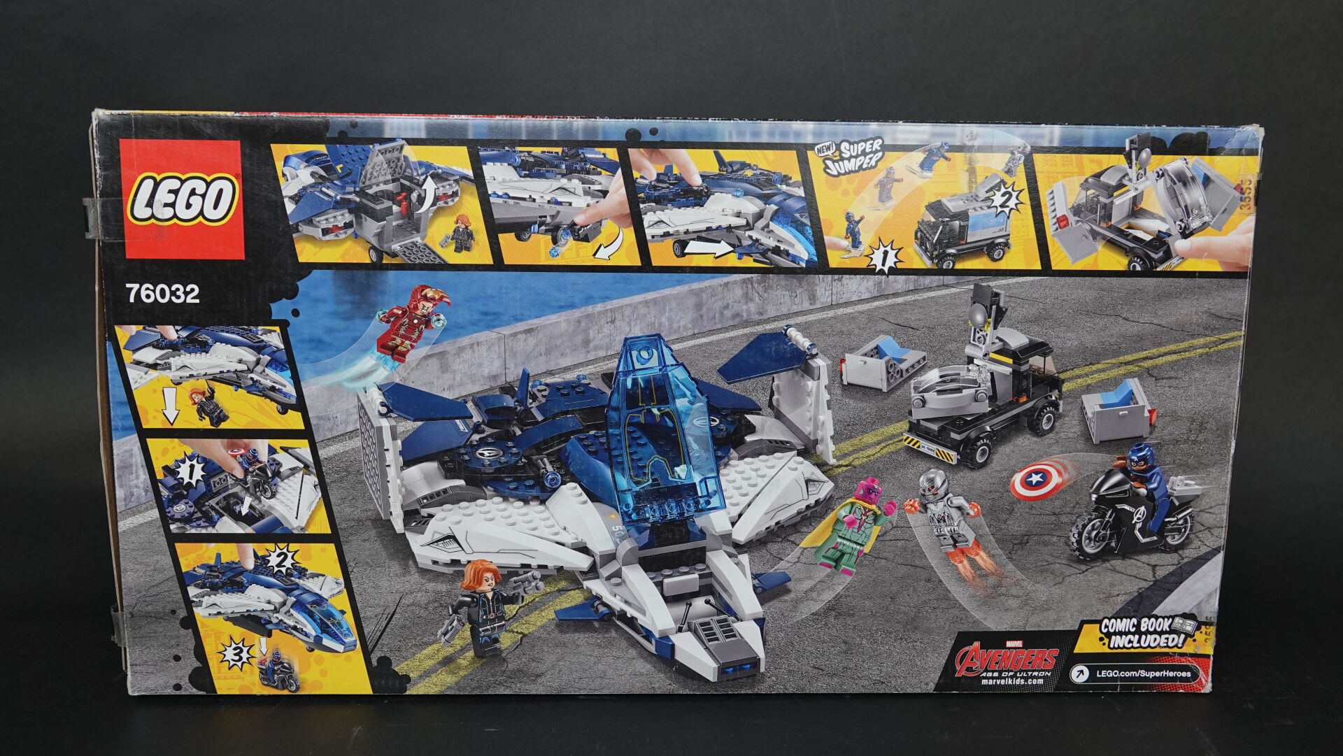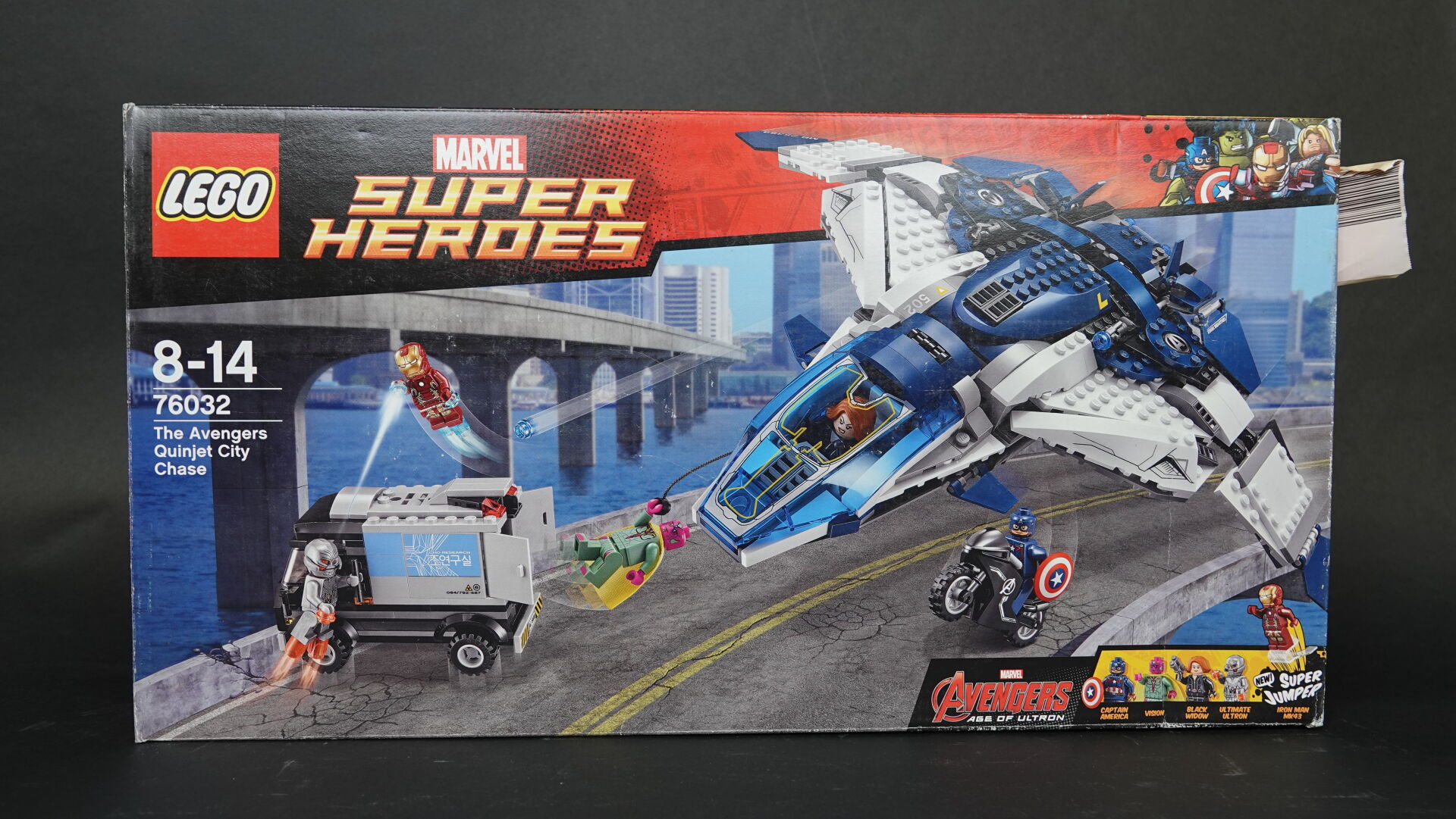 LEGO. Collection "MARVEL Super heroes", boîte n° 76032 "The Avengers Quinjet city chase" (boîte ouverte, sachets fermés non collationnés, légers enfoncements). Haut. : 28 cm - Larg. : 54 cm