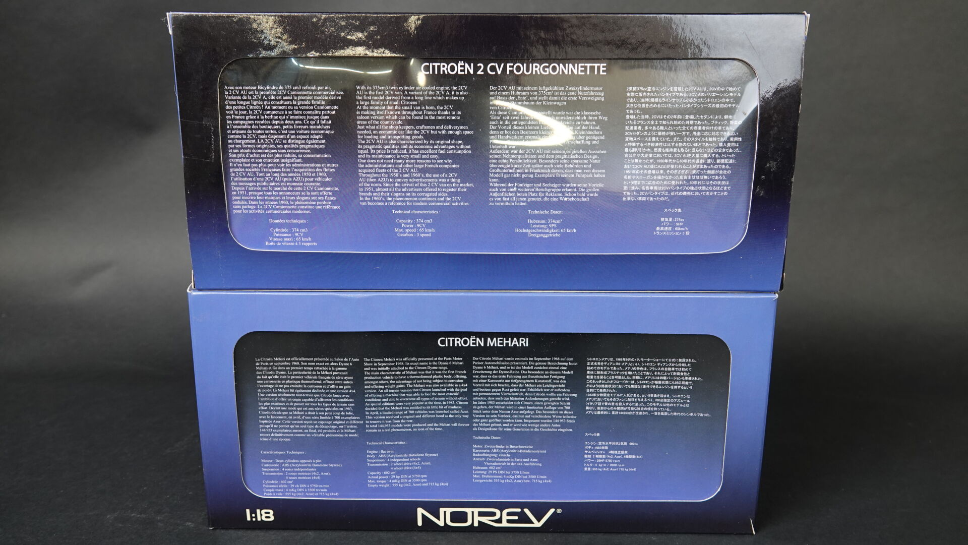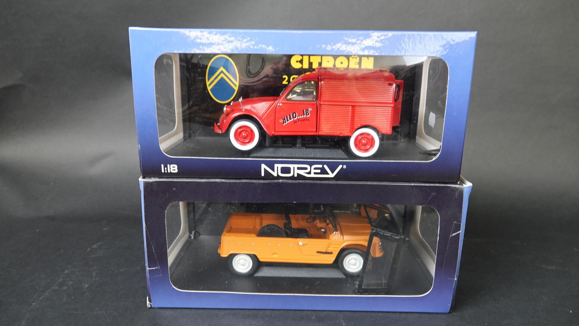 1/18ème, NOREV, lot de 2 véhicules Citroën en boites d'origines dont 2cv camionnette Pompiers Réf 181501 et une Méhari 4x2 orange, Réf 181515. Très bon état (boites légèrement défraîchies). Expertise réalisée par Monsieur Stanislas LEMOINE.