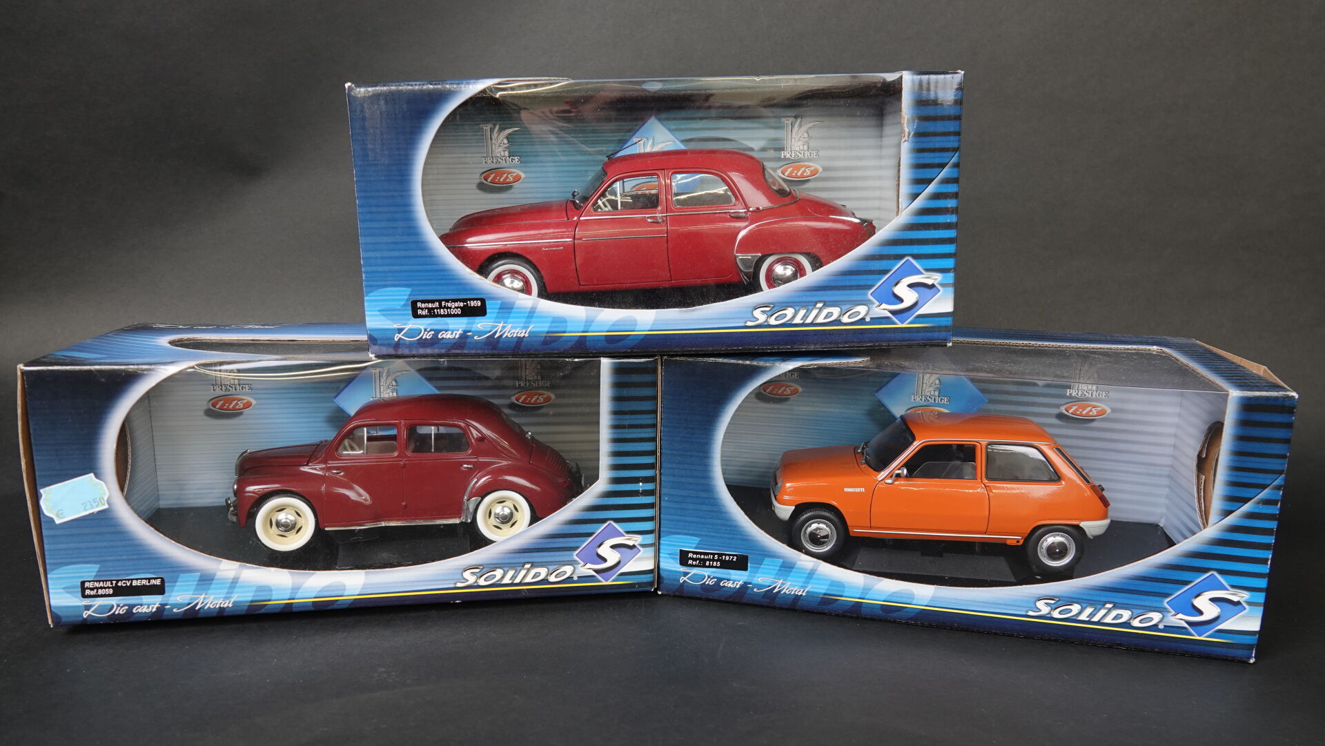 1/18ème, SOLIDO, lot de 3 véhicules RENAULT en boites d'origines dont R5 orange 1972 Réf 8185, 4 cv berline bordeaux Réf 8059 et Frégate bordeaux 1959 Réf 11831000 Très bon état (boites légèrement défraîchies). Expertise réalisée par Monsieur Stanislas LEMOINE.