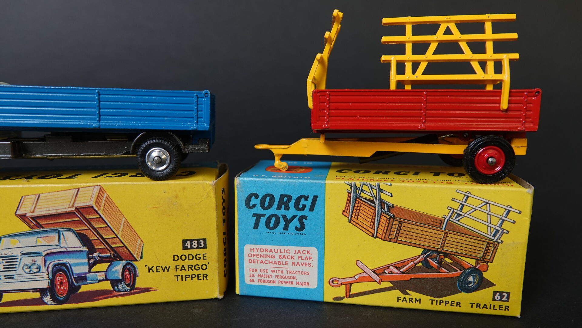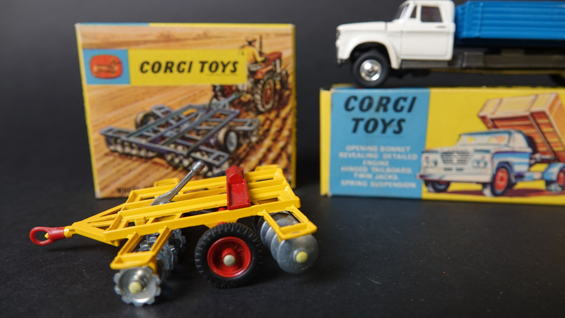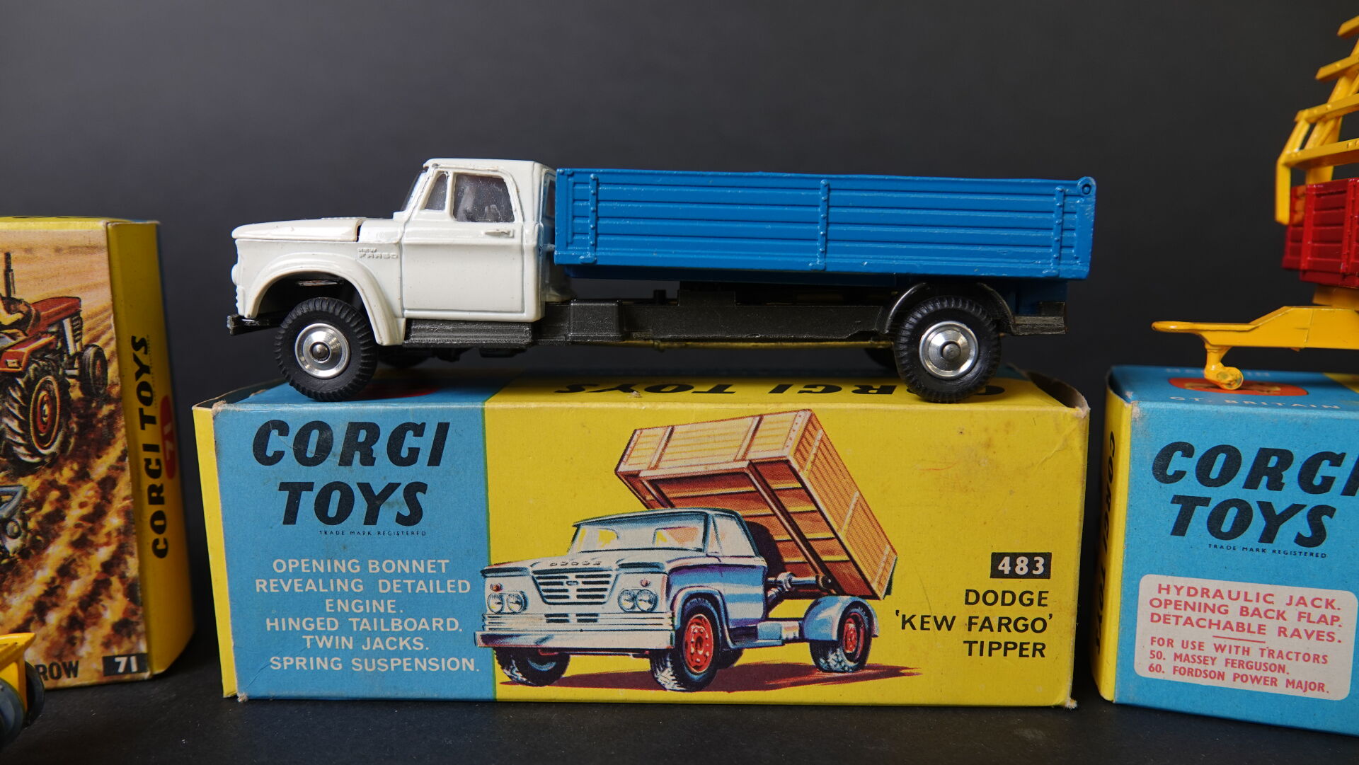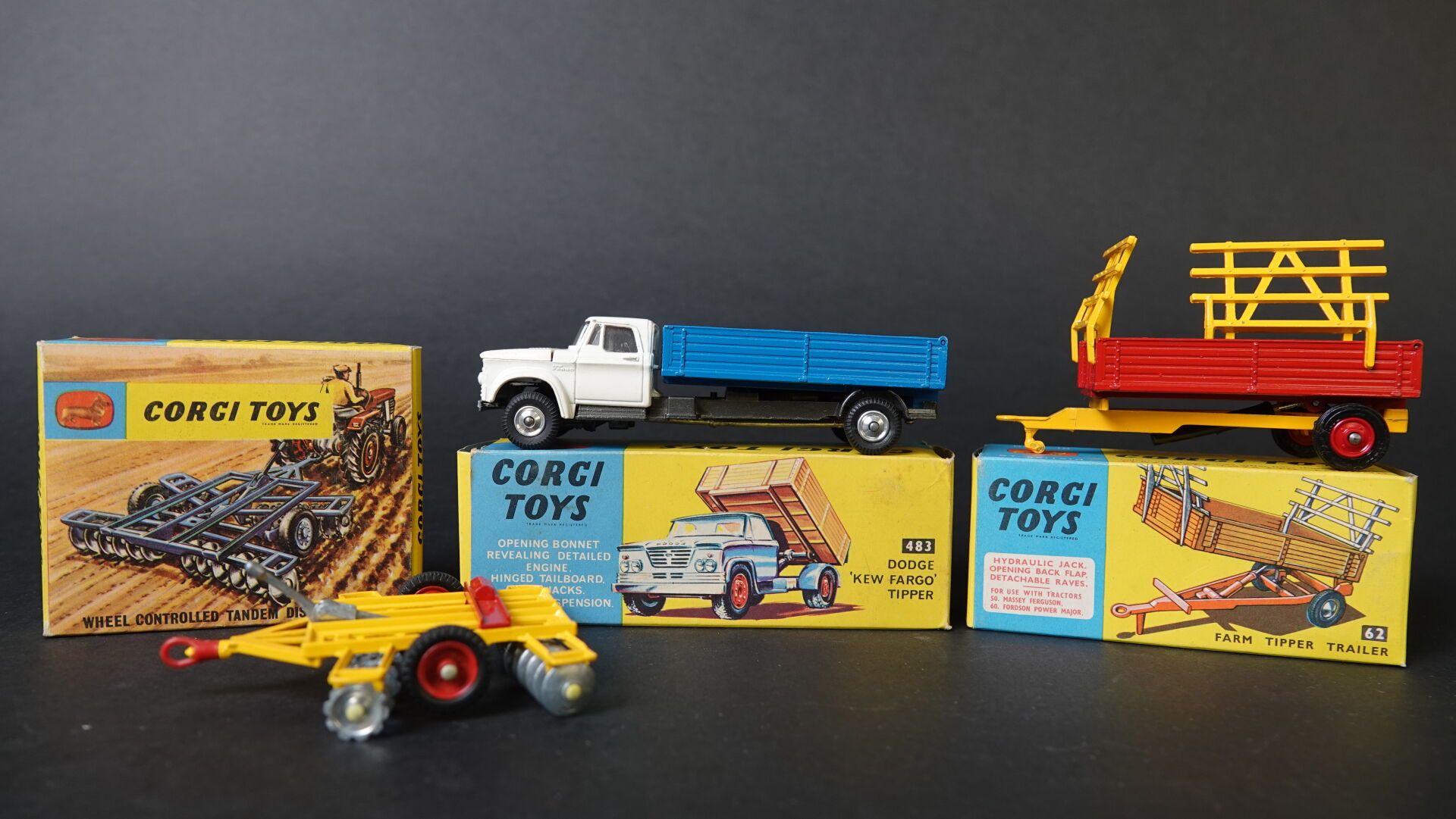 1/43ème - CORGI TOYS Lot de 3 véhicules et accessoires en boites d'origines dont Dodge Kew Cargo Tipper Réf 483, 1 x Farm Tipper trailer Réf 62 et machine à tracer des sillons ( Wheel controled tandem disc harrow) Réf 71 Très bel état en boites d'origines. Expertise réalisée par Monsieur Stanislas LEMOINE.