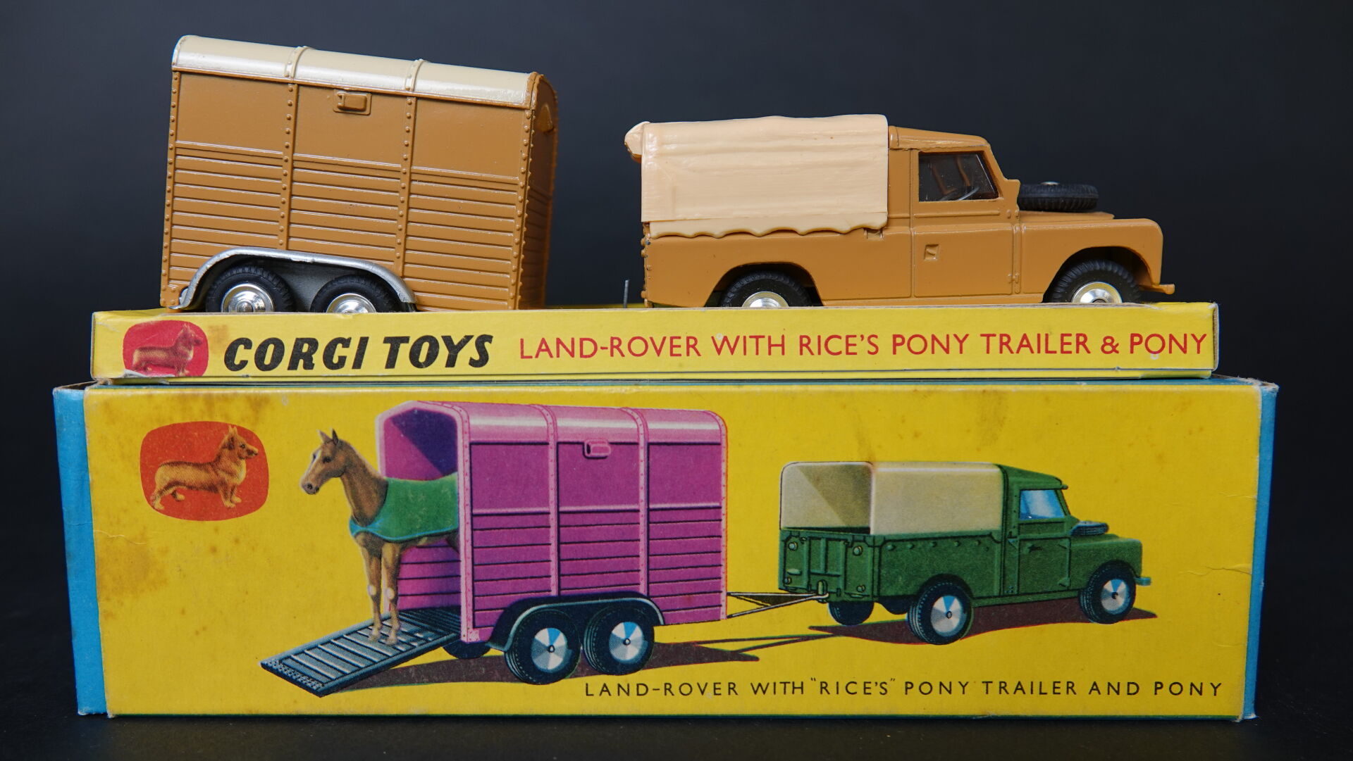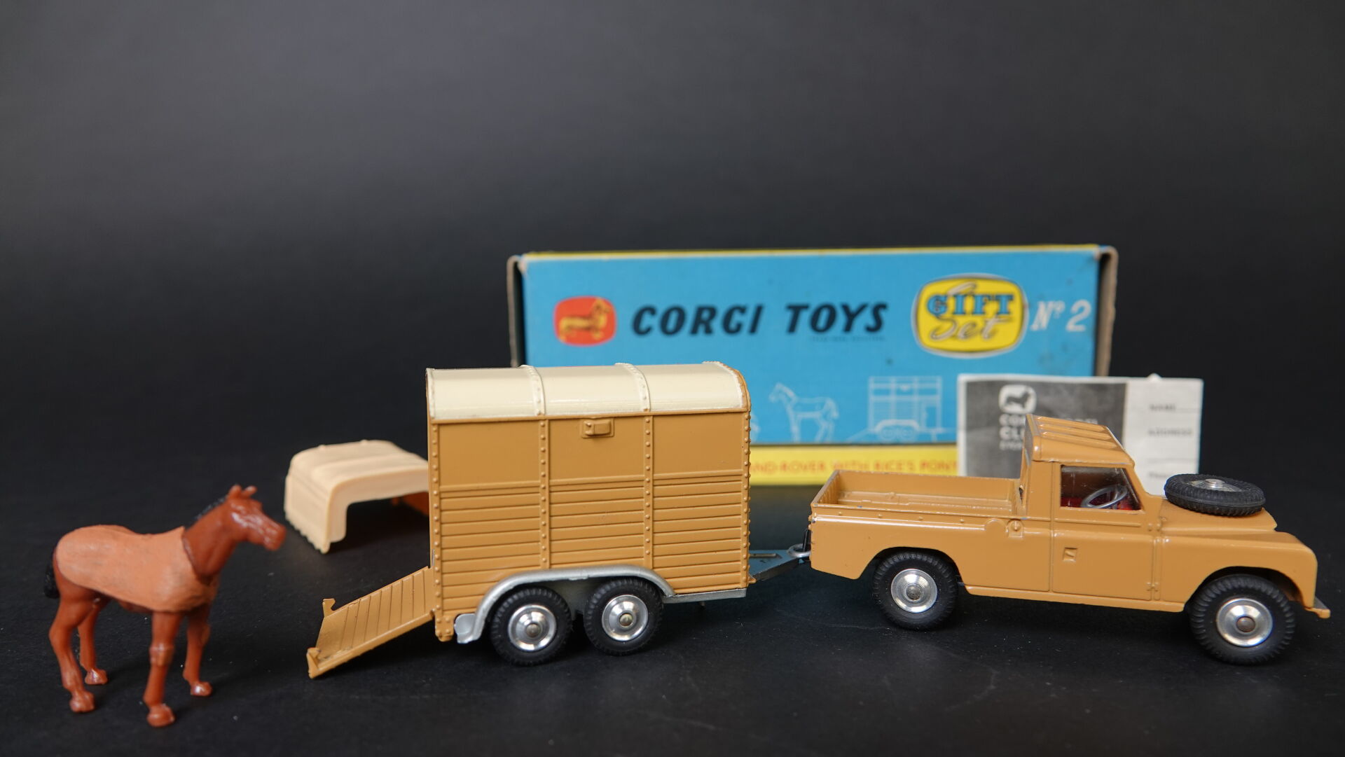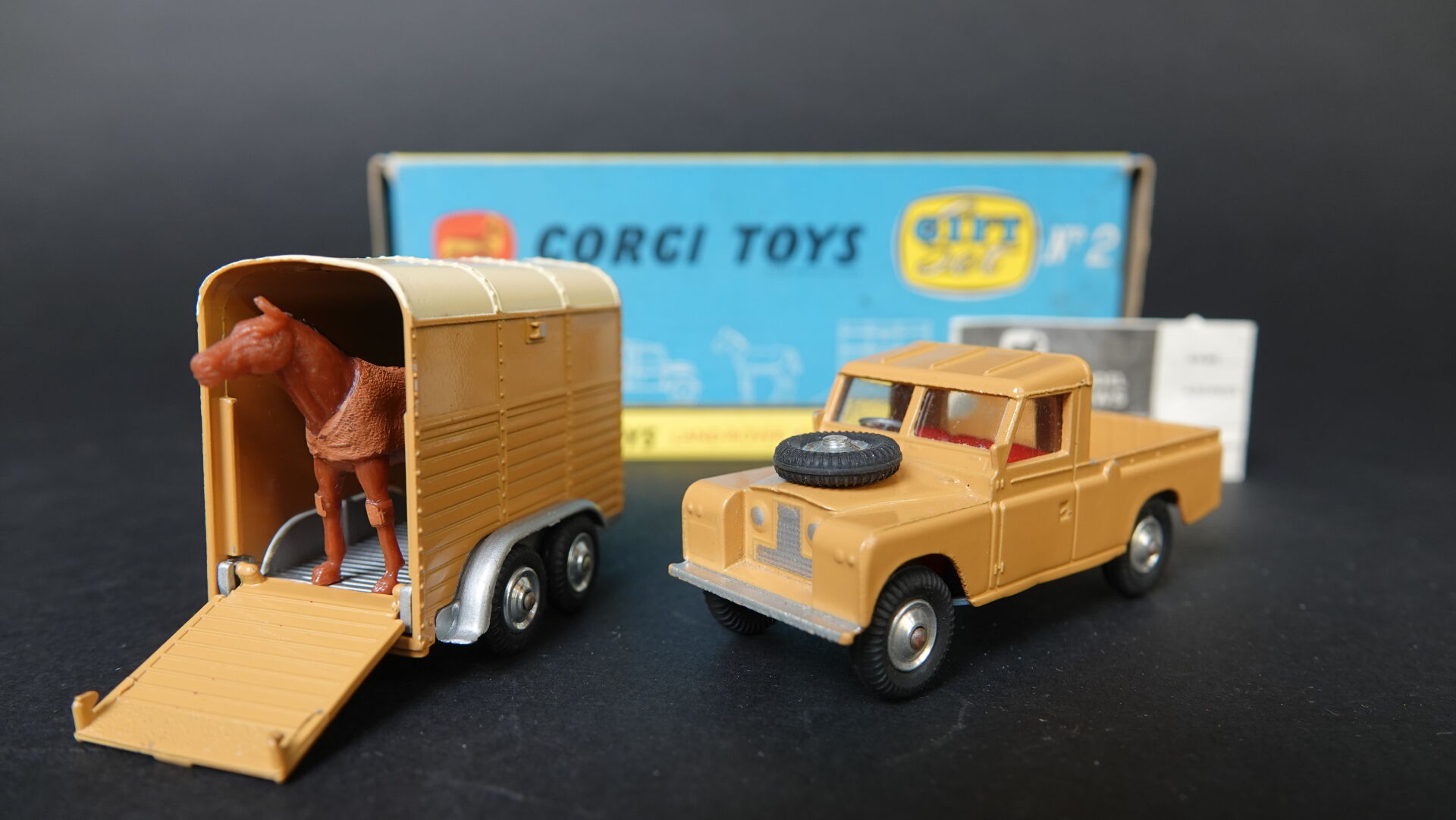 1/43ème - CORGI TOYS GIFT SET N°2 - Land Rover avec van et son poney (capote beige pour le land) sur socle de présentation et en boite d'origine Très bel état en boite d'origine proche du neuf. Expertise réalisée par Monsieur Stanislas LEMOINE.