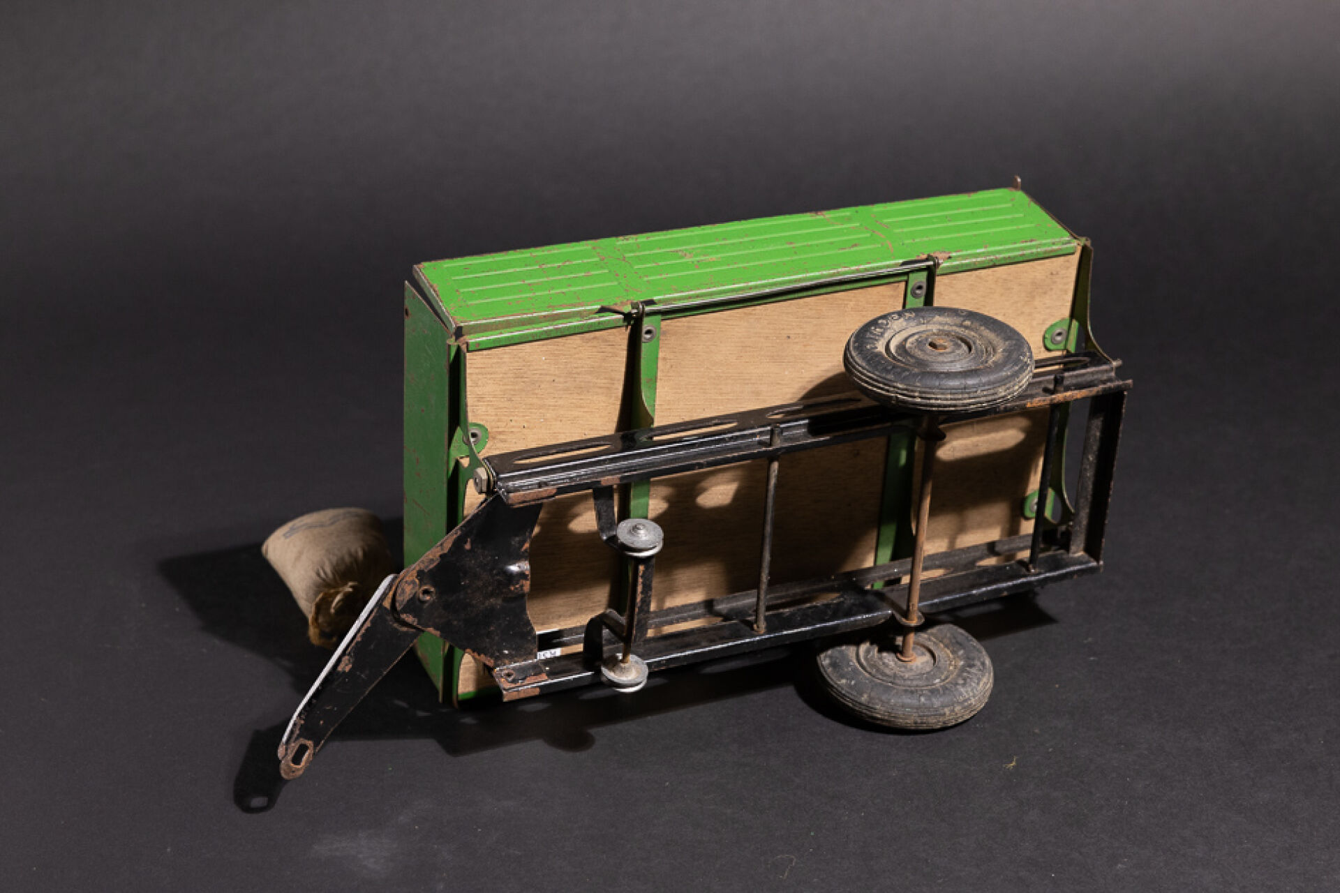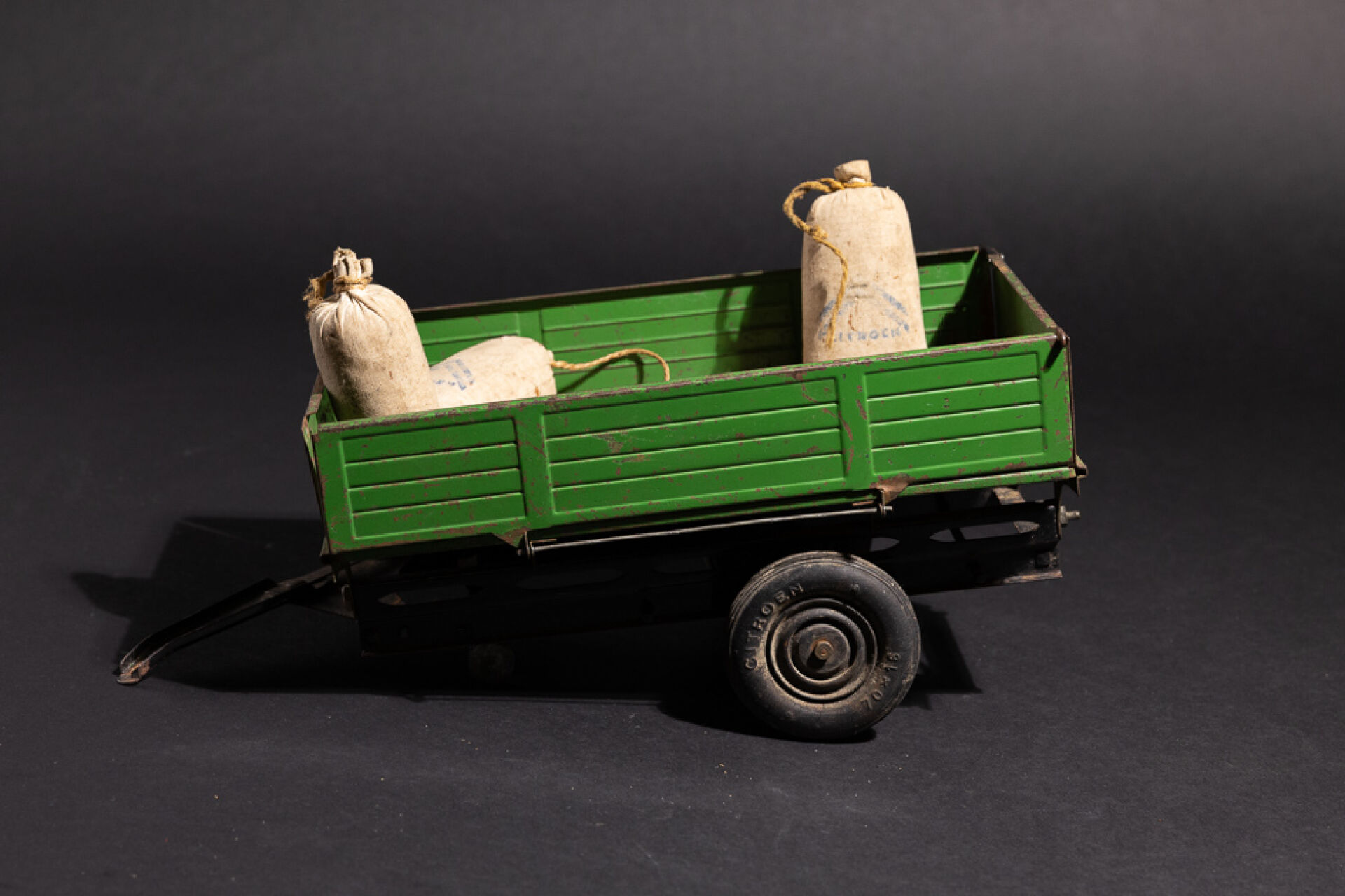 JOUET CITROEN Remorque à ridelles en métal vert marqué CITROEN, fond bois (accidents et manques). On joint : Trois petits sacs en tissu marqué CITROEN