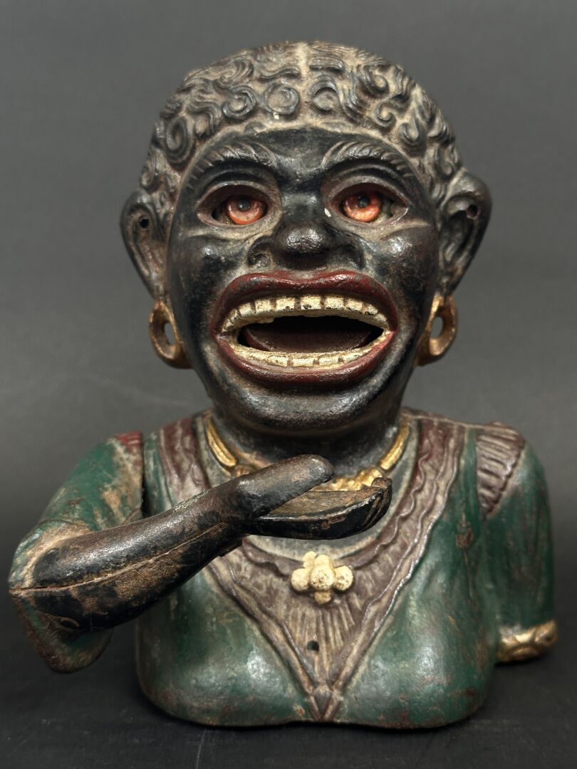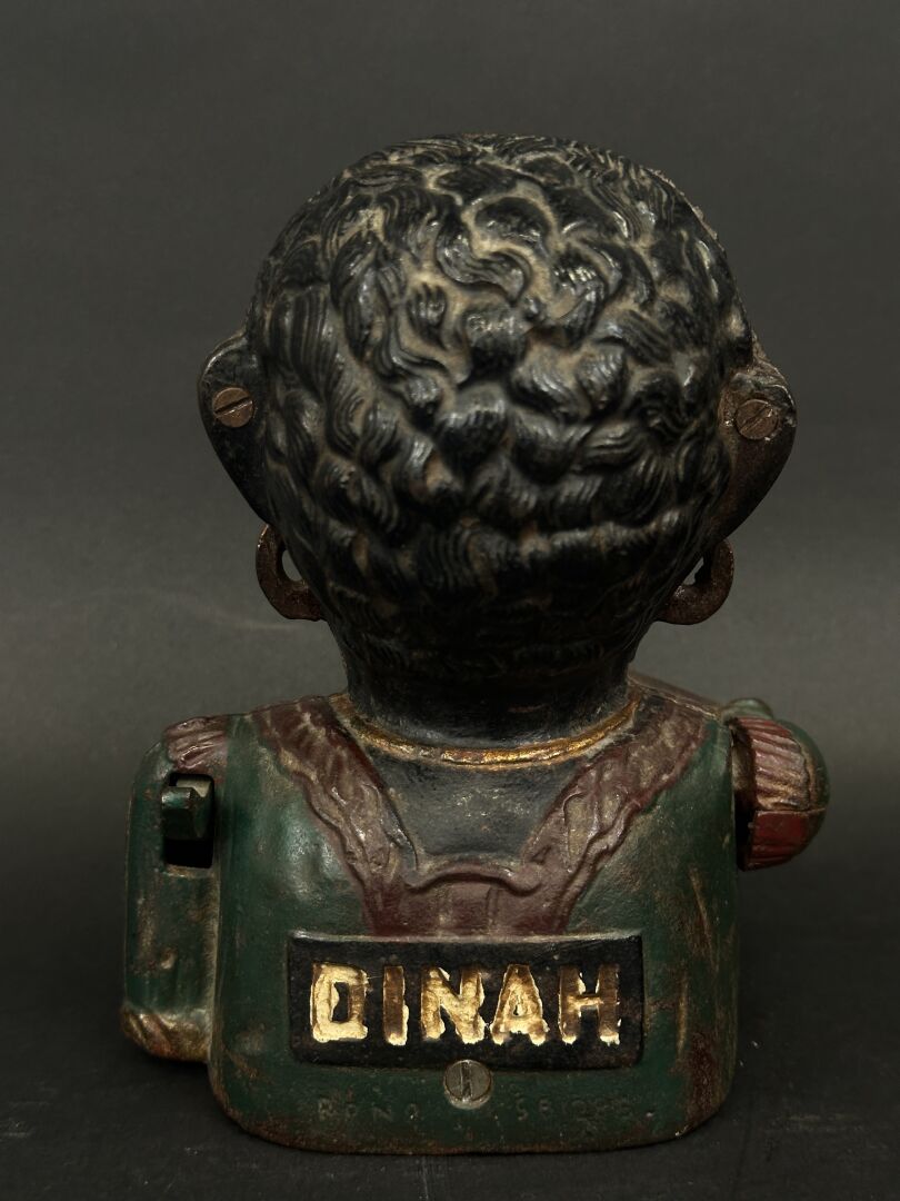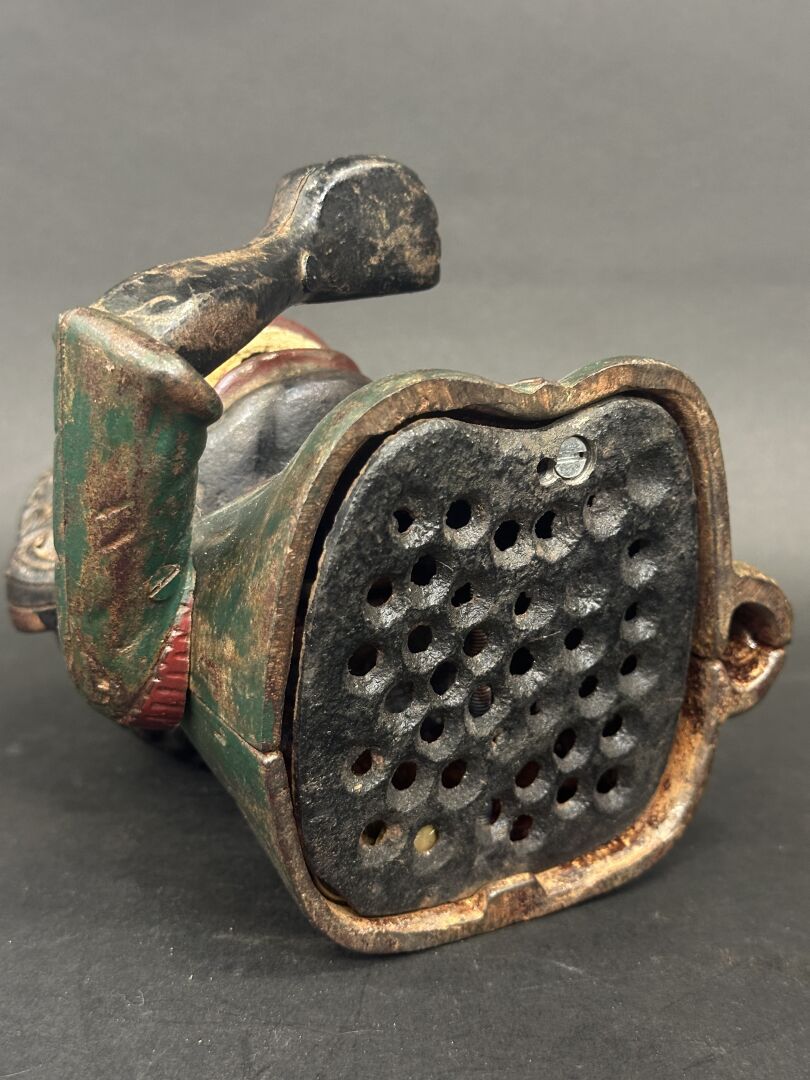 DINAH. Tirelire en fonte polychrome figurant une femme avalant des pièces, mécanisme à poussoir, marqué au dos (usures). XXe siècle. Haut. : 16 cm
