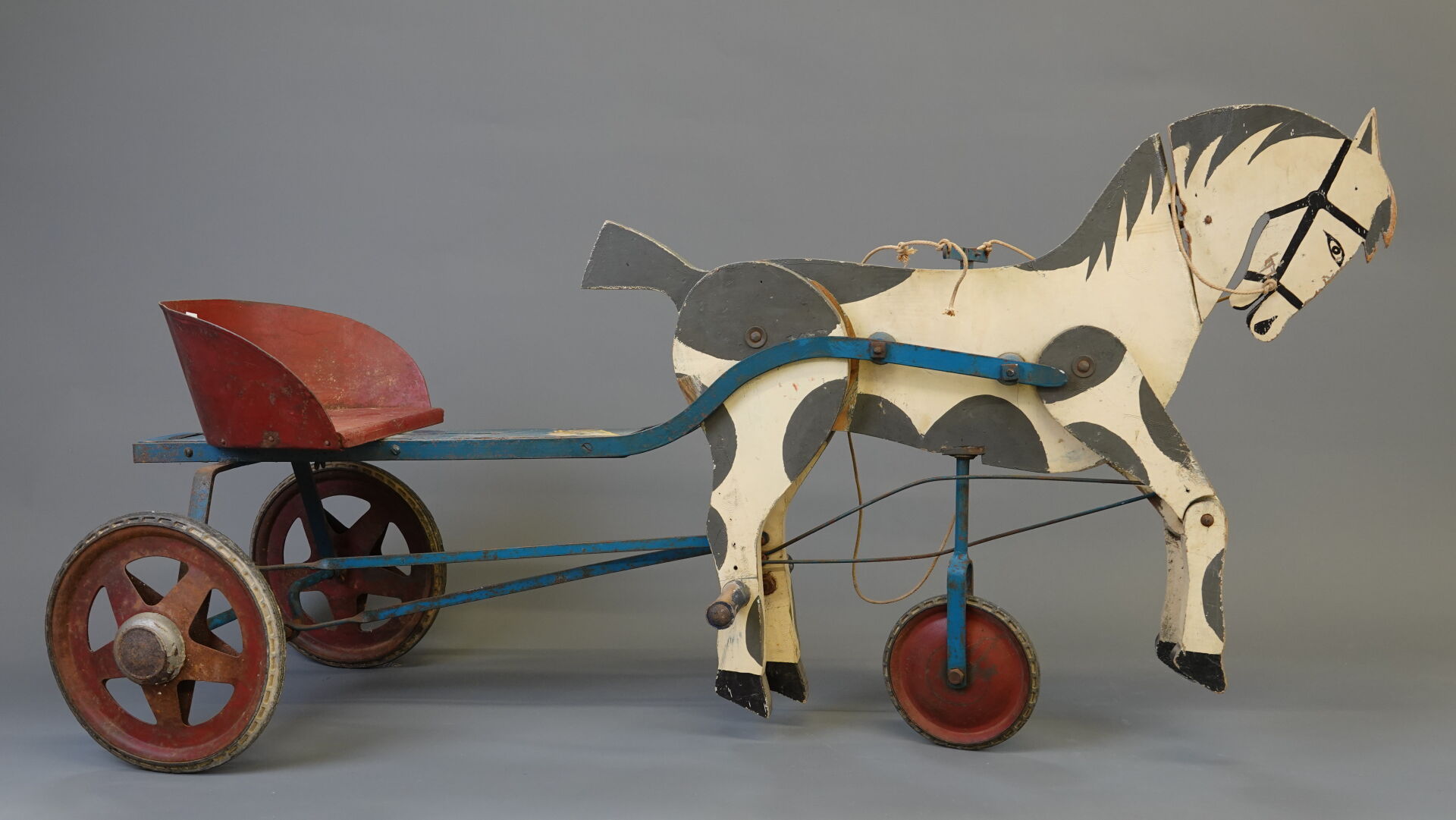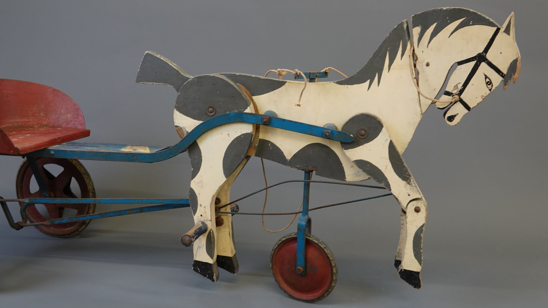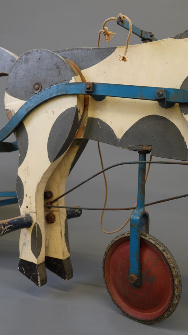 G.MURAT Jouets sportifs - Saint Étienne, France. Sulky à pédales. Jouet en bois peint et tôle, transmission par tringle avec pression sur les postérieurs du cheval. Siège réglable. Bel état grenier. Long. 120 cm. Expertise réalisée par Monsieur Stanislas LEMOINE.