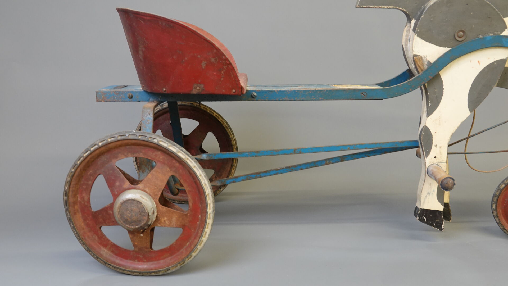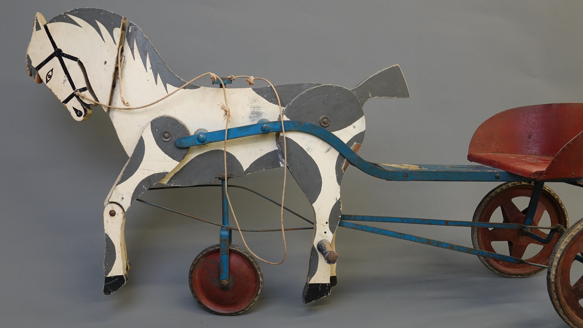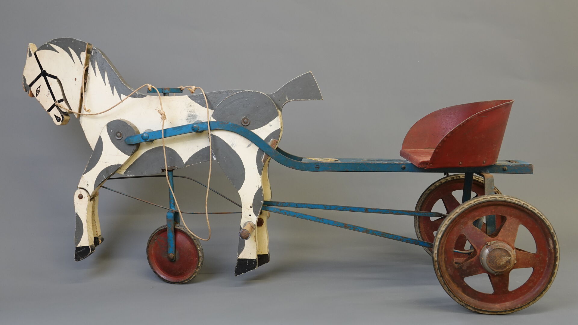 G.MURAT Jouets sportifs - Saint Étienne, France. Sulky à pédales. Jouet en bois peint et tôle, transmission par tringle avec pression sur les postérieurs du cheval. Siège réglable. Bel état grenier. Long. 120 cm. Expertise réalisée par Monsieur Stanislas LEMOINE.