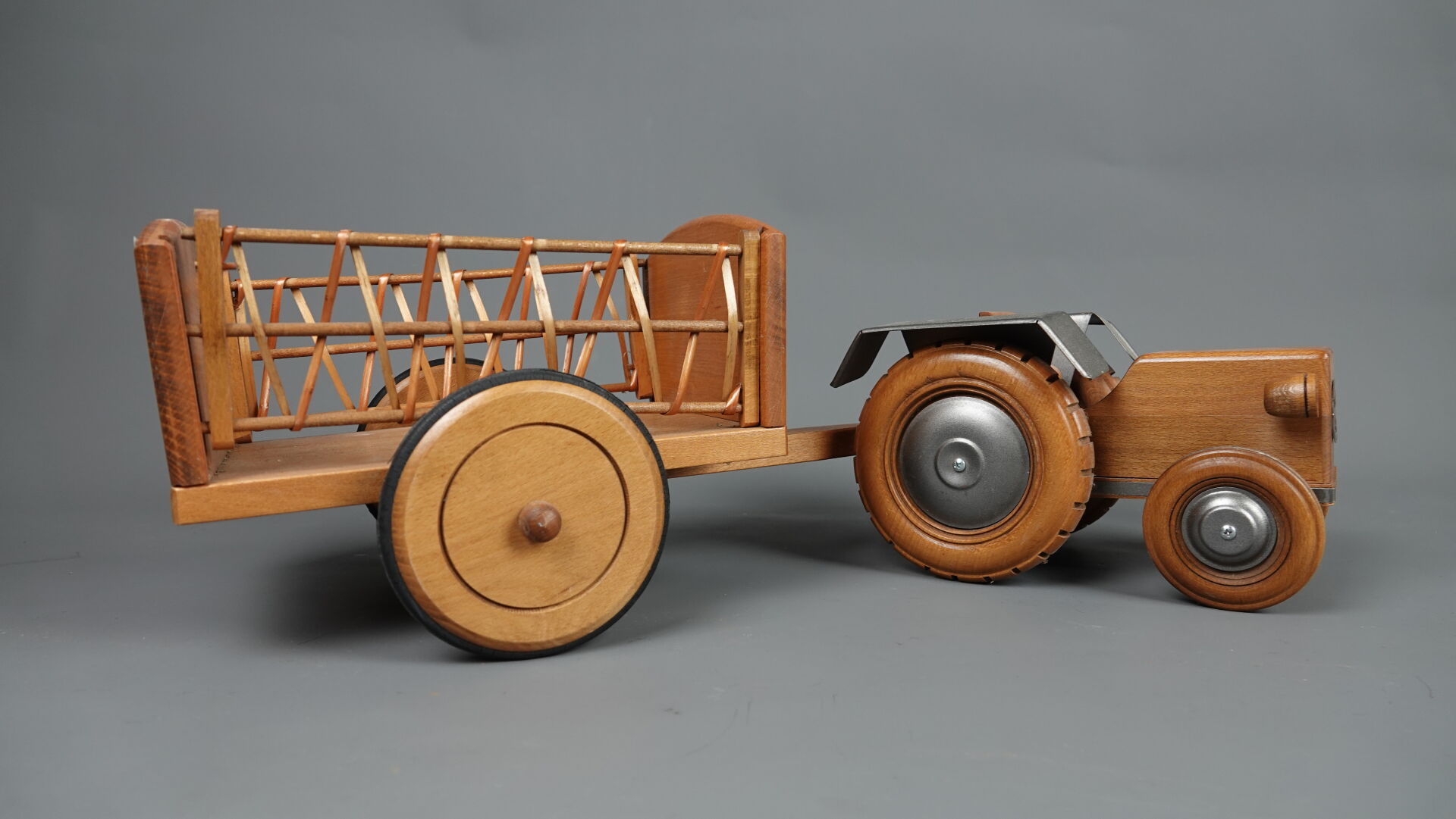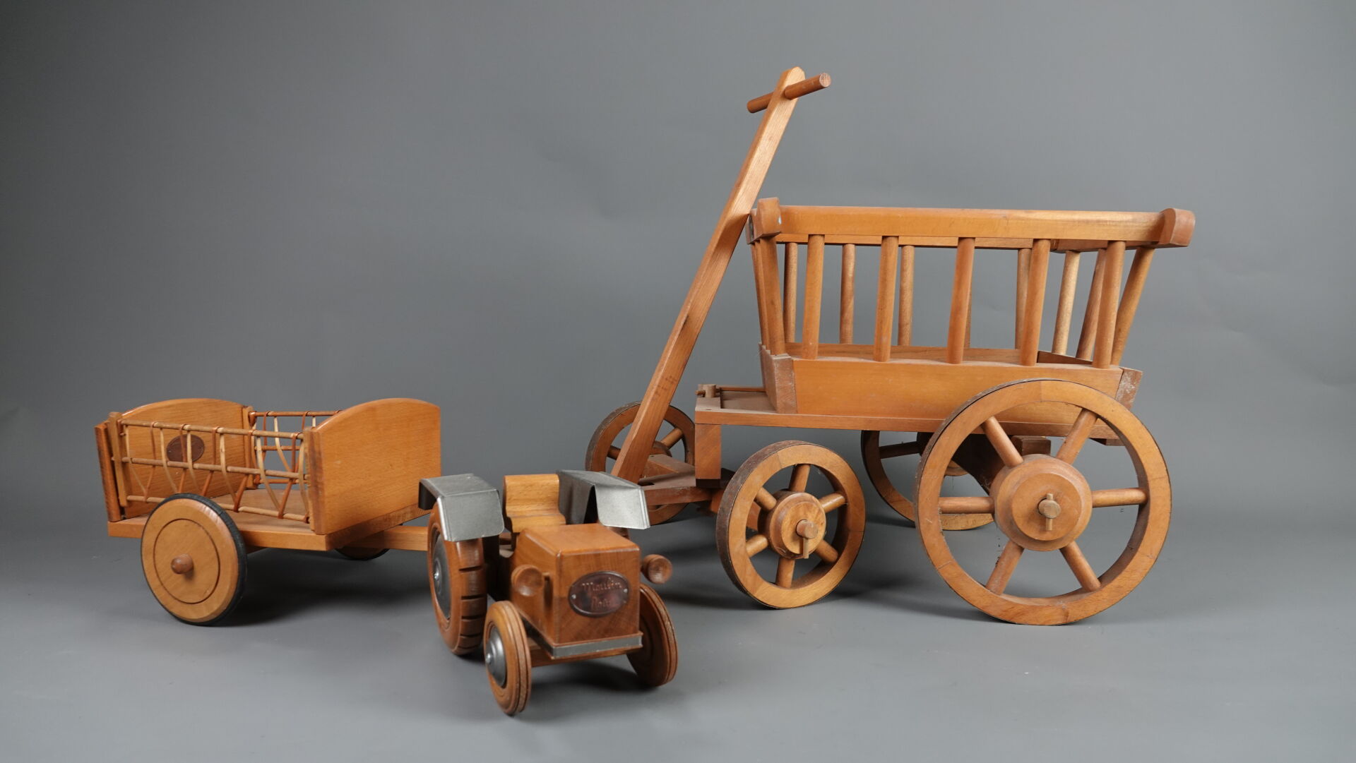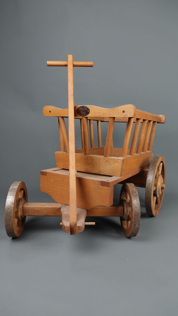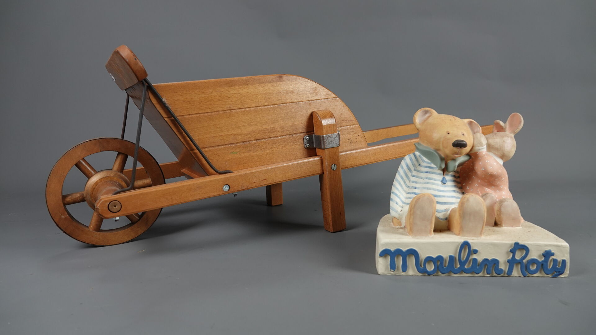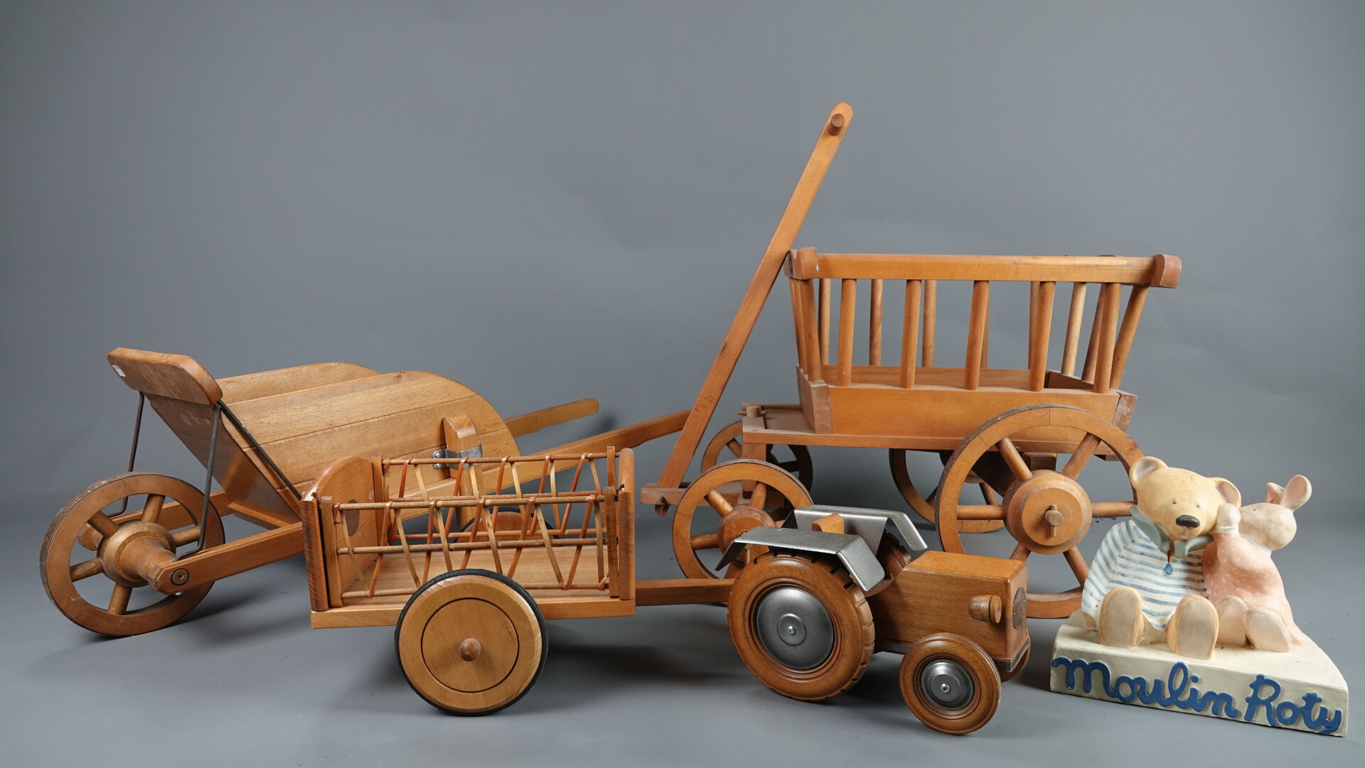 MOULIN ROTY. Réunion de trois jouets en bois et métal (état d'usage), comprenant : - brouette à mains, Haut. : 31,5 cm - Larg. : 91 cm - Prof. : 30 cm; - chariot à tirer à quatre roues, Haut. : 46 cm - Larg. : 3 cm - Prof. : 41 cm; - tracteur et sa remorque (une roue à re-fixer), Haut. : 23 cm - Larg. : 71 cm - Prof. : 28 cm. On joint : MOULIN ROTY. Elément décoratif en résine figurant un lapin murmurant à l'oreille d'un ours.