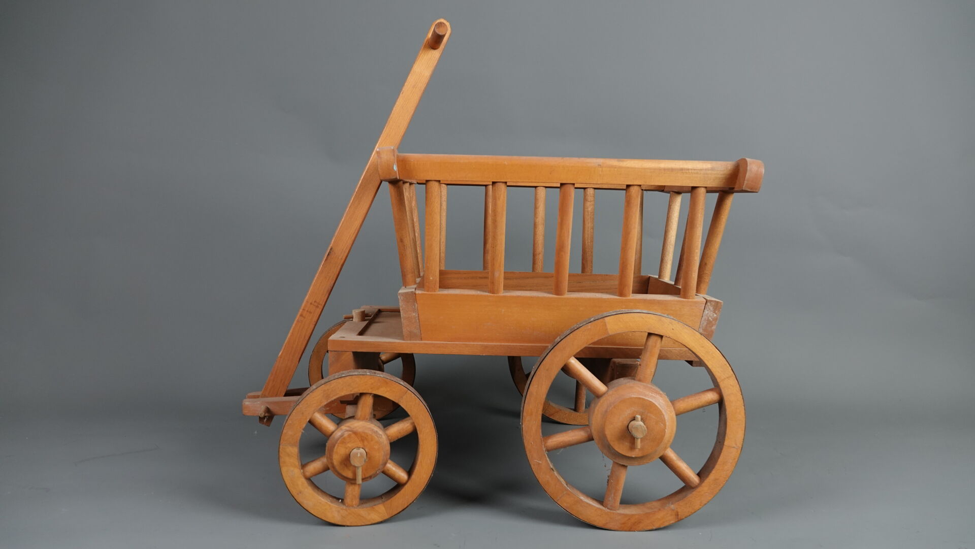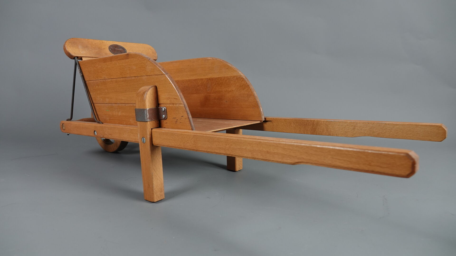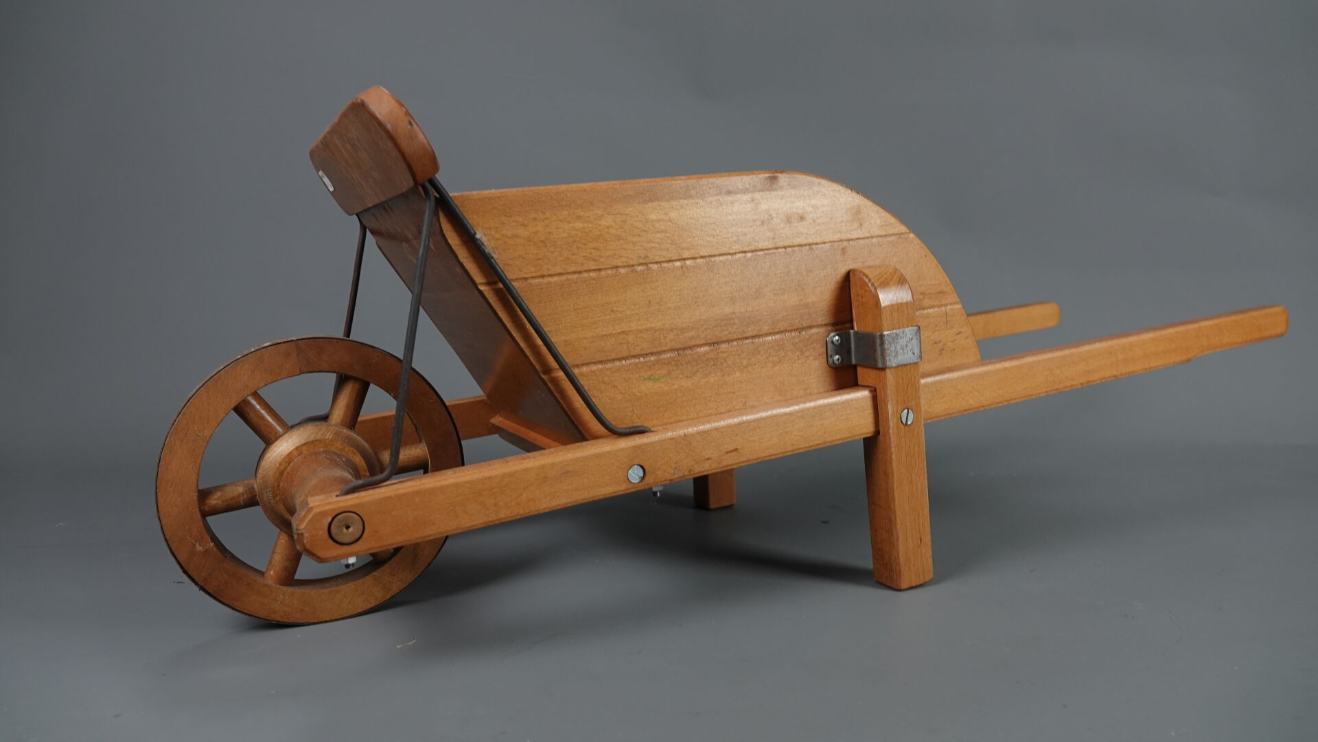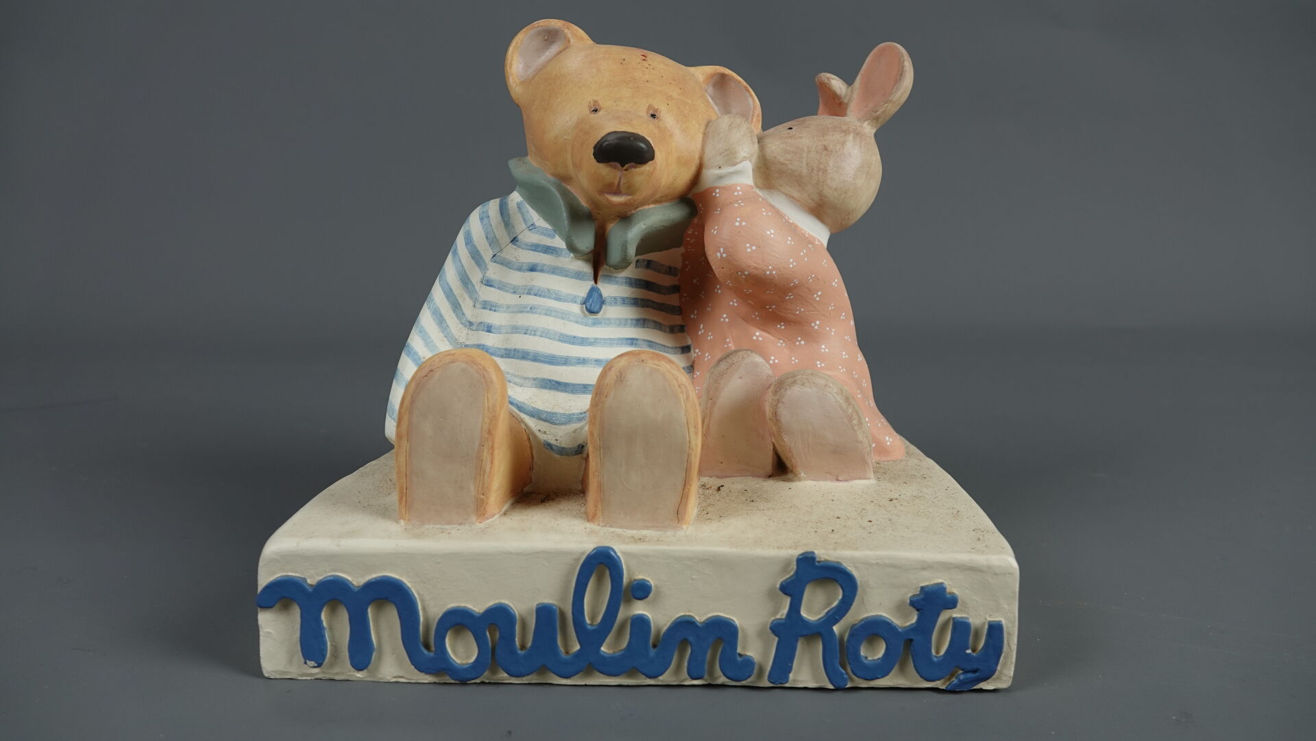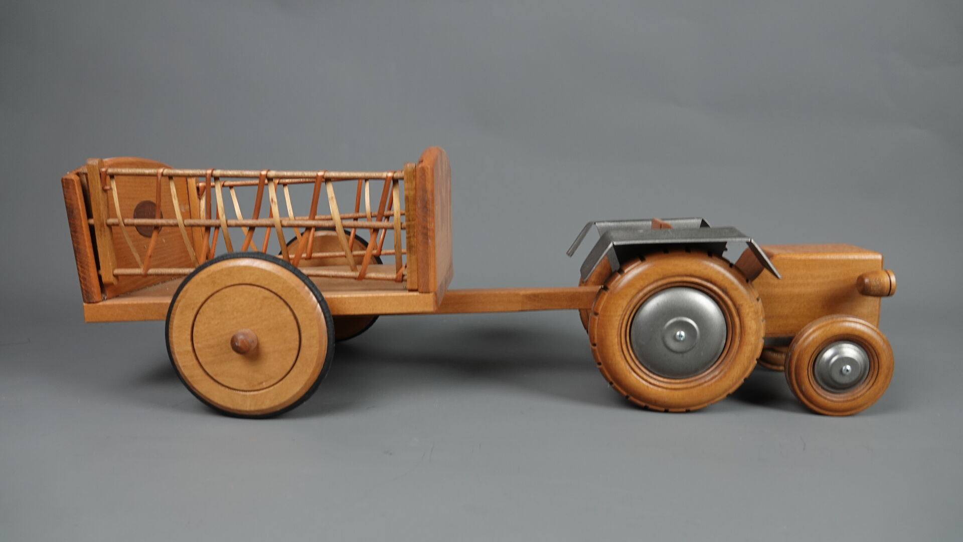 MOULIN ROTY. Réunion de trois jouets en bois et métal (état d'usage), comprenant : - brouette à mains, Haut. : 31,5 cm - Larg. : 91 cm - Prof. : 30 cm; - chariot à tirer à quatre roues, Haut. : 46 cm - Larg. : 3 cm - Prof. : 41 cm; - tracteur et sa remorque (une roue à re-fixer), Haut. : 23 cm - Larg. : 71 cm - Prof. : 28 cm. On joint : MOULIN ROTY. Elément décoratif en résine figurant un lapin murmurant à l'oreille d'un ours.