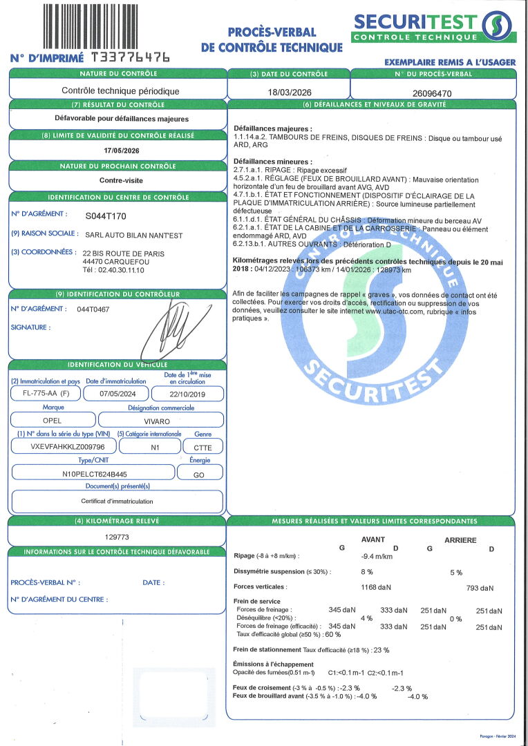 BVM6- CLIM- RADIO- GPS- VITRES ET RETROS ELECT- REGULATEUR DE VITESSES- CAMERA DE RECUL- CAISSE BOIS AVEC RGT- BARRES DE TOIT- ATTELAGE REMORQUE MIXTE DEMONTE. SIEGES EN TISSU TACHES. COTE G RAYE- LEEGR ENFONCEMENT SUR LA PORTE AR- FROTTEMENTS ET ENFONCEMENTS COTE D. DEFAILLANCE MAJEURE: DISQUE OU TAMBOURS DE FREINS ARD ET ARG USES. DEFAILLANCES MINEURES: RIPAGE EXCESSIF- MAUVAISE ORIENTATION DES FEUX DE BROUILLARD AVG ET AVD- DEFAUT D'ECLAIRAGE DE LA PLAQUE D'IMMAT AR- DEFORMATION MINEURE DU BERCEAU AV- CARROSSERIE AVD ET ARD ENDOMMAGEE- DETERIORATION OUVRANT D FRAIS JUDICIAIRES/: 11.9 % HT.