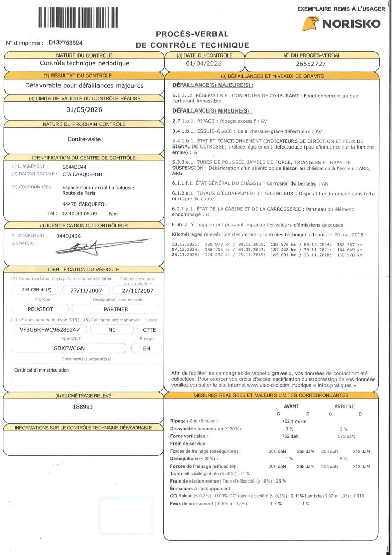 BVM5- RADIO- CAISSE BOIS AVEC RGT. SIEGES EN TISSU TACHES- SIEGE CONDUCTEUR DECHIRE. FROTTEMENTS COTE G ET D- ENFONCEMENTS AR- TRACES DE CORROSION- PUB ADH. DEFAILLANCE MAJEURE: FONCTIONNEMENT AU GAZ CARBURANT IMPOSSIBLE. DEFAILLANCES MINEURES: RIPAGE EXCESSIF- BALAI D'ESSUIE GLACE AV DEFECTUEUX- GLACE DEFCTUEUSE DU CLIGNOTANT G- DETERIORATION D'UN SILENBLOC DE LIAISON AU CHASSIS OU A L'ESSIEU ARD ET ARG- CORROSION DU BERCEAU AR- DISPOSITIF DU SILENCIEUX OU TUYAU D'ECHAPPEMENT ENDOMMAGE- CARROSSERIE D ENDOMMAGEE. FRAIS VOLONTAIRES: 20% HT.