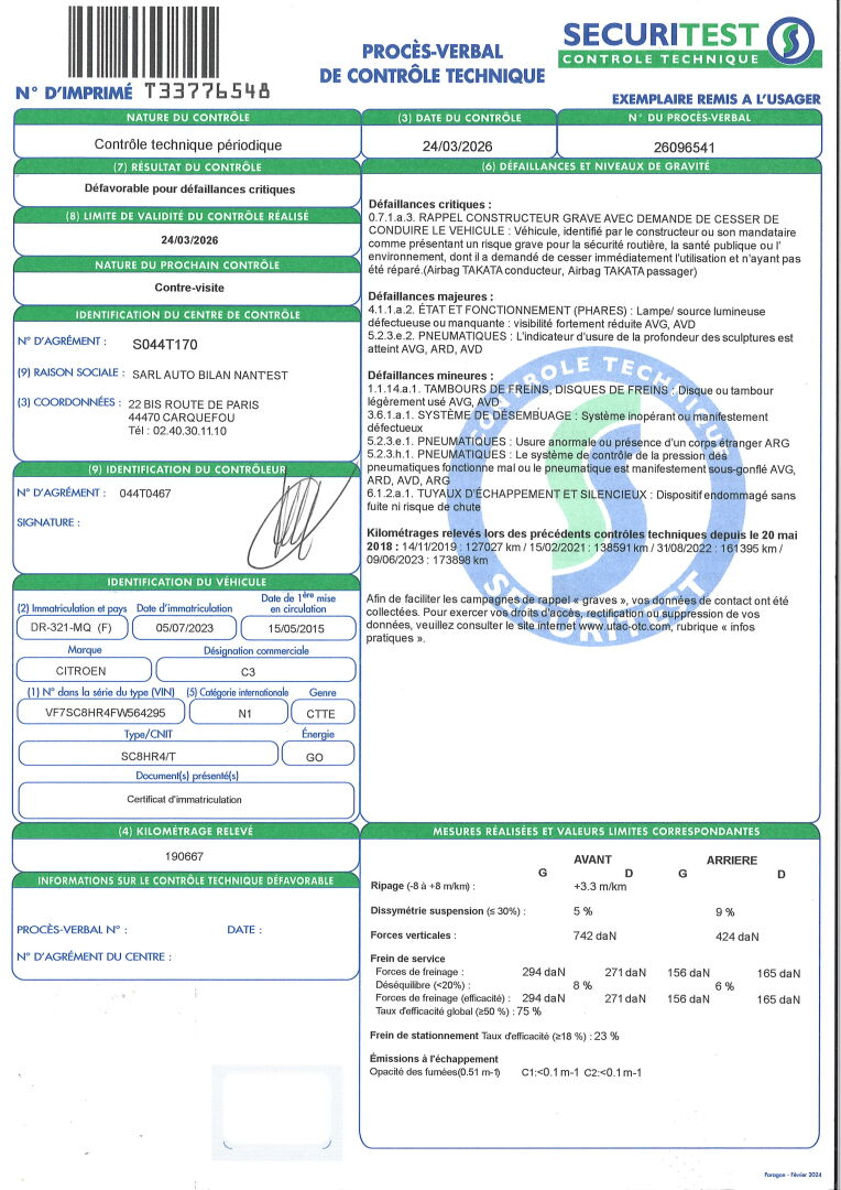 VEHICULE A ENLEVER SUR PLATEAU: DEFAILLANCE CRITIQUE: VEHICULE CONCERNE PAR LE RAPPEL DES AIR BAG TAKATA. BVM5- CLIM- RADIO- VITRES ET RETROS ELECT- REGULATEUR DE VITESSES- RADAR DE RECUL. SIEGES EN TISSU TACHES- PLASTIQUES RAYES. PARE CHOCS AV DEBOITE- RAYURES D'USAGE- FROTTEMENTS SUR LA PORTE AVG ET LA PORTE ARG. DEFAILLANCES MAJEURES: VISIBILIRTE FORTEMENT REDUITE DES FEUX AVG ET AVD- PNEU AVG, ARD ET ET AVD USES. DEFAILLANCES MINEURES: DISQUE OU TAMBOUR DE FREIN AVG ET AVD LEGEREMENT USES- SYSTEME DE DESAMBUAGE INOPERANT OU DEFECTUEUX- USURE ANORMALE DU PNEU ARG- 4 PNEUS SOUS GONFLES- DISPOSITIF ENDOMMAGE DU TUYAU D'ECHAPPEMENT ET SILENCIEUX FRAIS JUDICIAIRES: 11.9% HT.