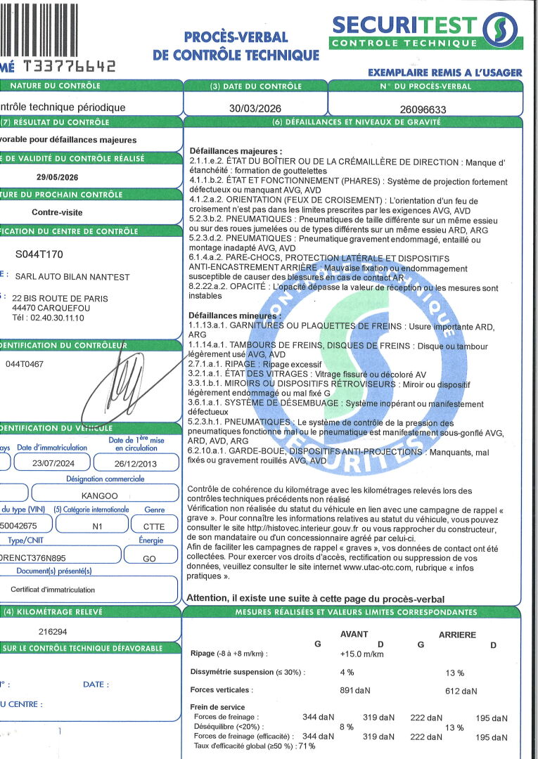BVM5- RADIO- VITRES ET RETROS ELECT- CAISSE BOIS AVEC RGT. PLASTIQUES RAYES ET TACHES. ANCIENNES MARQUES DE PUD ADH- PARE BRISE FISSURE- FROTTEMENTS SUR LE PARE CHOCS AV ET LE RETRO G- AILE AVG CASSEE- ENFONCEMENTS COTE D. DEFAILLANCES MAJEURES: MANQUE D'ETANCHEITE DU BOITIER OU DE LA CREMAILLERE DE DIRECTION- DEFAUT D'ECLAIRAGE AVG ET AVD- PNEU DE TAILLE DIFFERENTES SUR UN MEME ESSIEU ARD ET ARG- PNEU AVG ET AVD GRAVEMENT ENDOMMAGE- MAUVAISE FIXATION DU PARE CHOCS AR- DEFAUT D'OPACITE. DEFAILLANCES MINEURES: USURES IMPORTANTE DES GARNITURES OU PLAQUETTE DEVFREINS ARD ET ARG- DISQUES OU TAMBOURS DE FREINS AVG ET AVD LEGEREMENT USES- RIPAGE EXCESSIF- VITRE AV FISSUREE- MIROIR DU RETRO G ENDOMMAGE- SYSTEME DE DESEMBUAGE INOPERANT- 4 PNEUS SOUS GONFLES.
